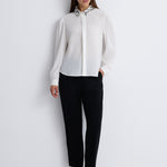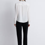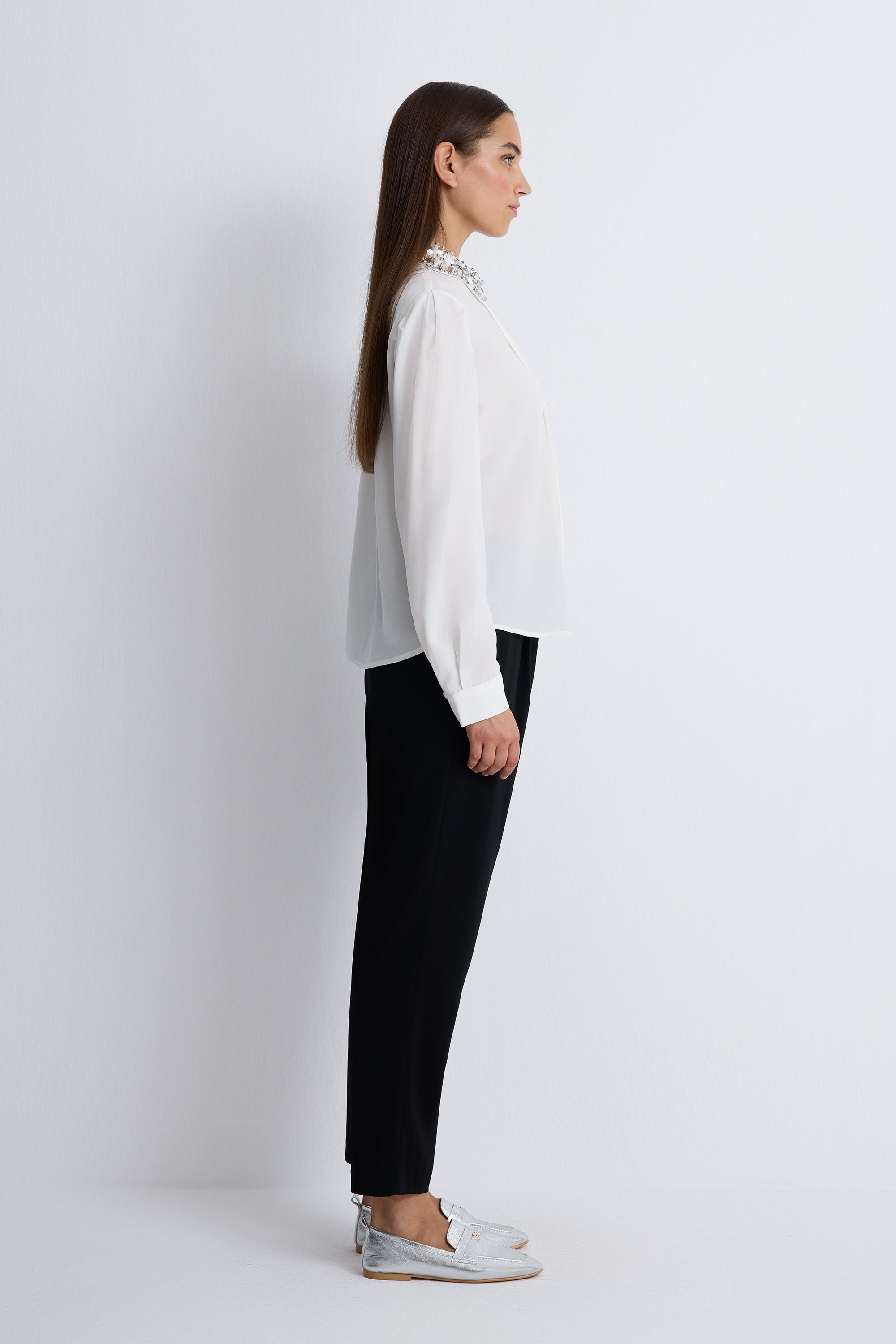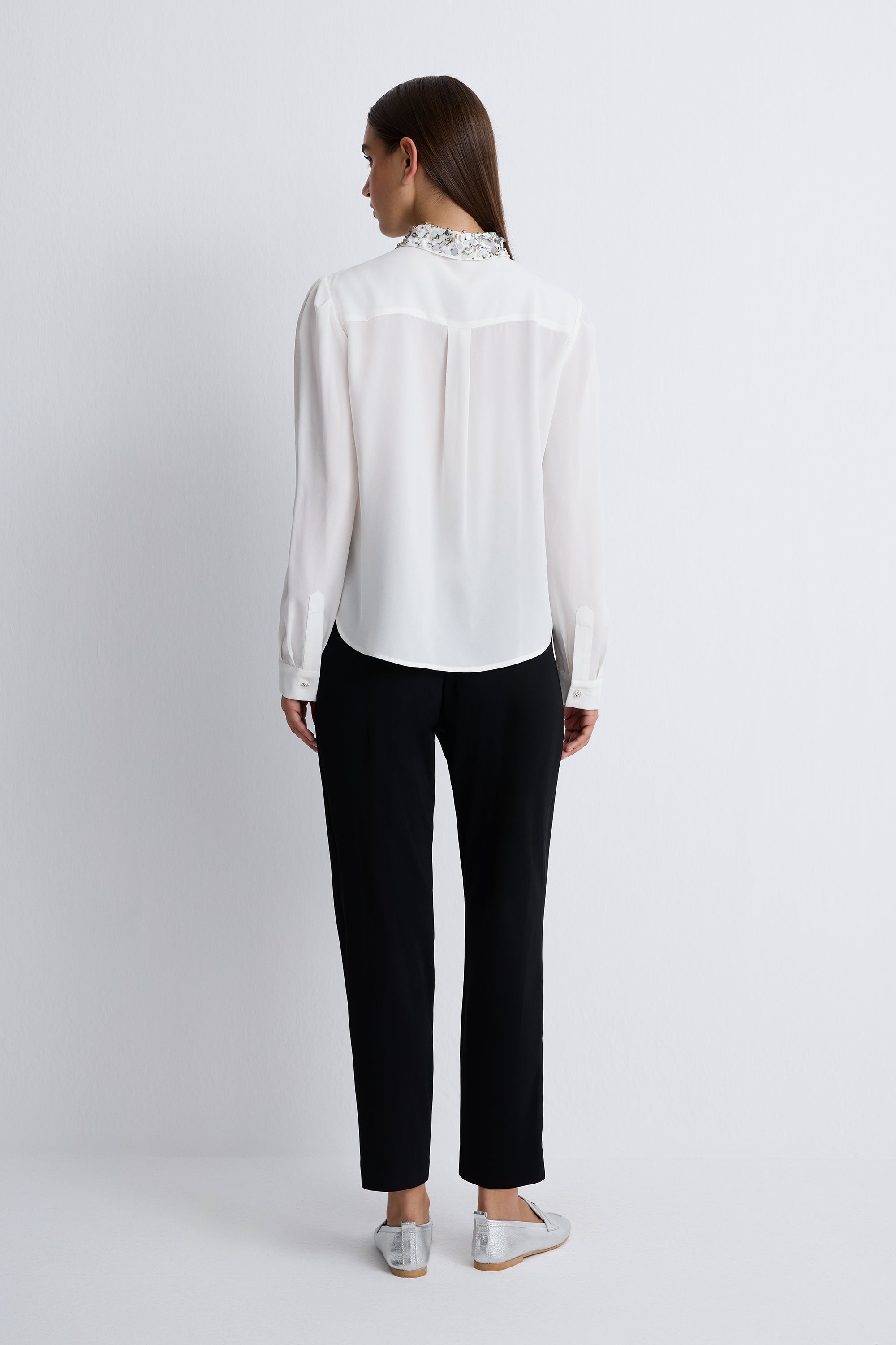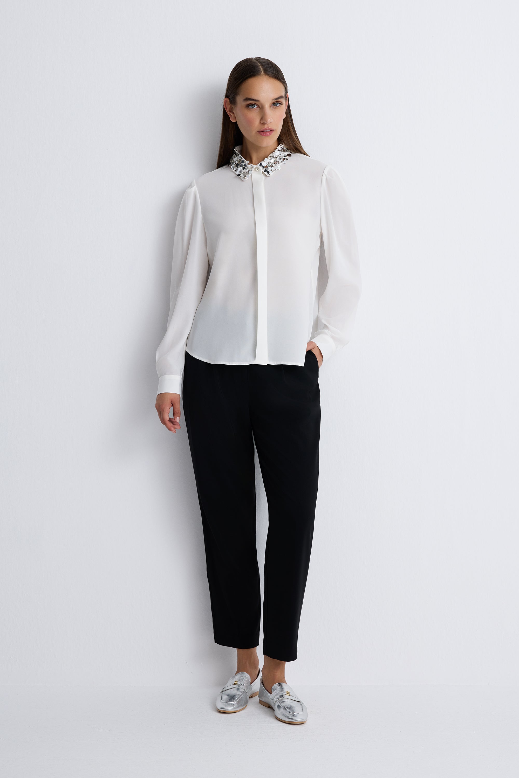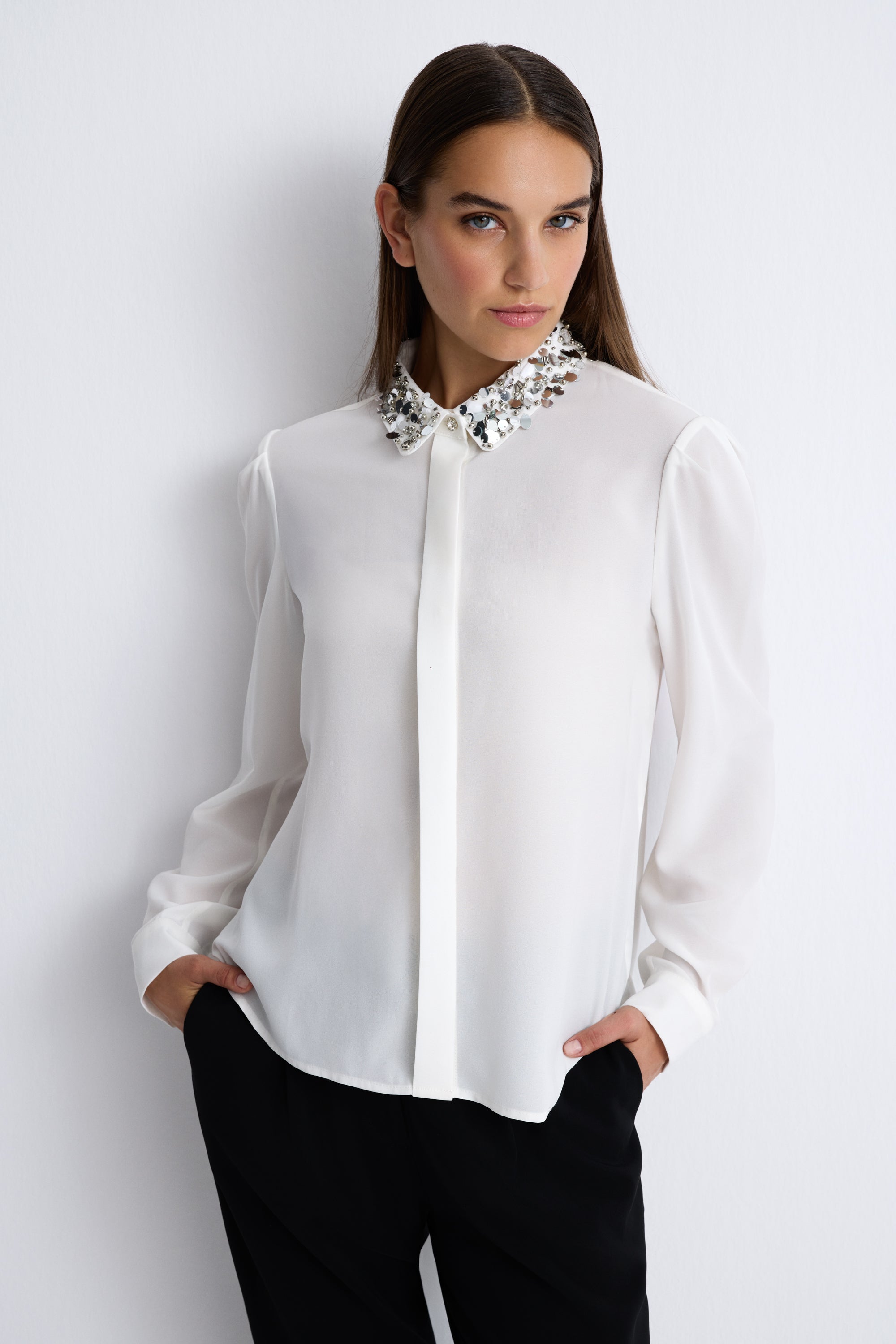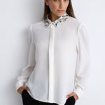 ارتقِ بإطلالتك مع هذا القميص الحريري الأنيق، المصمم بقصة انسيابية تعكس الرقي والكلاسيكية . تبرز ياقة القميص المزينة بالكريستال كعنصر لافت يضيف لمسة من البريق والتميز على التصميم البسيط والراقي. قطعة مثالية لإطلالة مسائية فاخرة أو لإضافة لمسة أنيقة وعصرية إلى أزياء المكتب