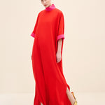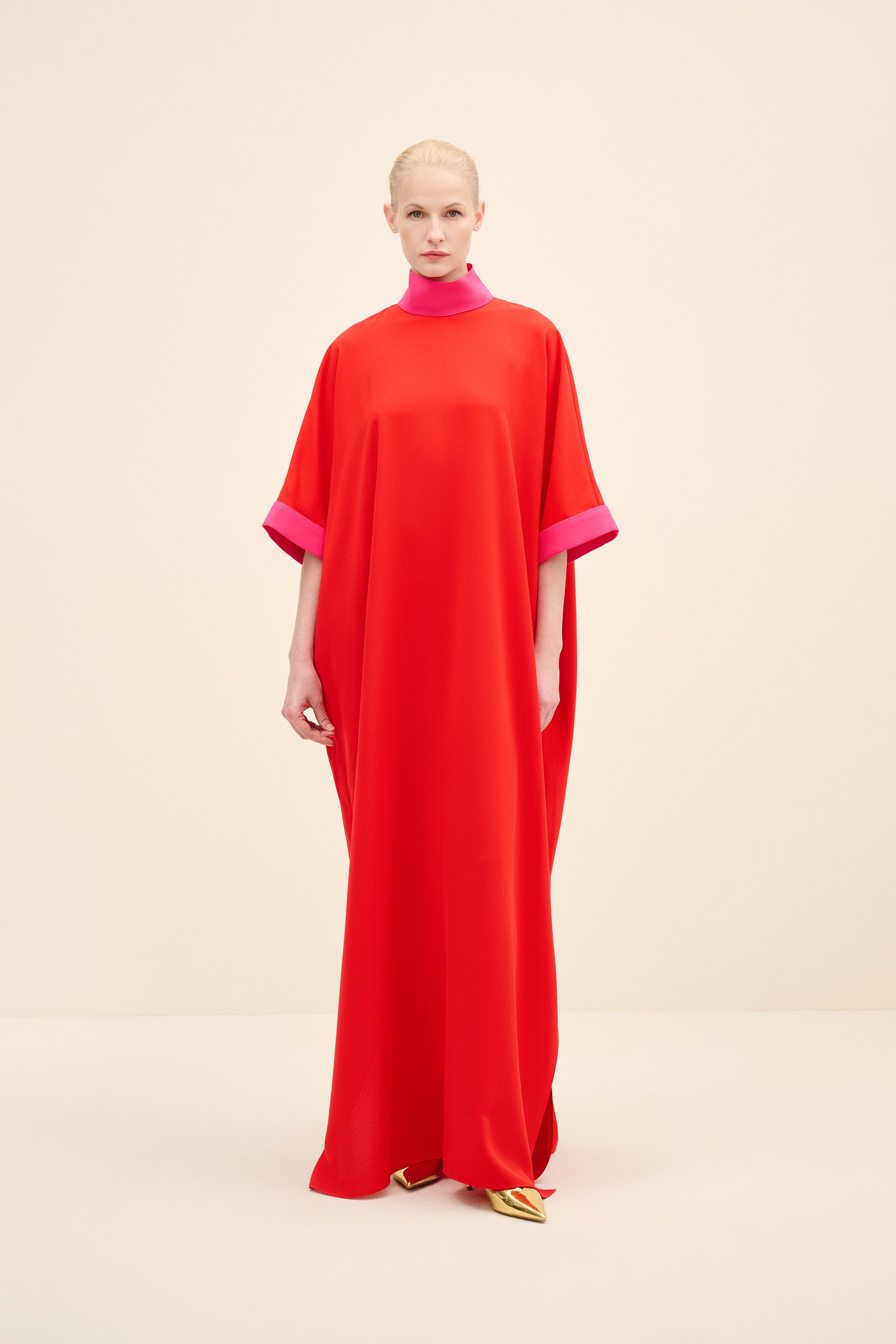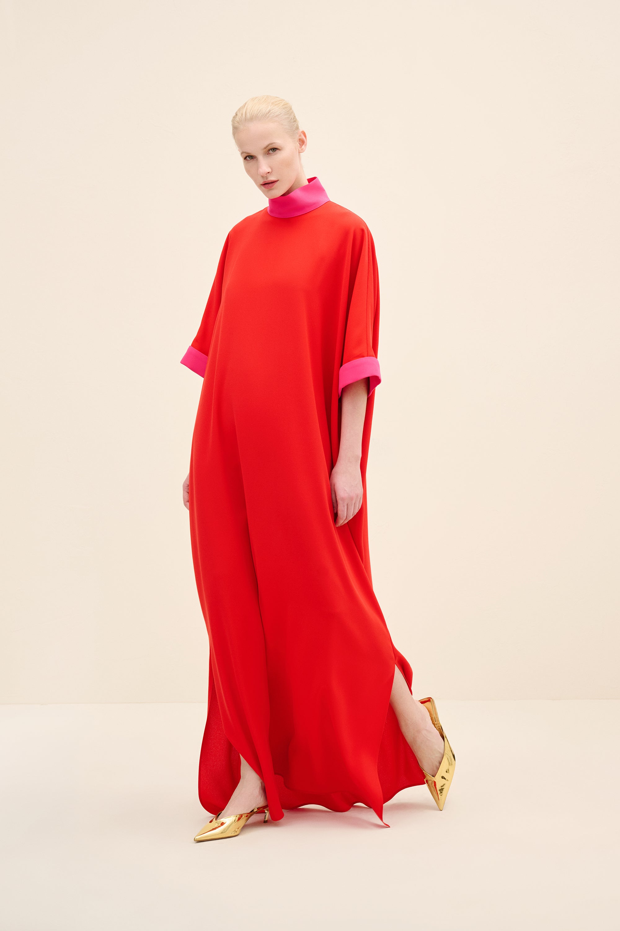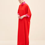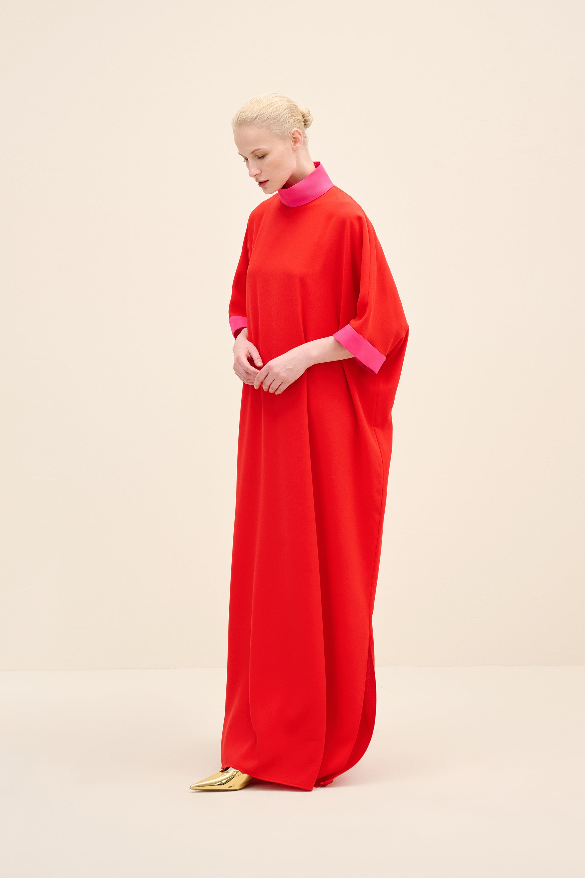 ياقة عالية بلون متباين تحدد الوجه بدقة، وأكمام واسعة عند المرفق مع طيات تضيف حركة معمارية. الخط العمودي للتنورة يطيل القوام، موازنًا الحجم بالدقة.