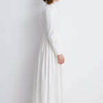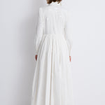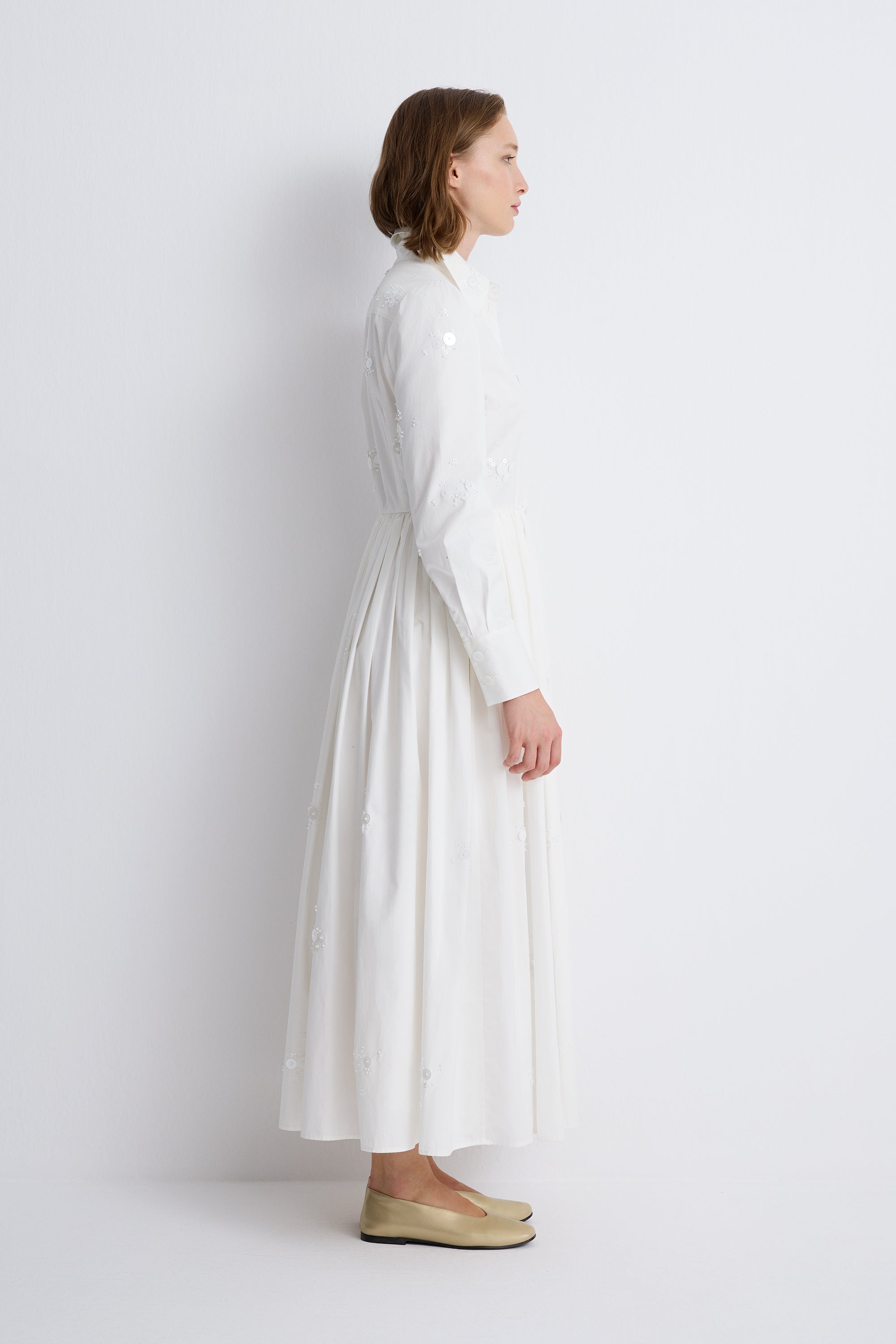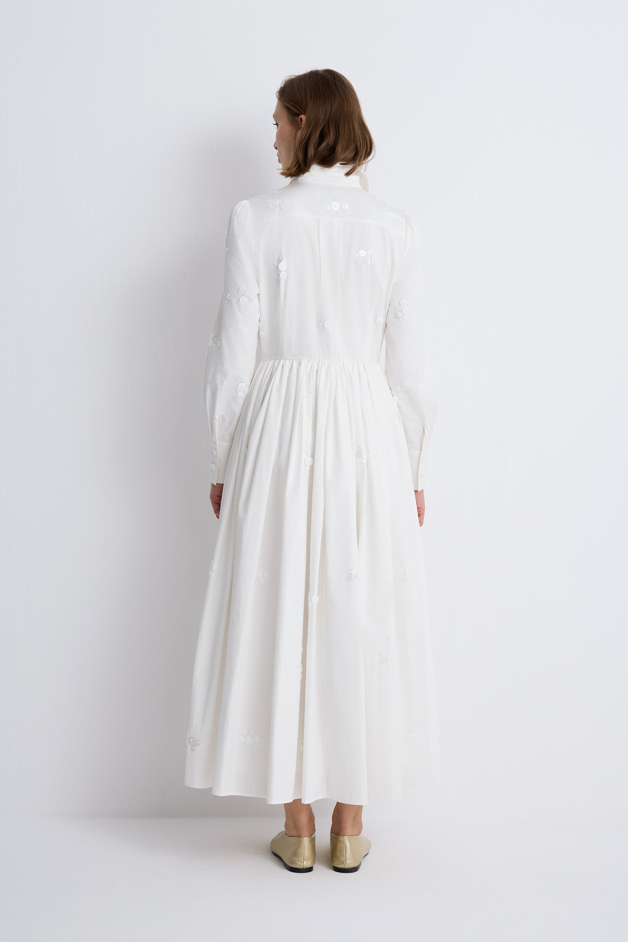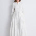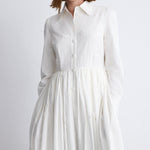 إطلالة راقية بلمسة عصرية على فستان القميص الكلاسيكي، يجمع هذا التصميم بين القصّة المنسّقة بدقة والحجم الانسيابي الرومانسي. صُمّم من قماش بوبلين أبيض ناصع، ويتميّز بياقة مدبّبة، و بأزرار مخفية ، و بأكمام طويلة تنتهي بأساور بأزرار.