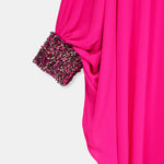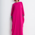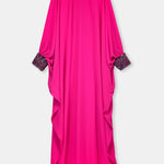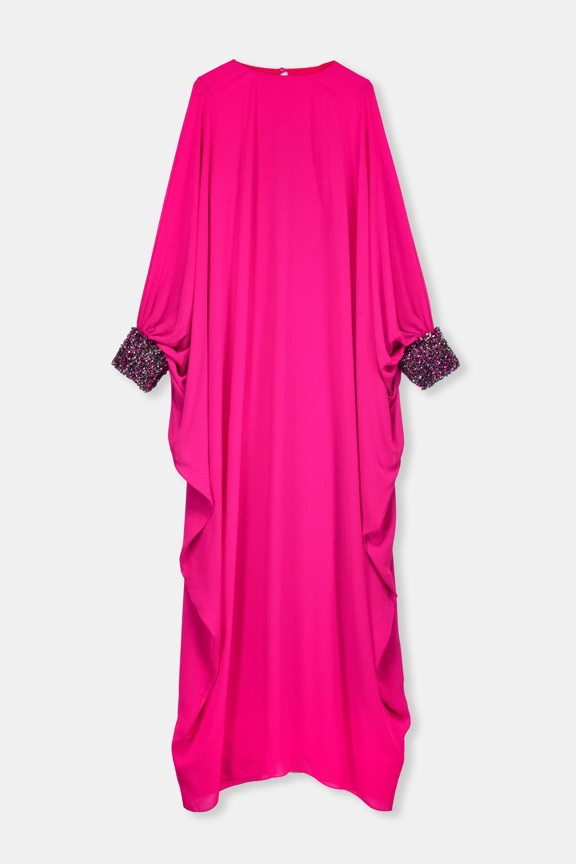 A Dramatic Kaftan Gown In Fuchsia, Finished With Sequin-Embellished Cuffs For A Touch Of Glamour. The Flowing Silhouette Makes It An Elegant Choice For Galas, Cultural Events, And Evening Occasions.