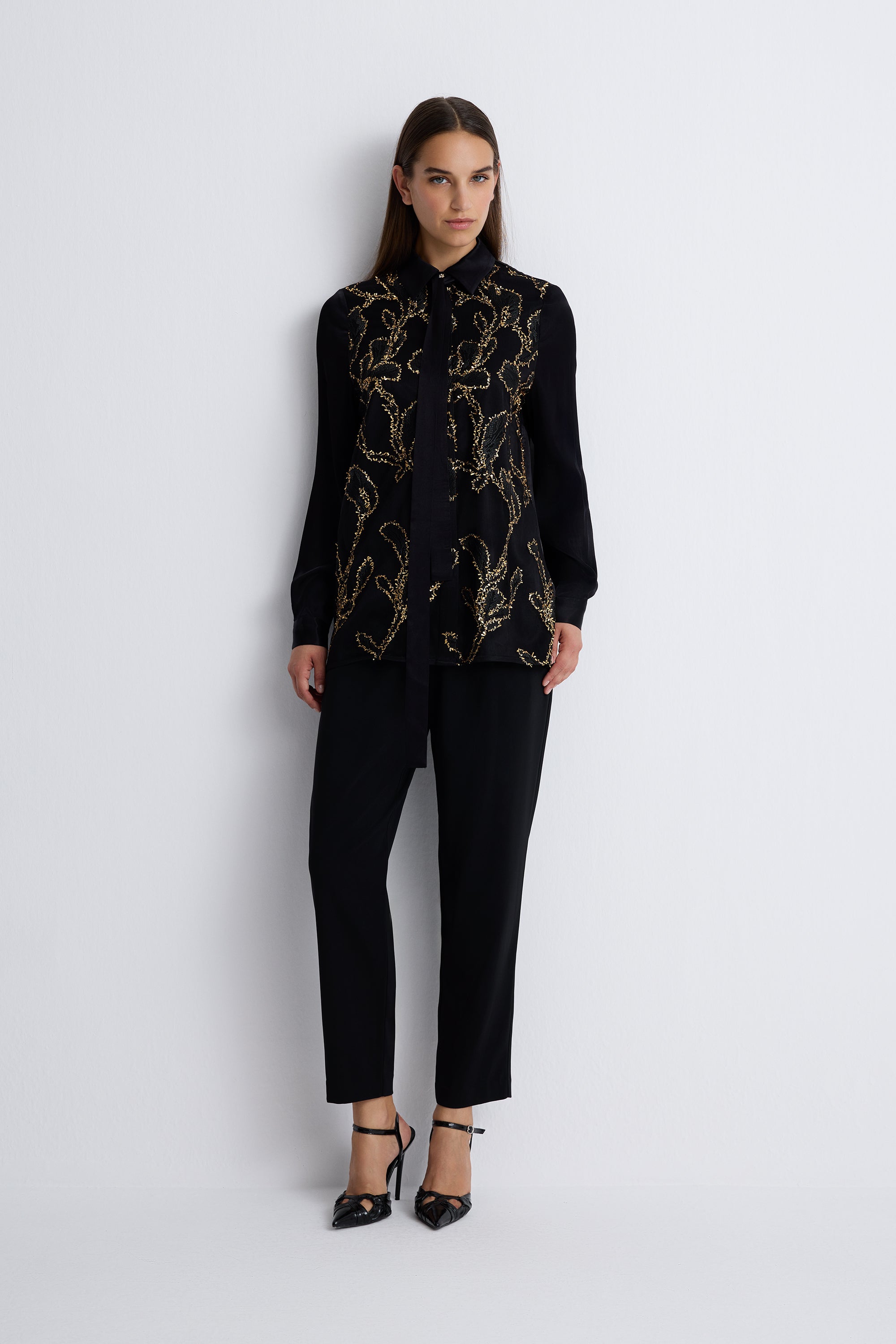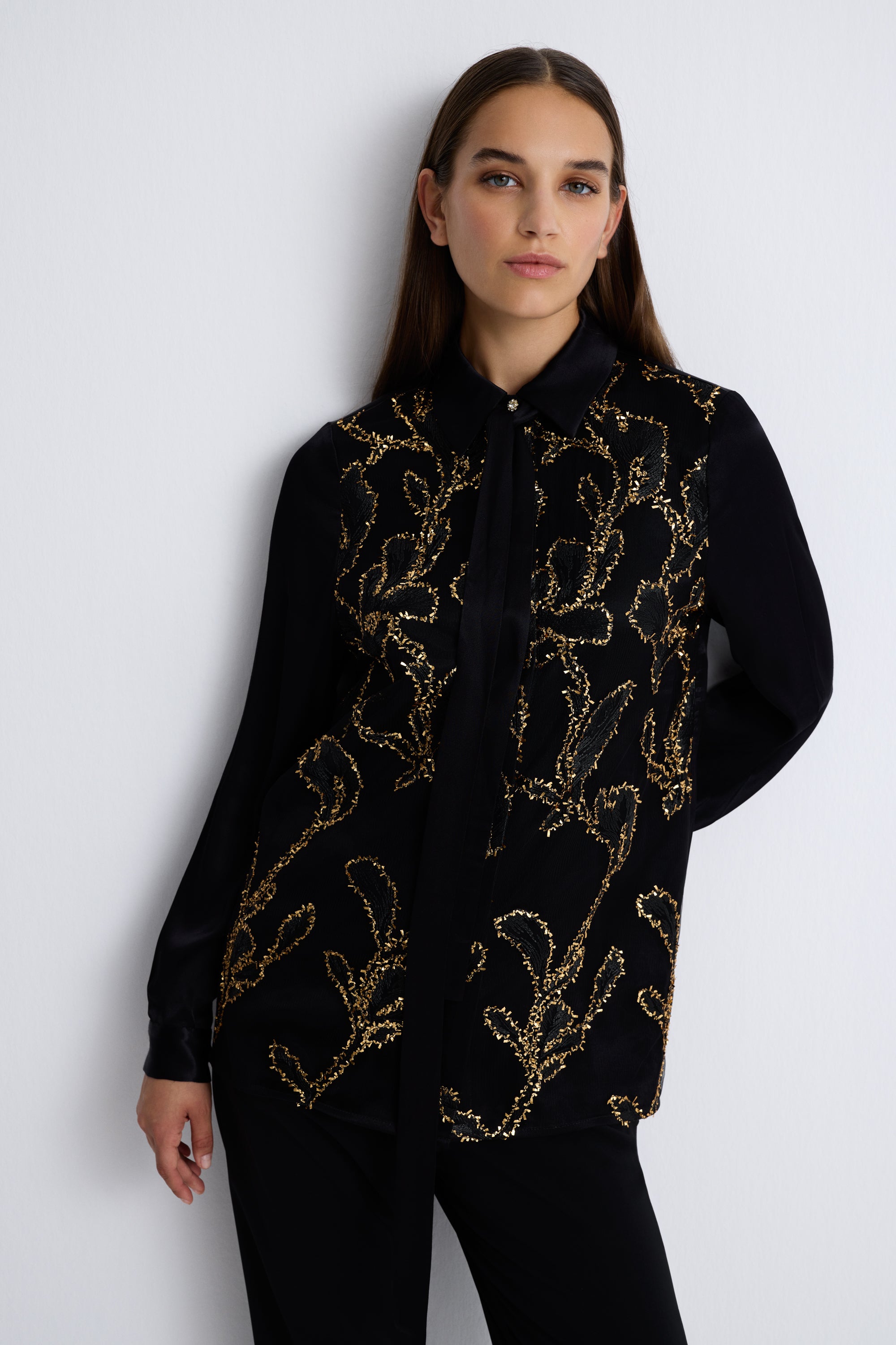 Shine Effortlessly In This Elegant Black Blouse, Detailed With Golden Sequin Embroidery For A Luxurious Touch. The Fluid Silhouette, Soft Long Sleeves, And Tie-Neck Detail Bring Sophistication, Making It Perfect For Evening Occasions Or Chic Events.