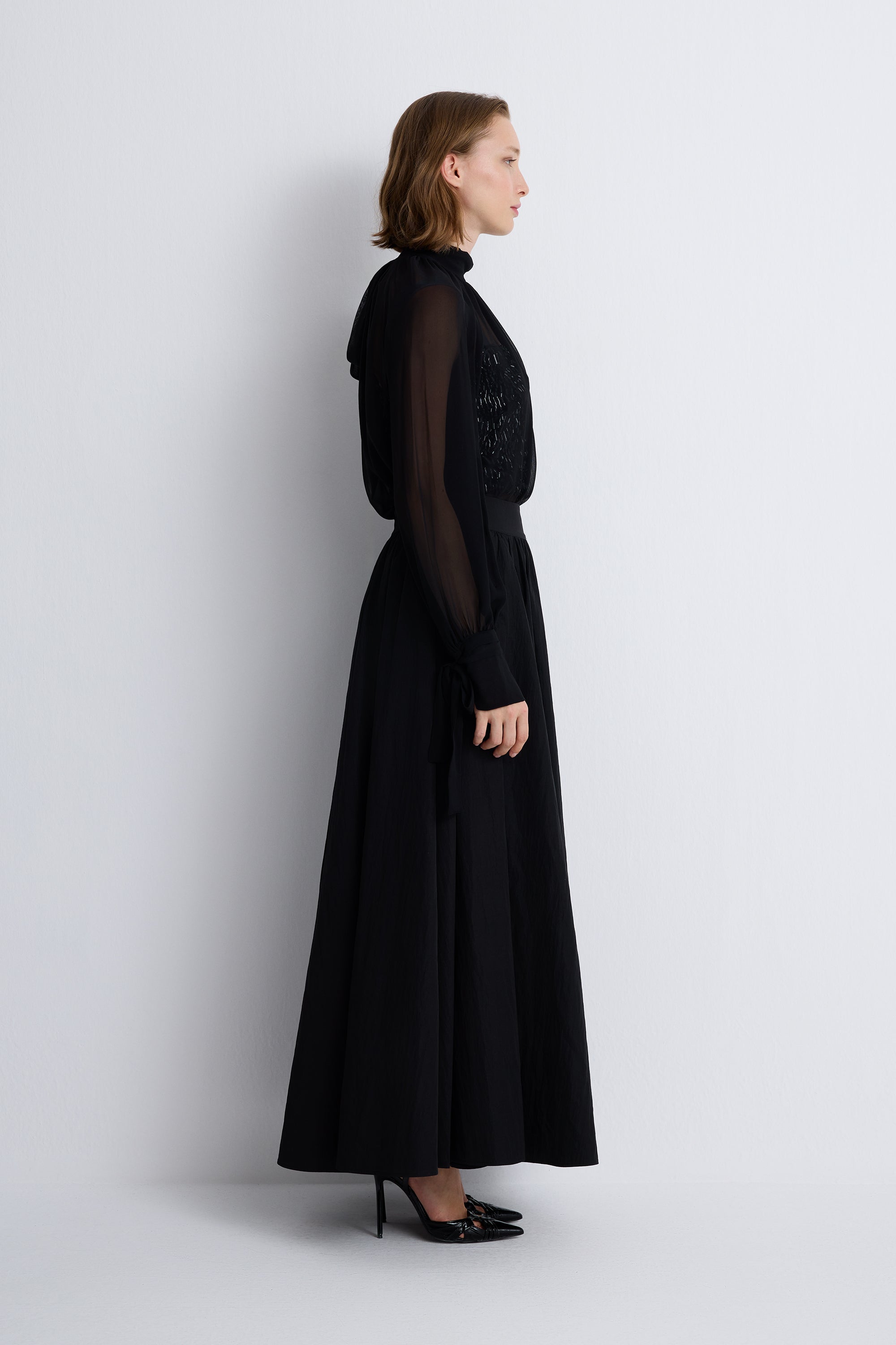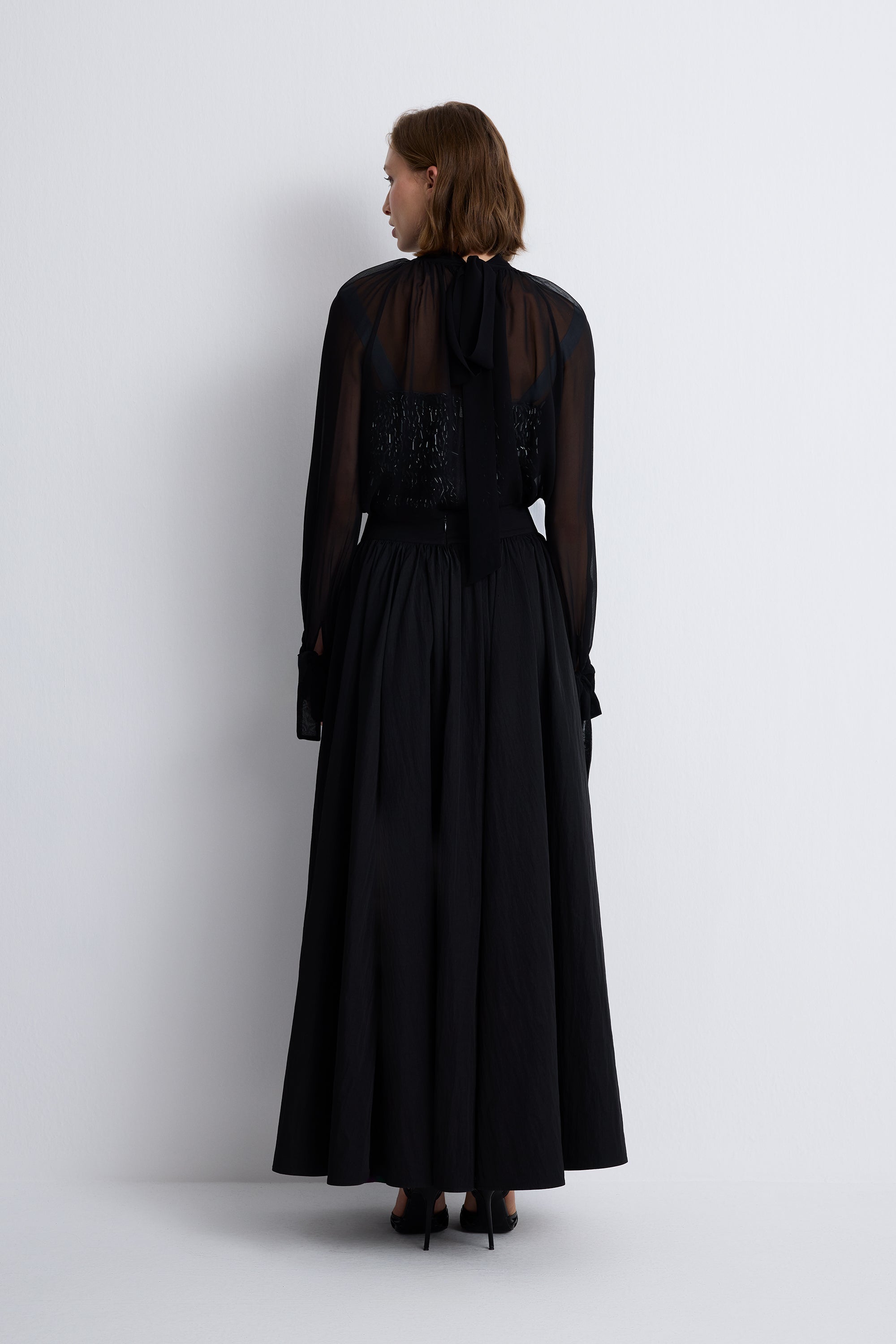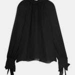 Elevate Your Evening Wardrobe With This Exquisite Black Silk Chiffon Blouse. The Sheer Long Sleeves And Lightweight Fabric Exude Elegance, While The Gathered Neckline Adds A Touch Of Refinement. Finished With Elongated Cuffs And A Delicate High Collar, This Blouse Blends Sophistication With Modern Glamour.
