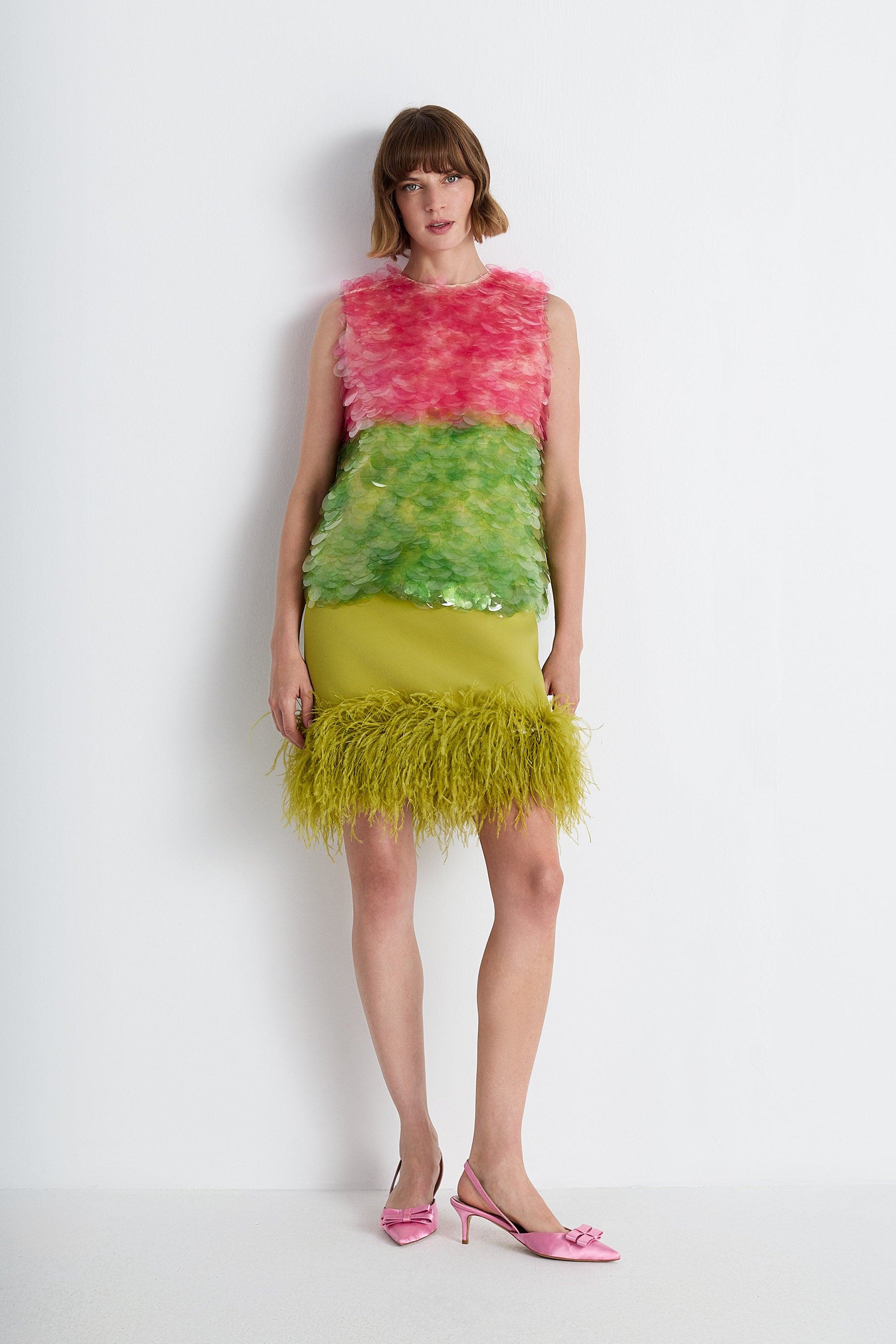 Nean Feather-Trim Mini Skirt Green