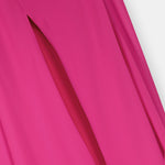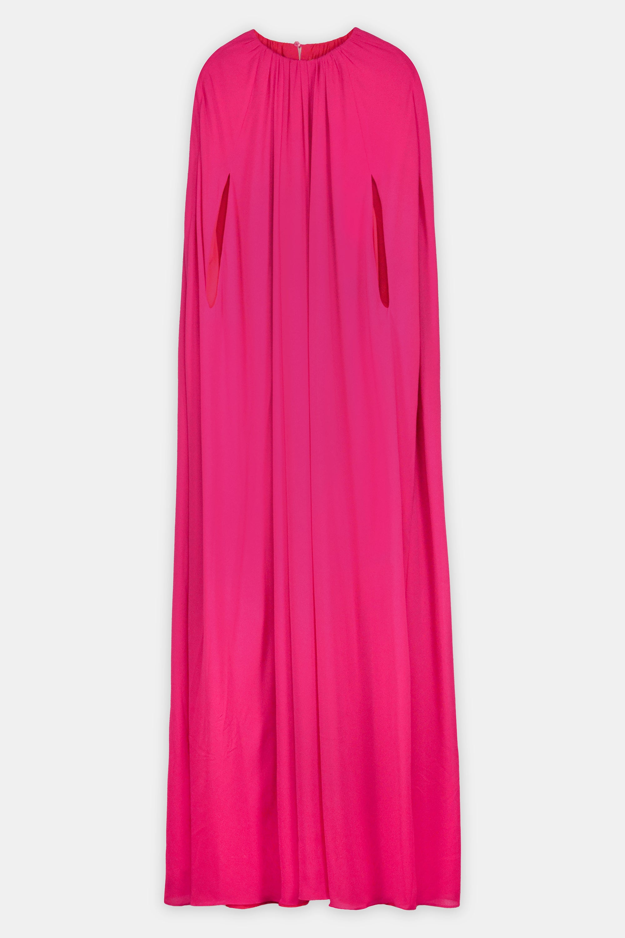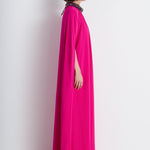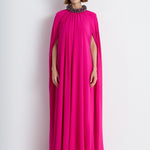 A Statement-Making Cape Gown In Vibrant Fuchsia, Adorned With An Embellished Neckline And Gathered Pleating For An Elegant Draped Effect. With Its Dramatic Floor-Sweeping Silhouette, This Gown Is Perfect For Galas, Evening Occasions, Or Red-Carpet Events.