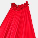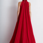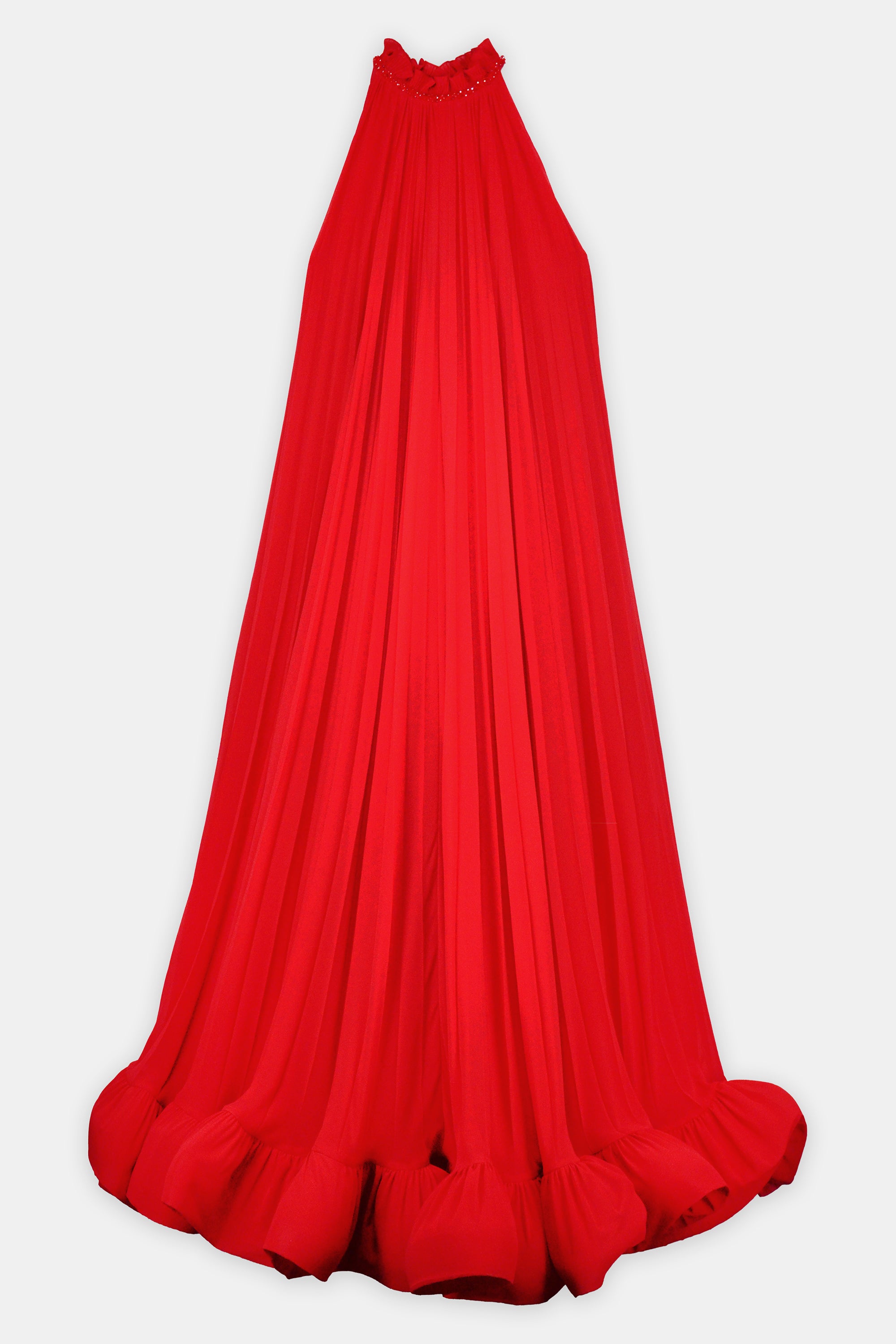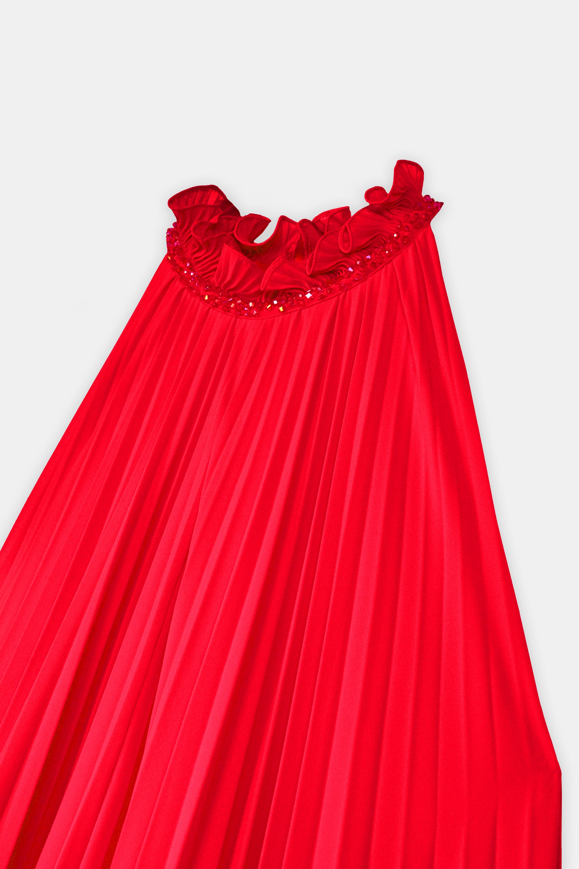 Romantic And Ethereal, This Pleated Halter Neck Gown In Pastel Pink Is Designed With A Delicate Floral Collar Detail And Ruffled Hem. The Flowing Silhouette Creates Graceful Movement, Making It A Perfect Choice For Weddings, Evening Events, Or Special Celebrations.