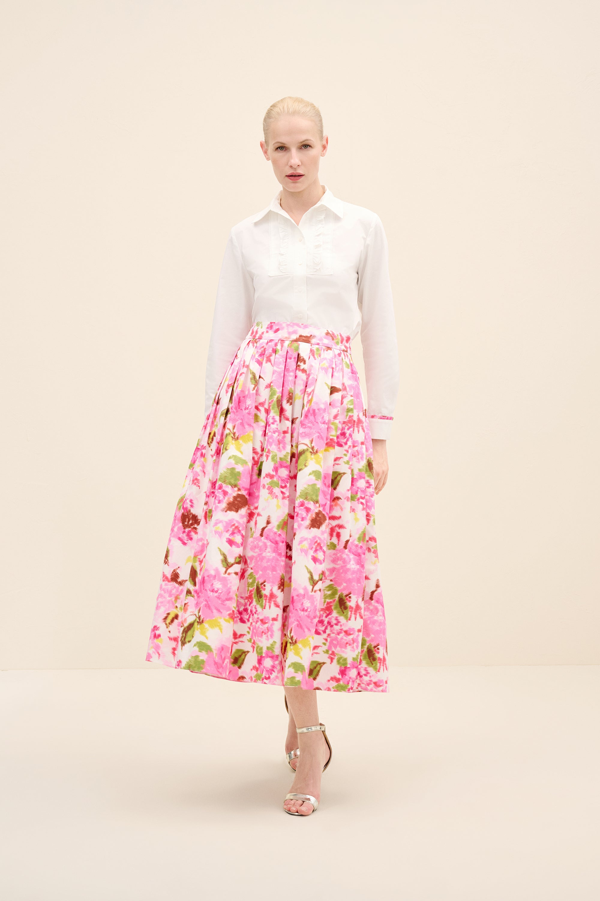 High-Rise Pleated Printed Poplin Midi Skirt