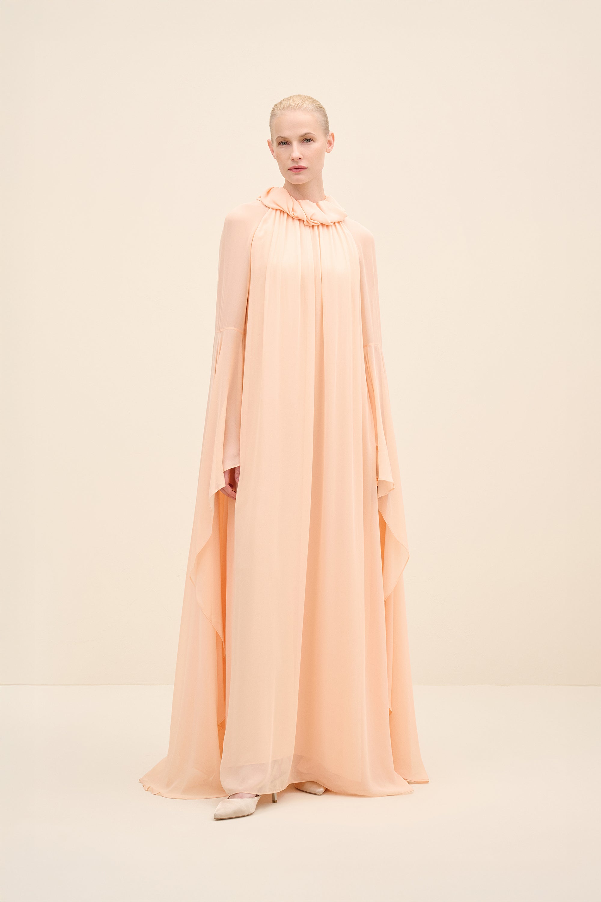 Cape-Sleeve Tiered Maxi Chiffon Dress Coral