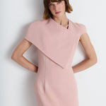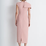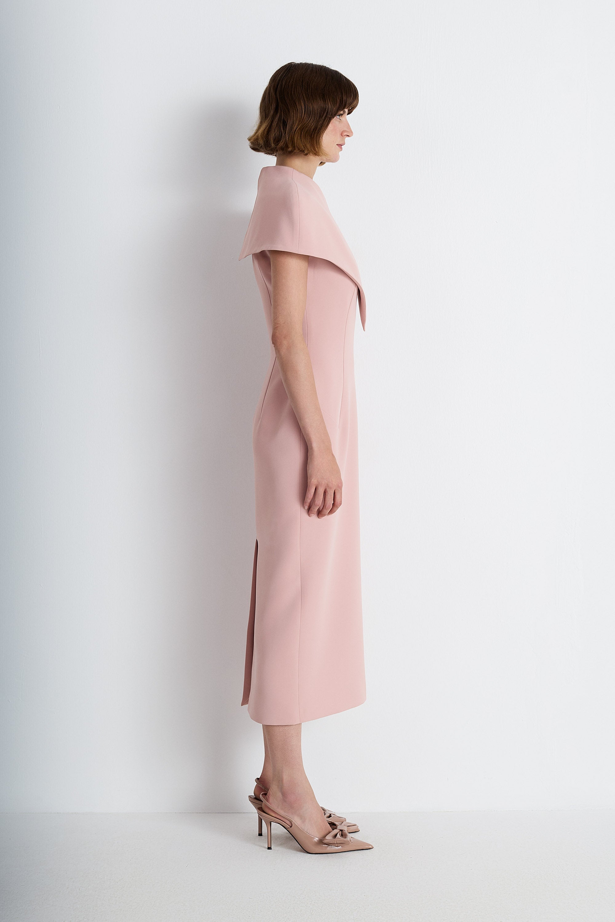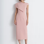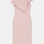 A Sleek And Modern Midi Dress In Pink, Designed With An Asymmetric Folded Shoulder Detail That Adds Architectural Elegance. Its Clean Lines And Sculpted Fit Create A Contemporary Feminine Silhouette, Perfect For Cocktail Parties, Formal Dinners, Or Special Occasions.