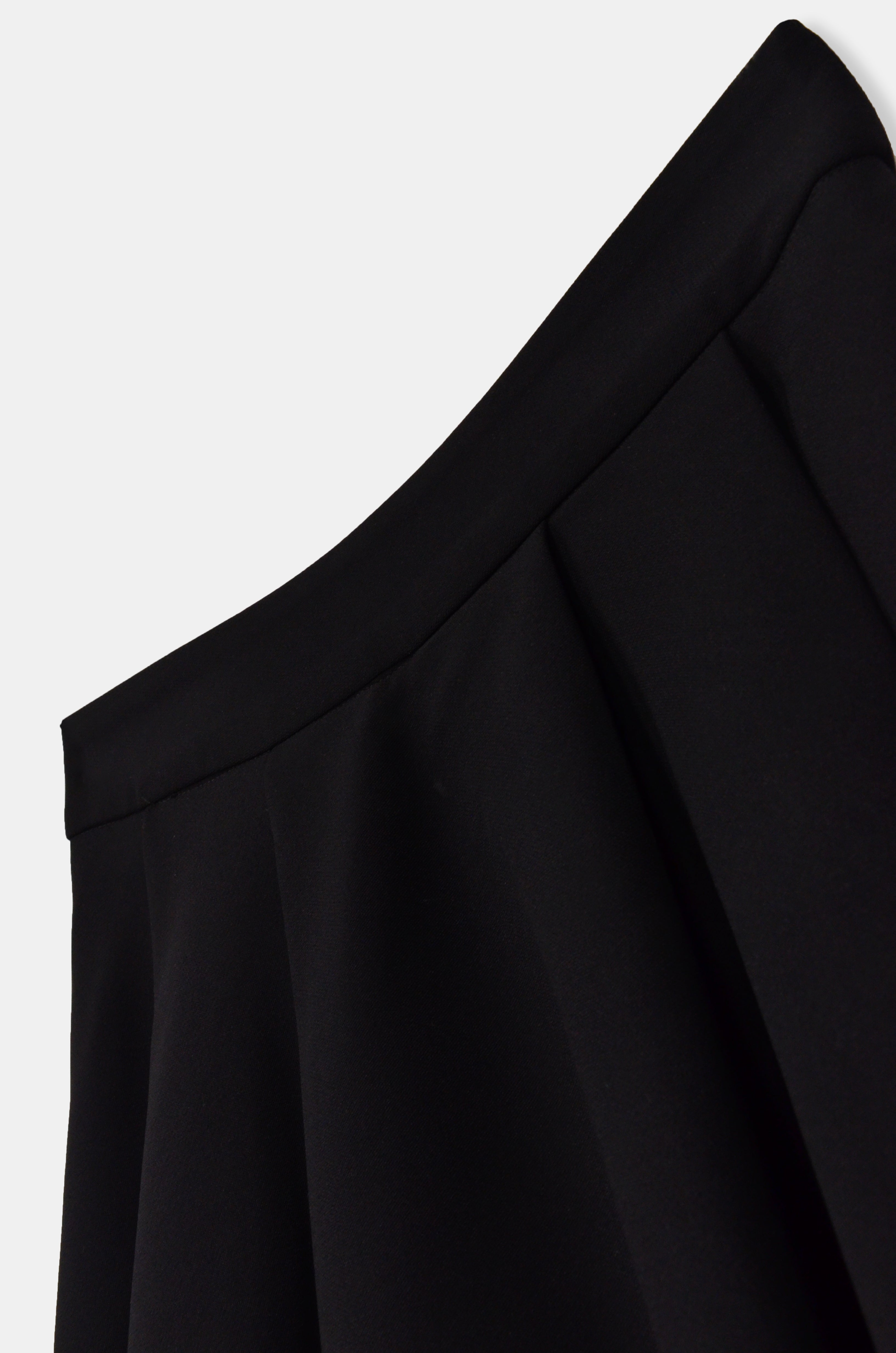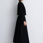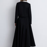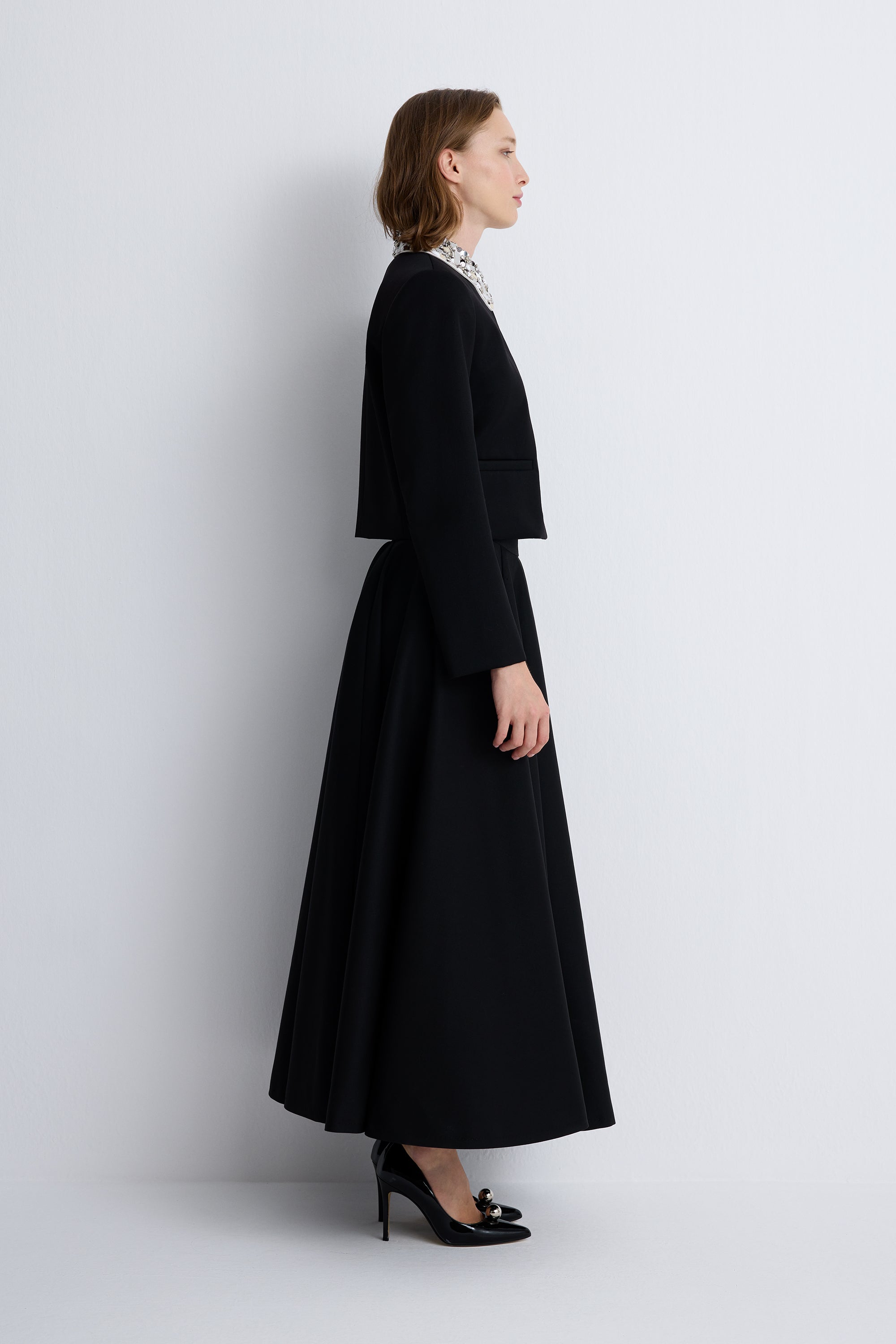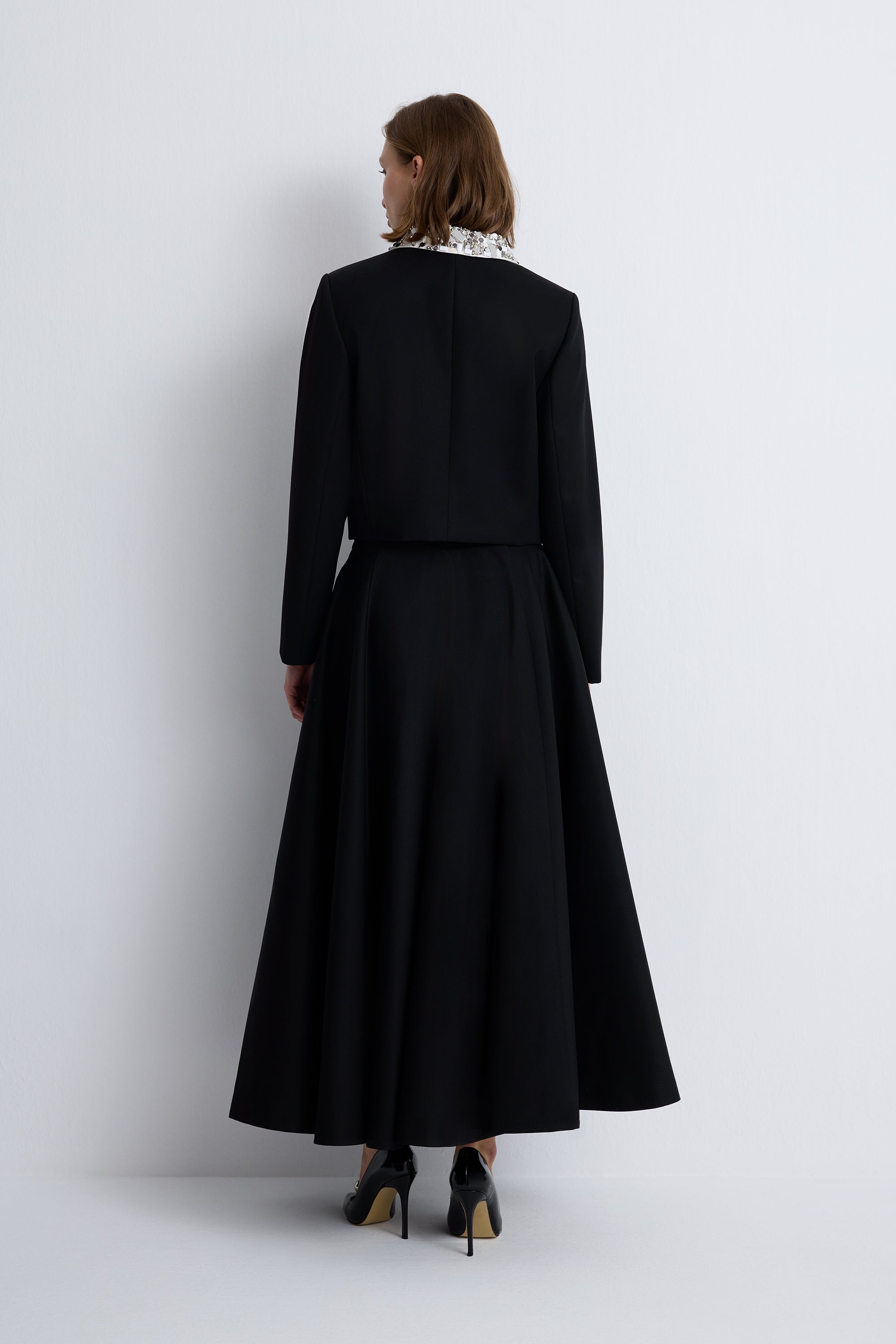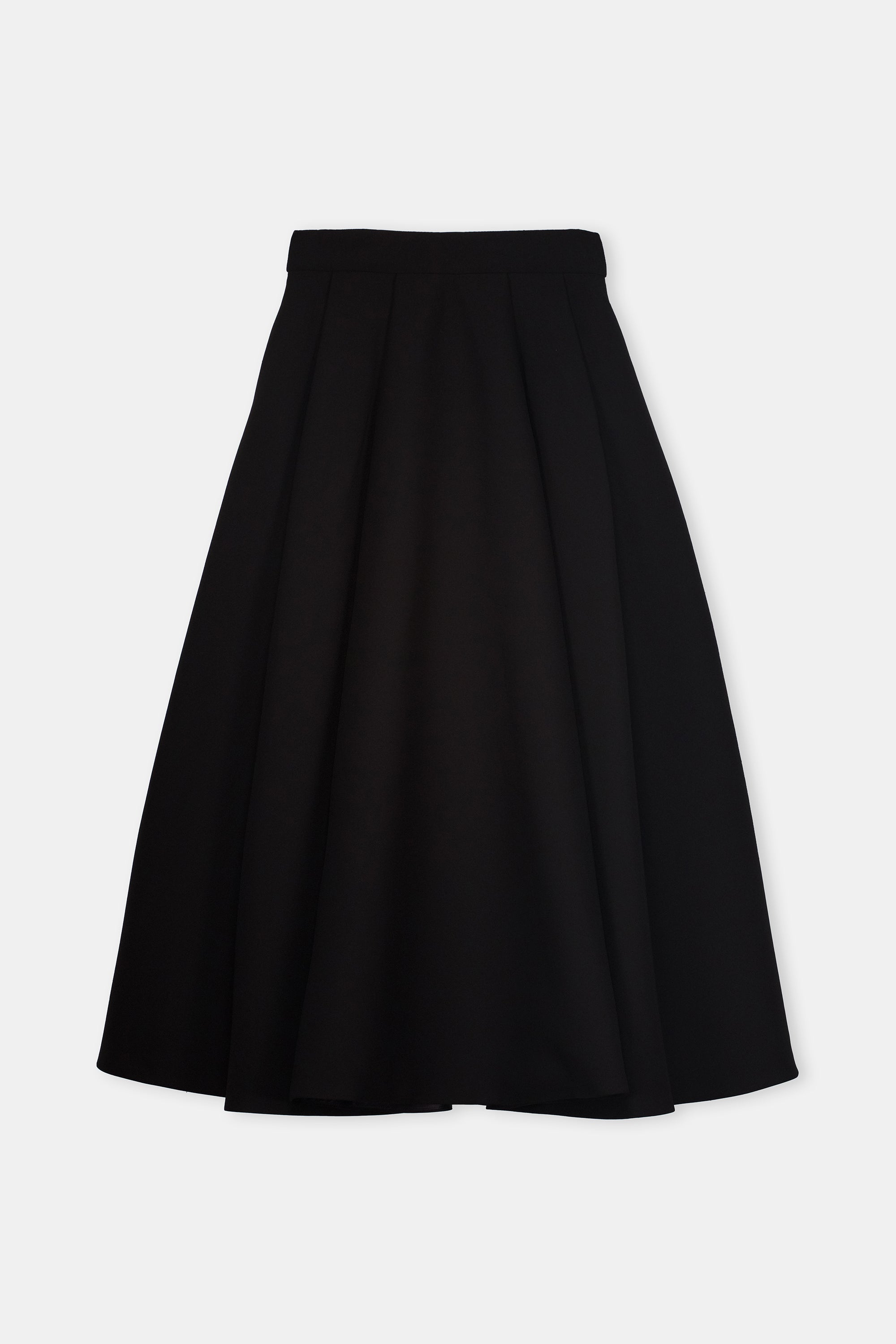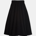 A Classic Black Midi Skirt Crafted With Volume And Fluidity. The High-Waist Design Flatters The Silhouette, While Soft Pleats Add Graceful Movement. Perfectly Paired With The Cropped Jacket Or Styled Separately For Versatile Looks.