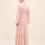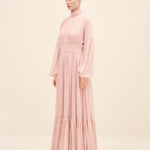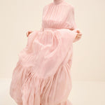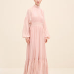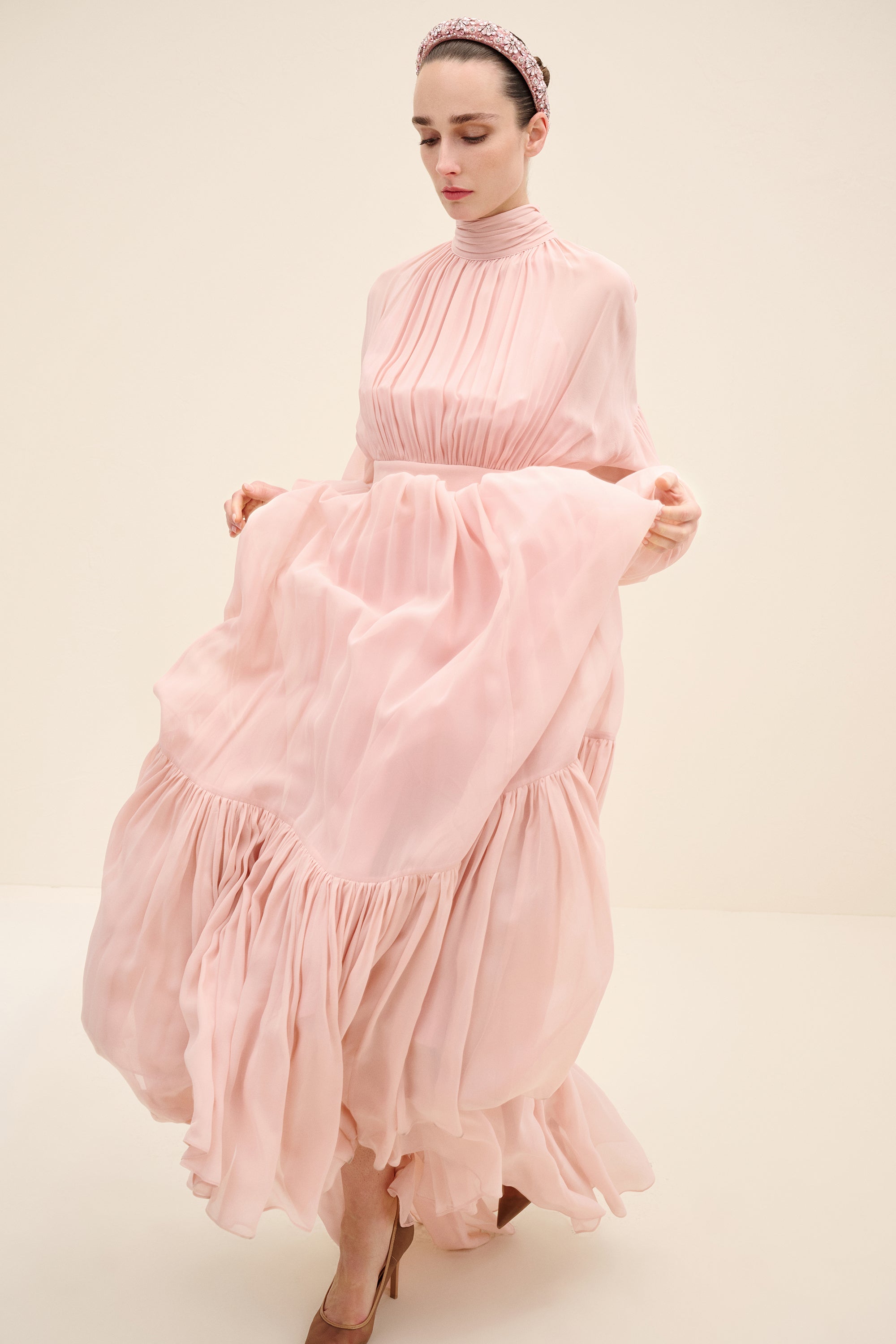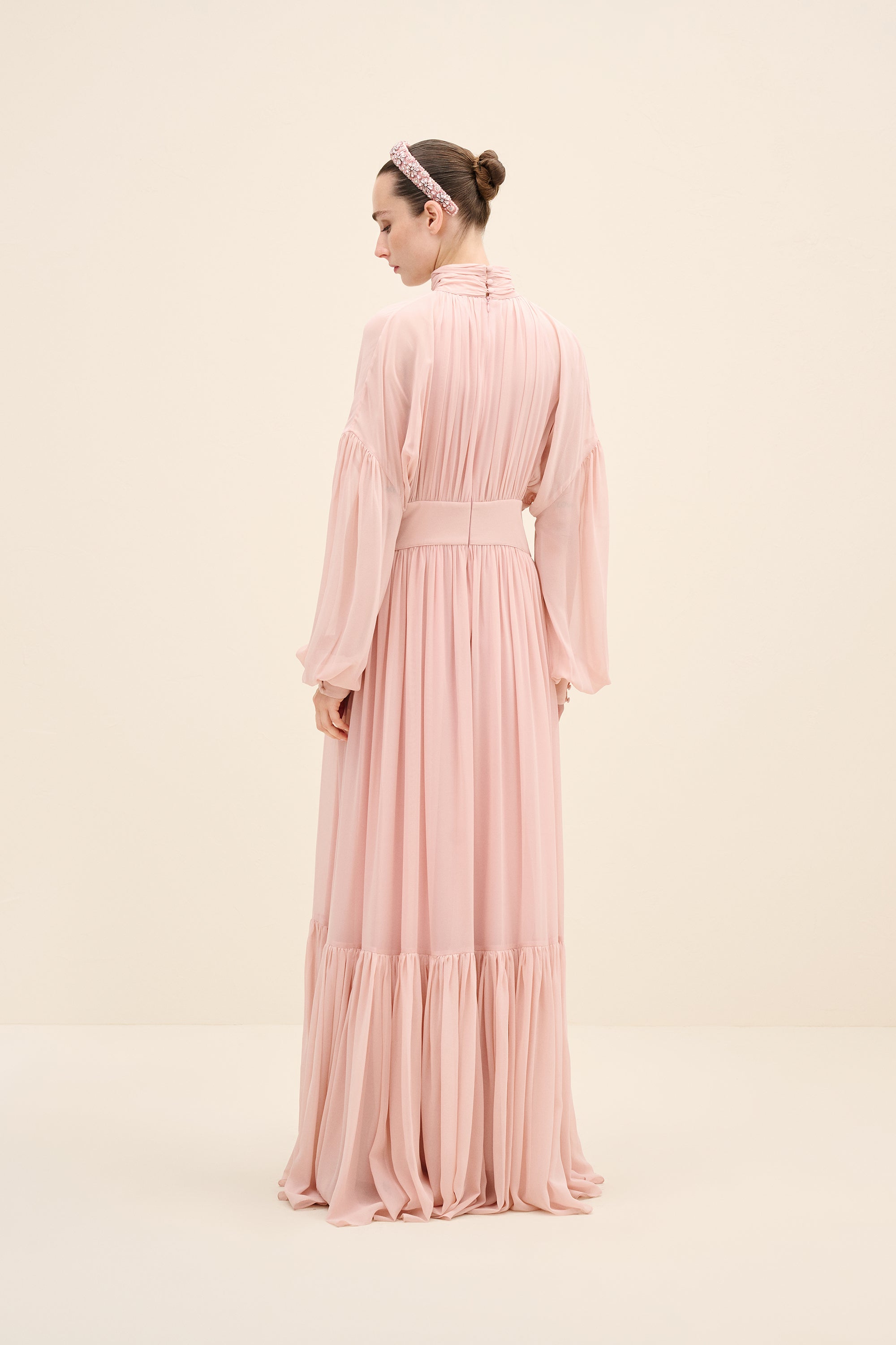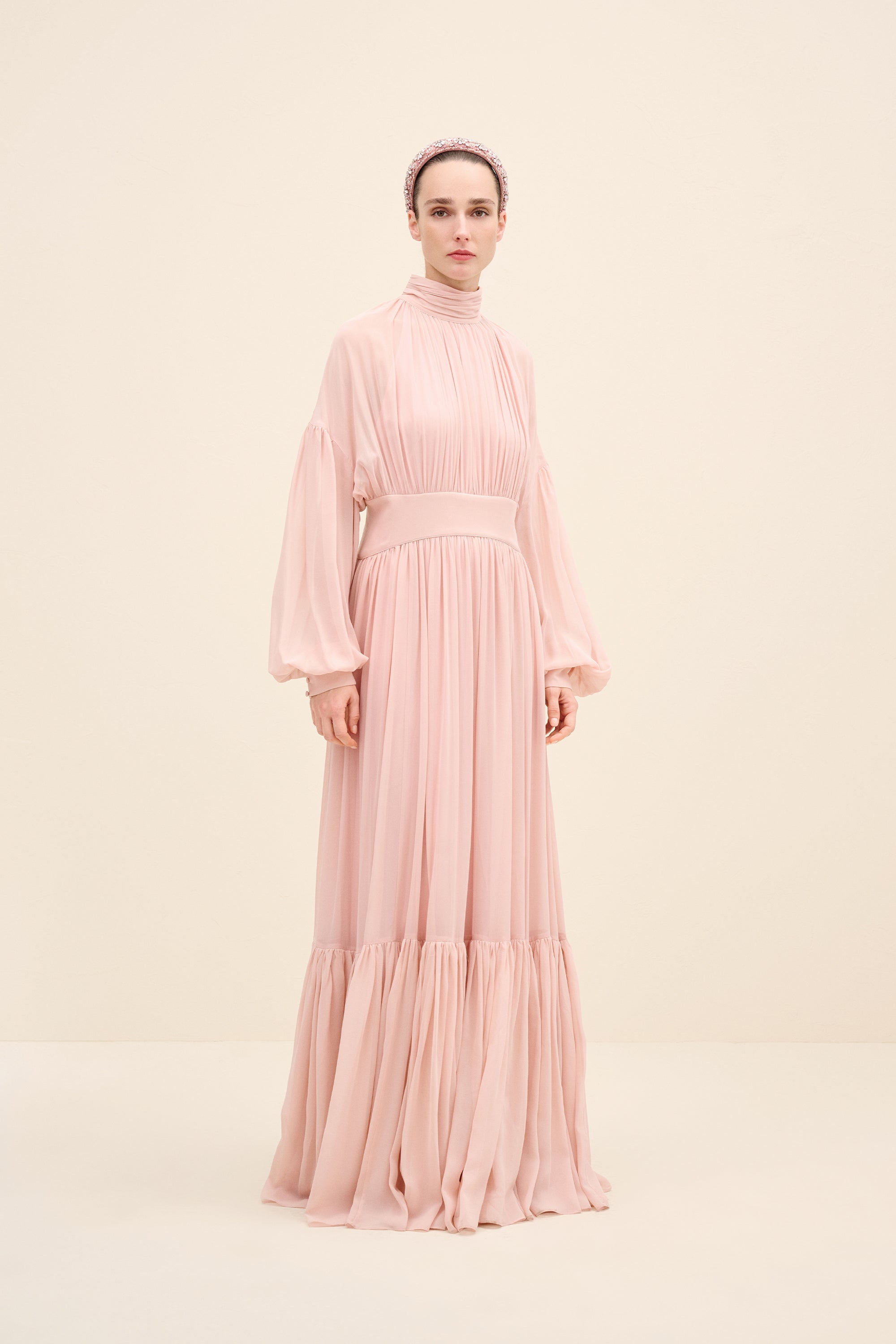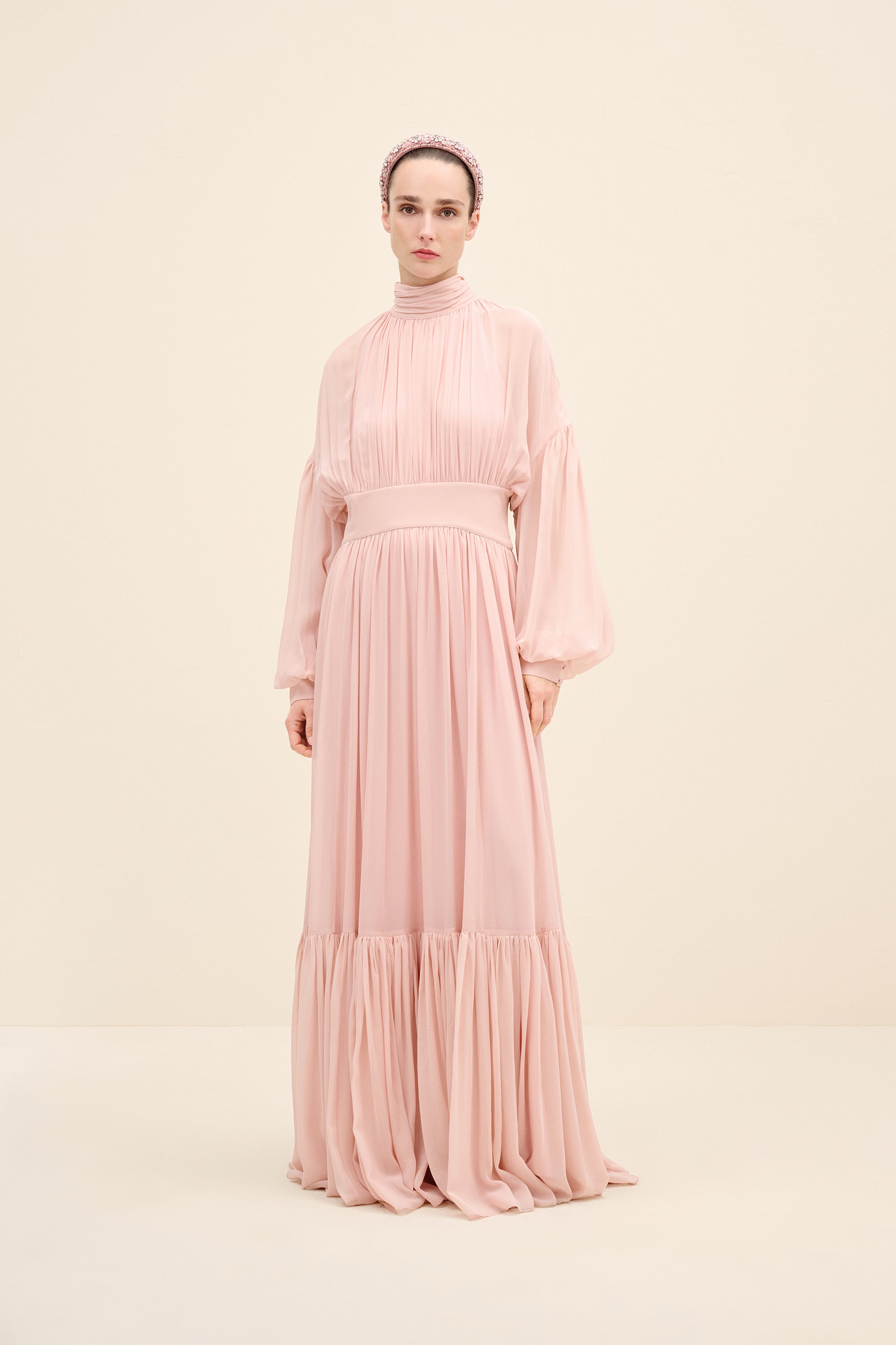 Ethereal and fluid, this gown is crafted from lightweight silk chiffon that drapes with graceful movement. the high gathered neckline creates soft vertical pleats that elongate the silhouette, while the defined waistband balances the volume. billowing sleeves and a Tiered hem add subtle drama, allowing the fabric to move effortlessly with every step. romantic yet composed, it’s designed for moments that call for quiet impact.