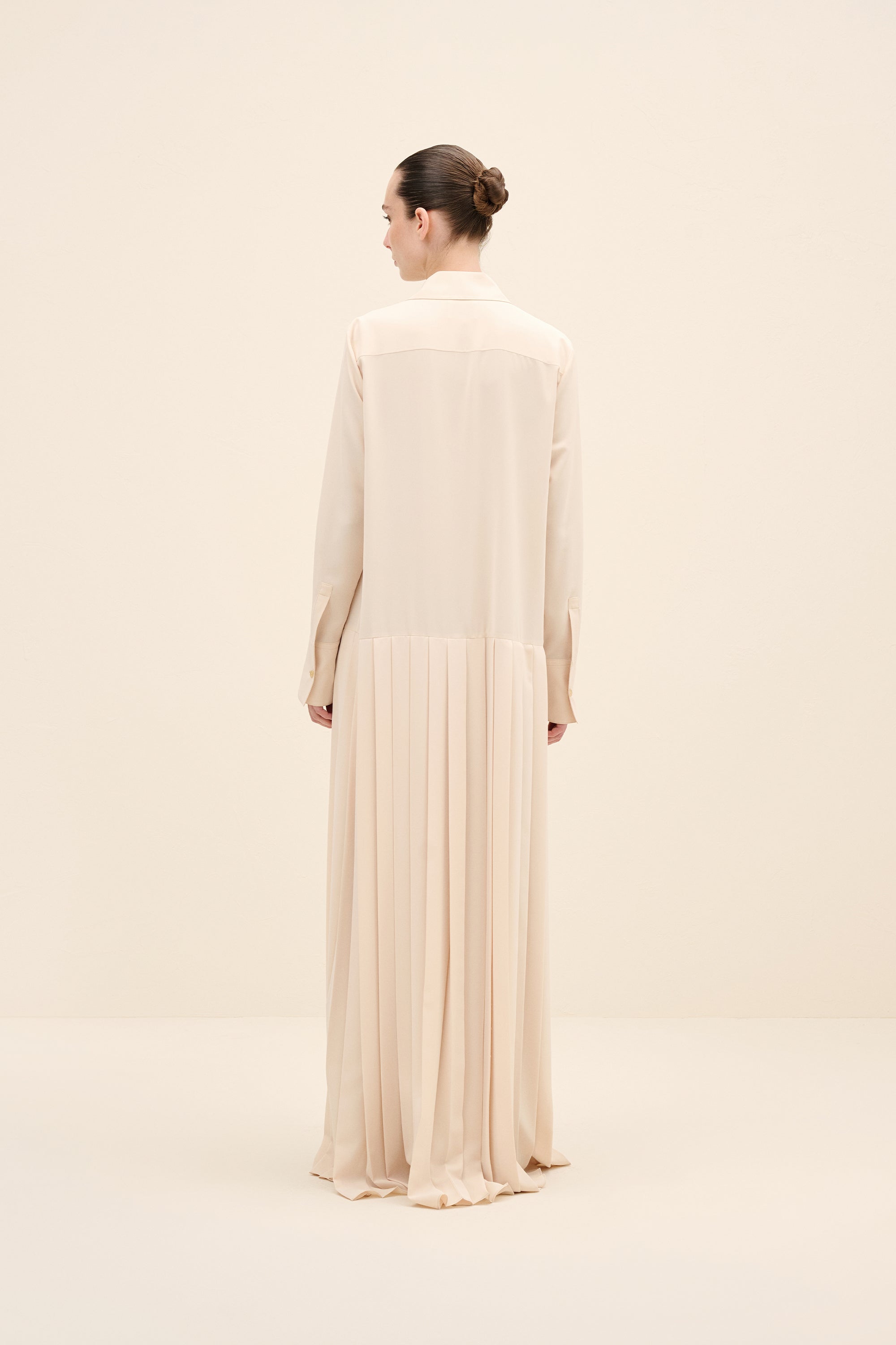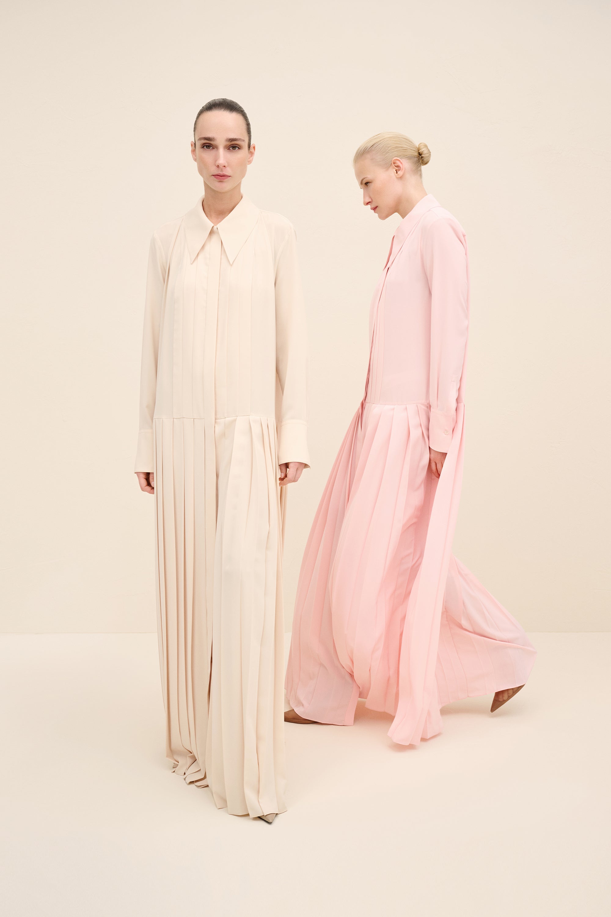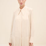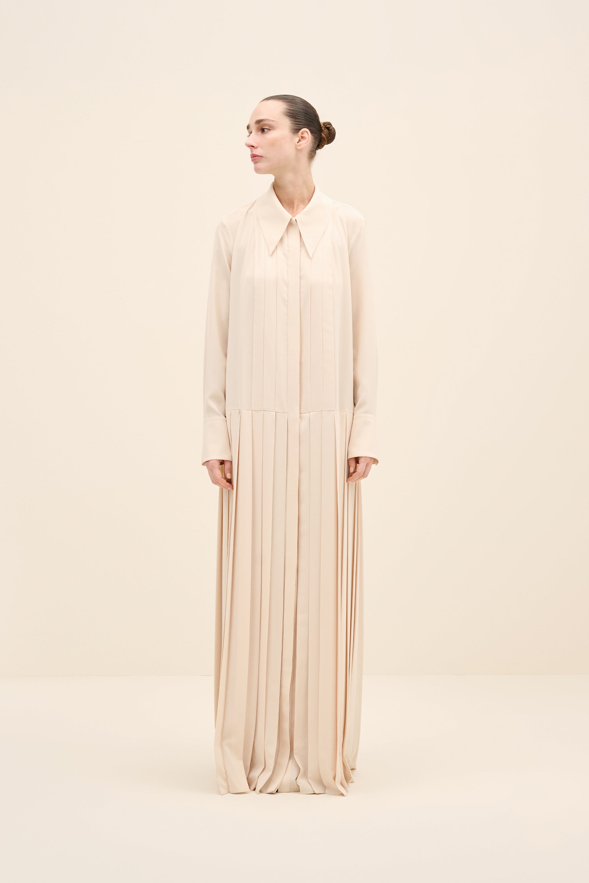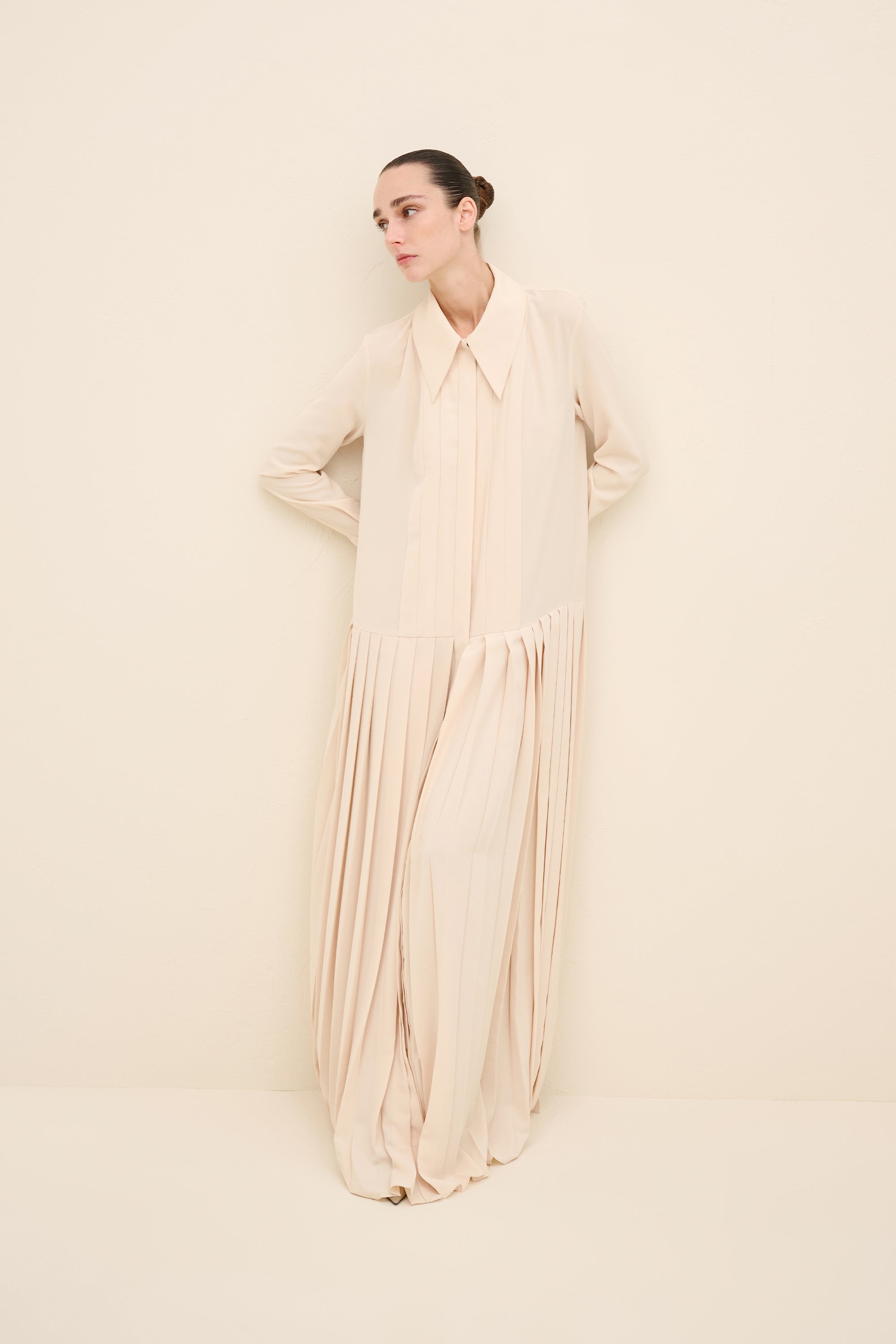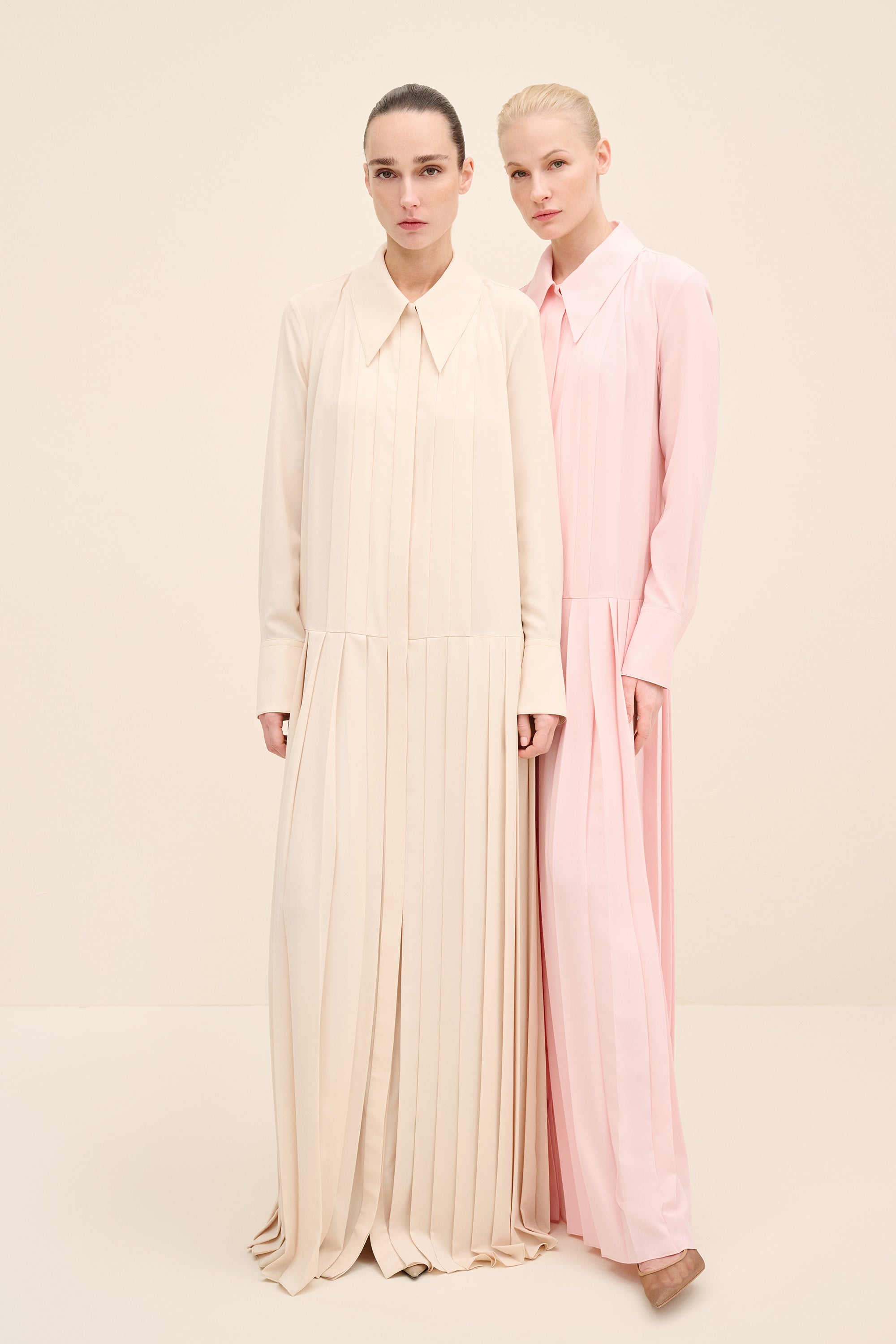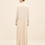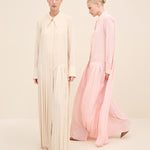 Understated yet architecturally precise, this maxi dress is crafted from fluid silky crepe in a soft pink hue. the design is defined by elongated vertical pleats that run seamlessly from bodice to hem, creating a sculptural column effect that subtly elongates the frame. A sharp point collar and concealed placket maintain its tailored clarity, while the softly dropped waistline introduces a refined sense of proportion. the pleated skirt moves with quiet fluidity, balancing structure and softness in equal measure.