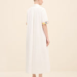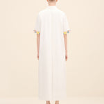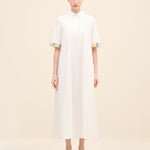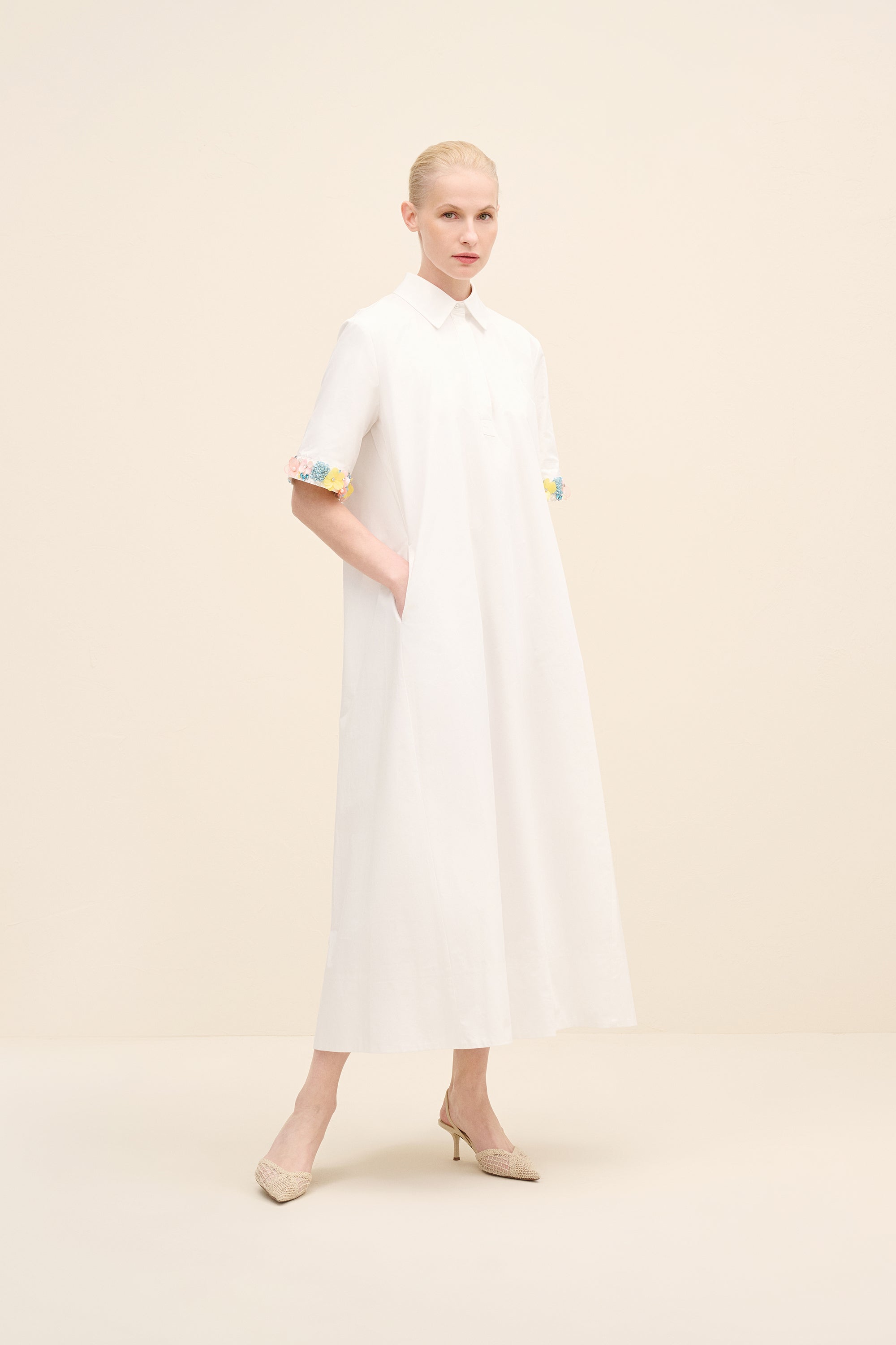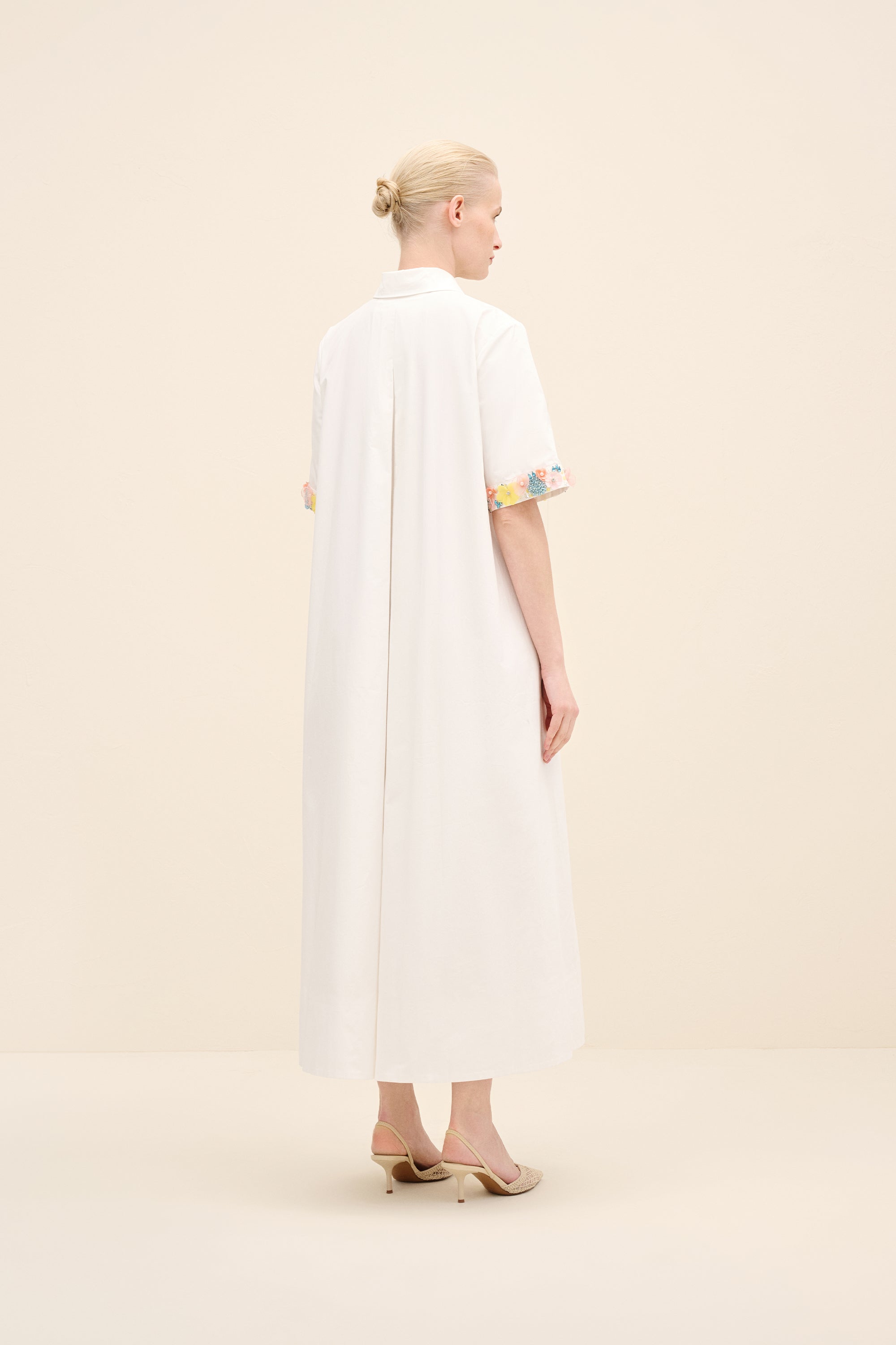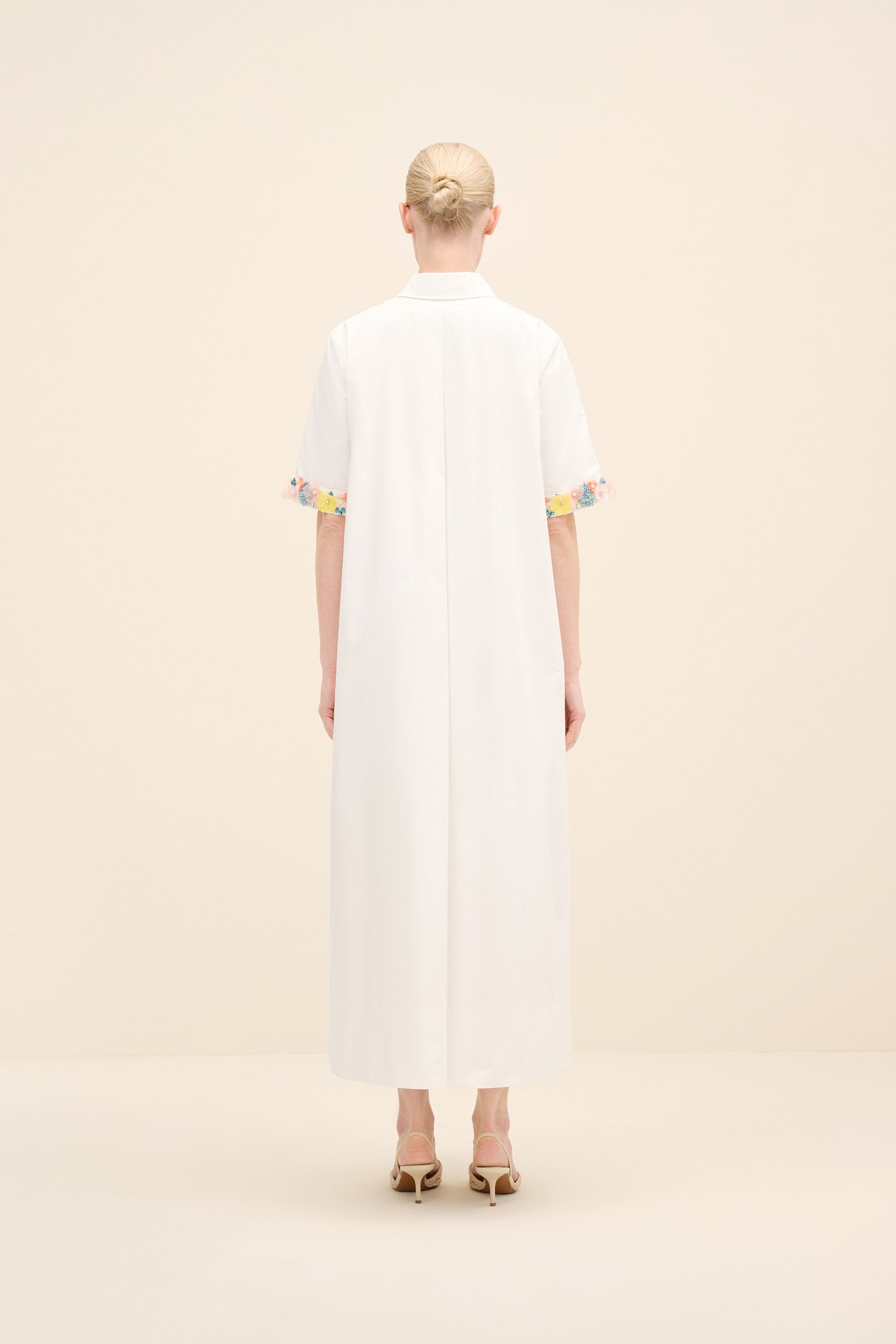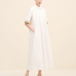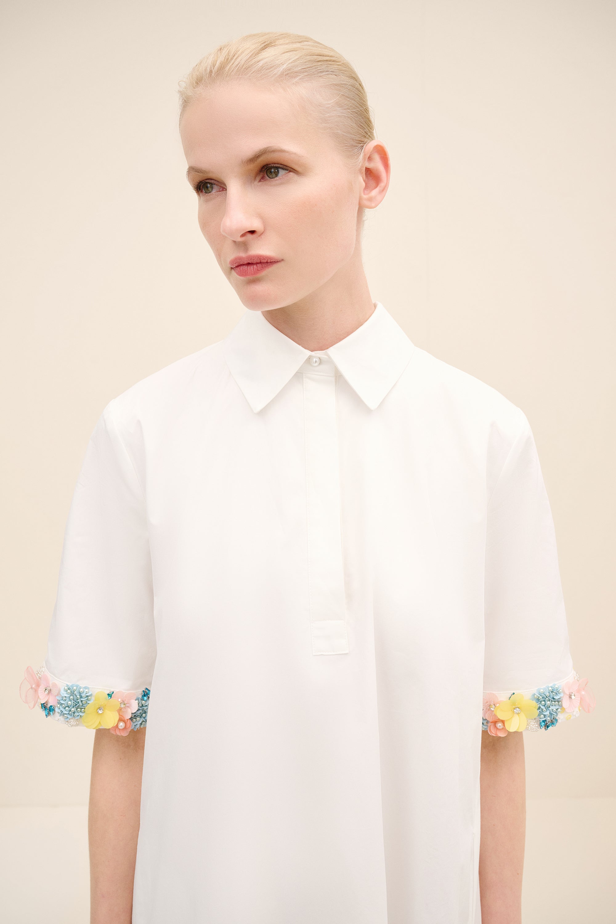 Understated yet delicately expressive, this midi dress is cut from crisp cotton poplin that holds its shape with quiet structure. the silhouette is intentionally pared-back — clean lines, a concealed placket and a sharp point collar lend it a refined, almost architectural simplicity. The true statement lies at the cuffs: hand-applied floral embellishments in soft pastel tones create a subtle contrast against the purity of the white base.