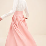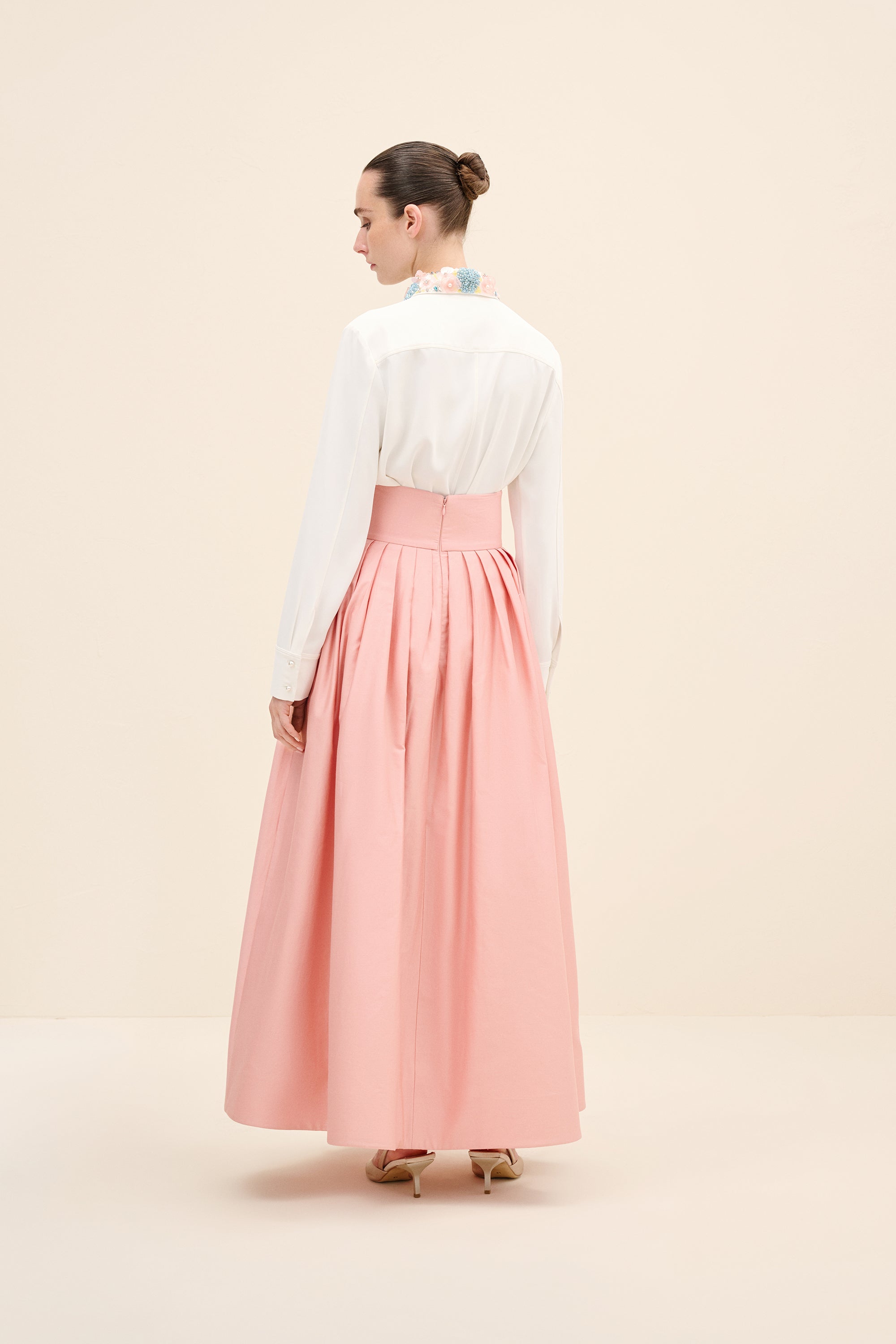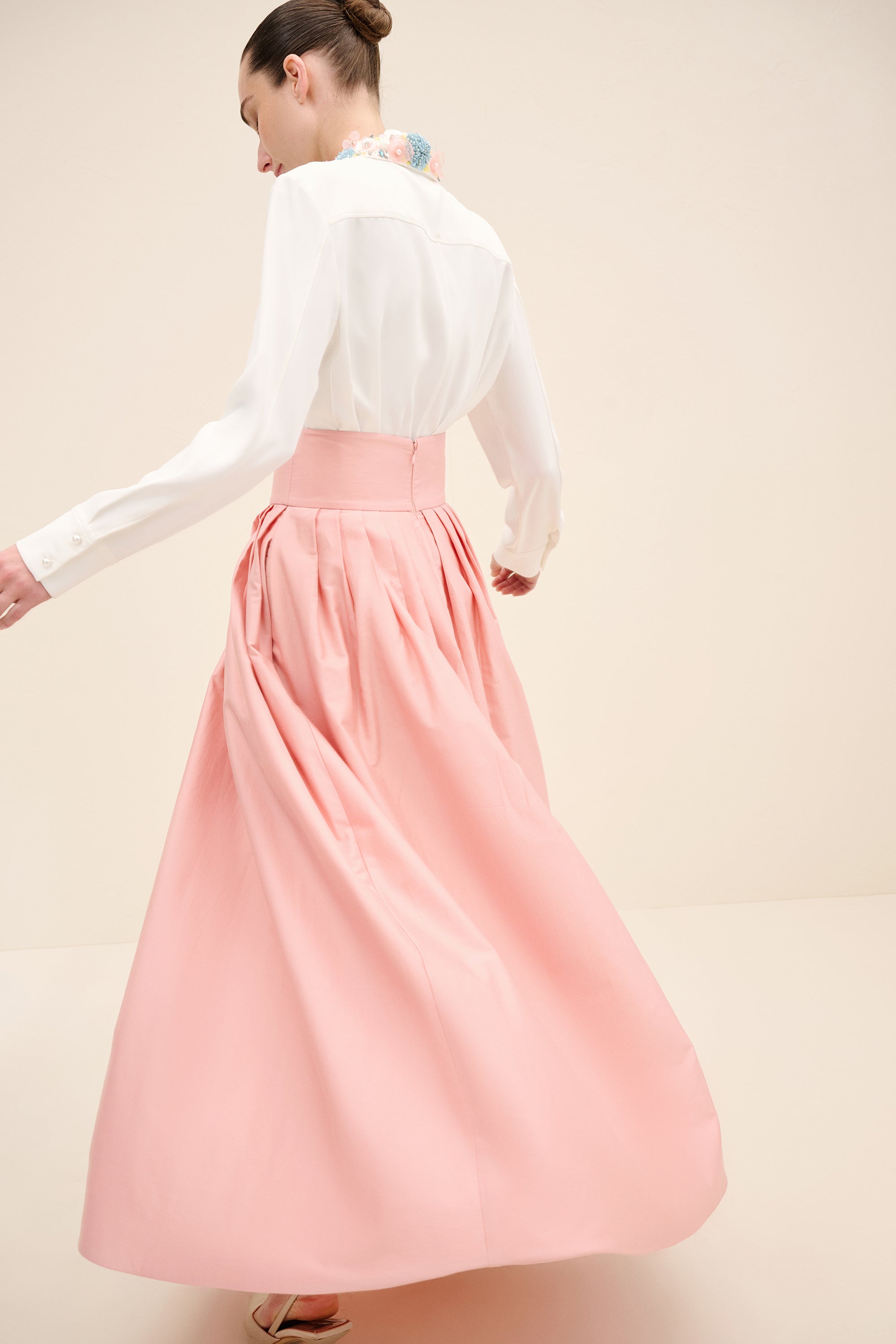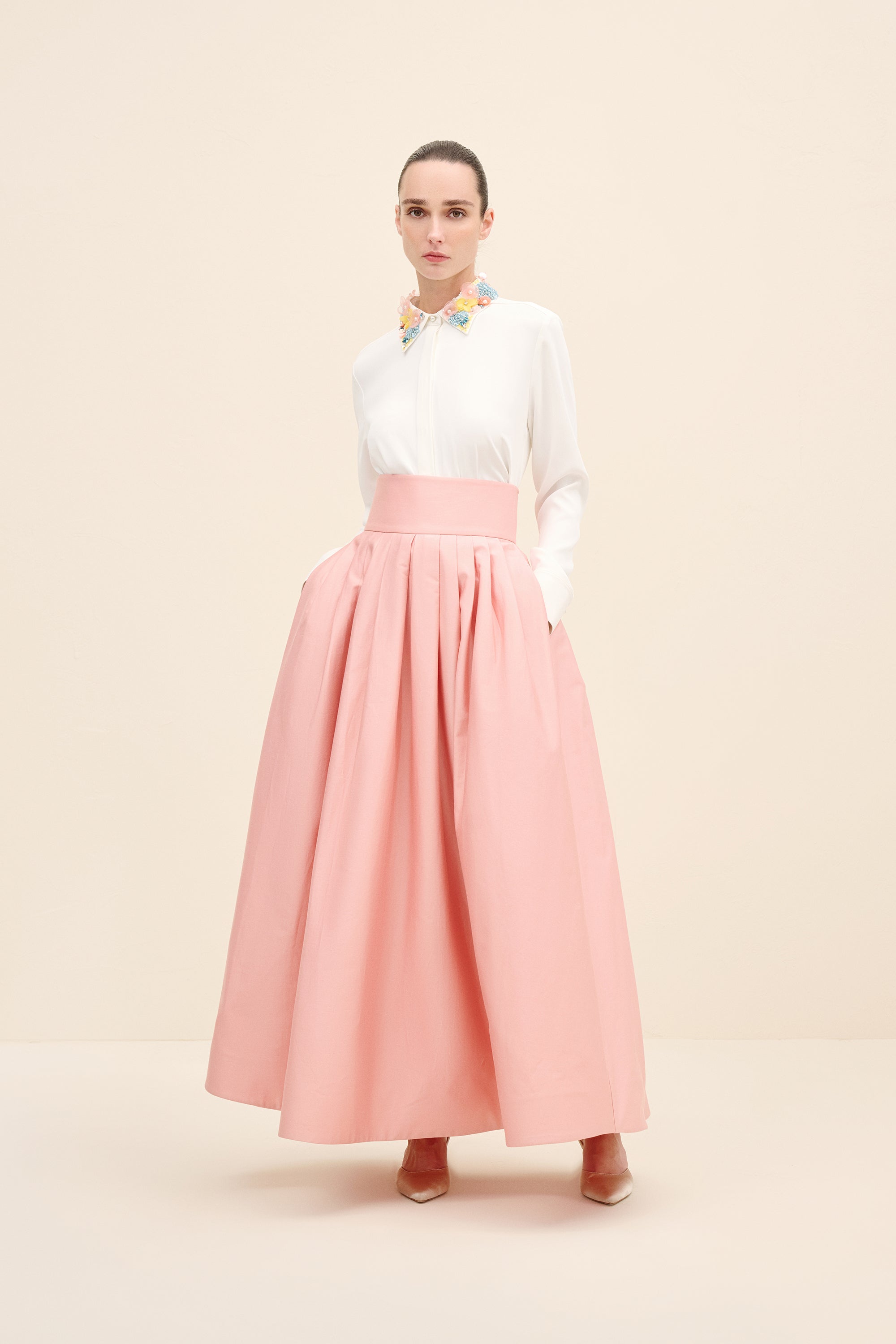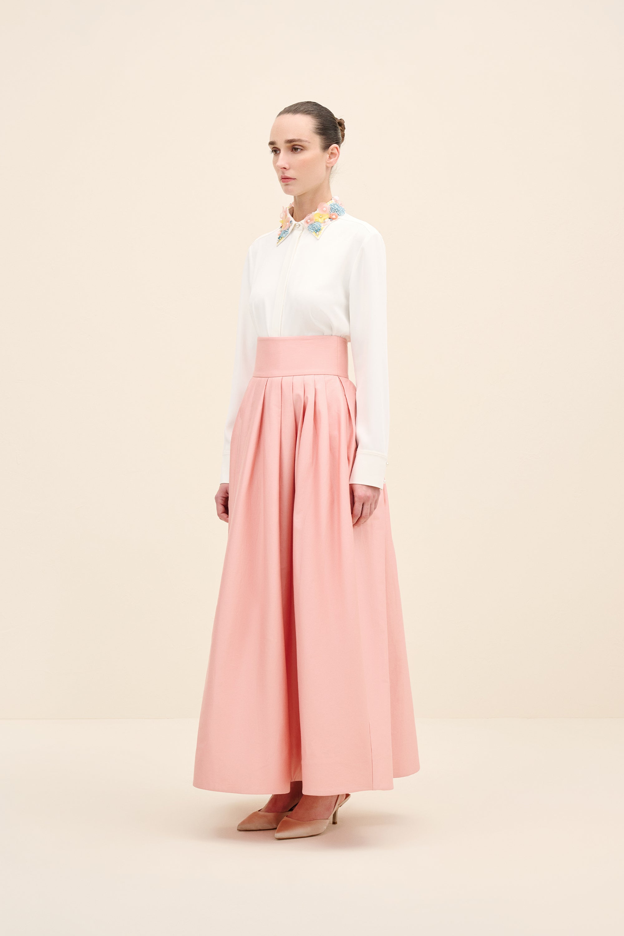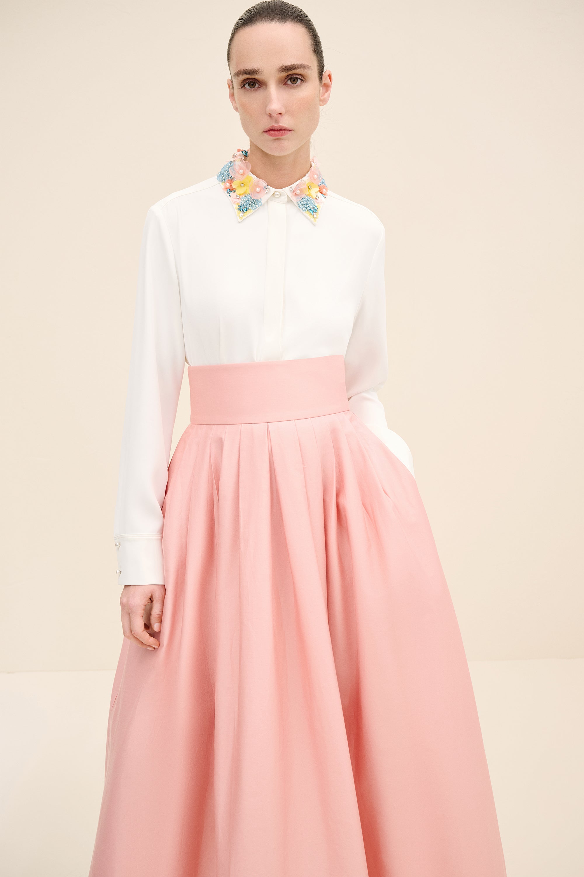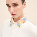 Elegant in its restraint yet expressive in detail, this shirt is crafted from a fluid crepe that drapes effortlessly against the body. the silhouette is intentionally minimal — clean lines, a concealed placket and softly structured cuffs create a refined foundation. the focal point is the intricately hand-embellished collar, adorned with delicate pastel florals, translucent petals and tonal beadwork. balancing purity with artisanal detail, it embodies modern femininity with a couture sensibility.