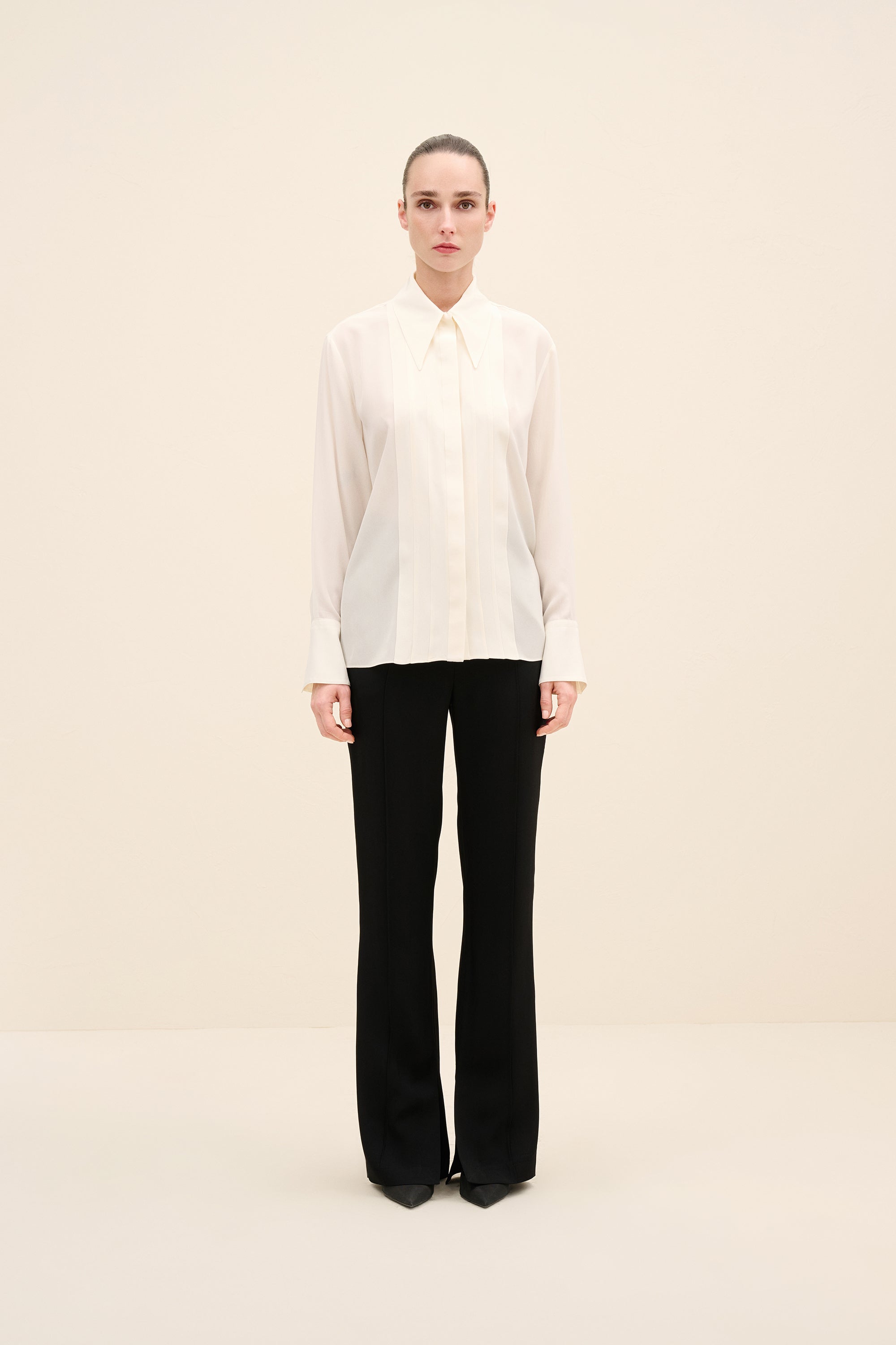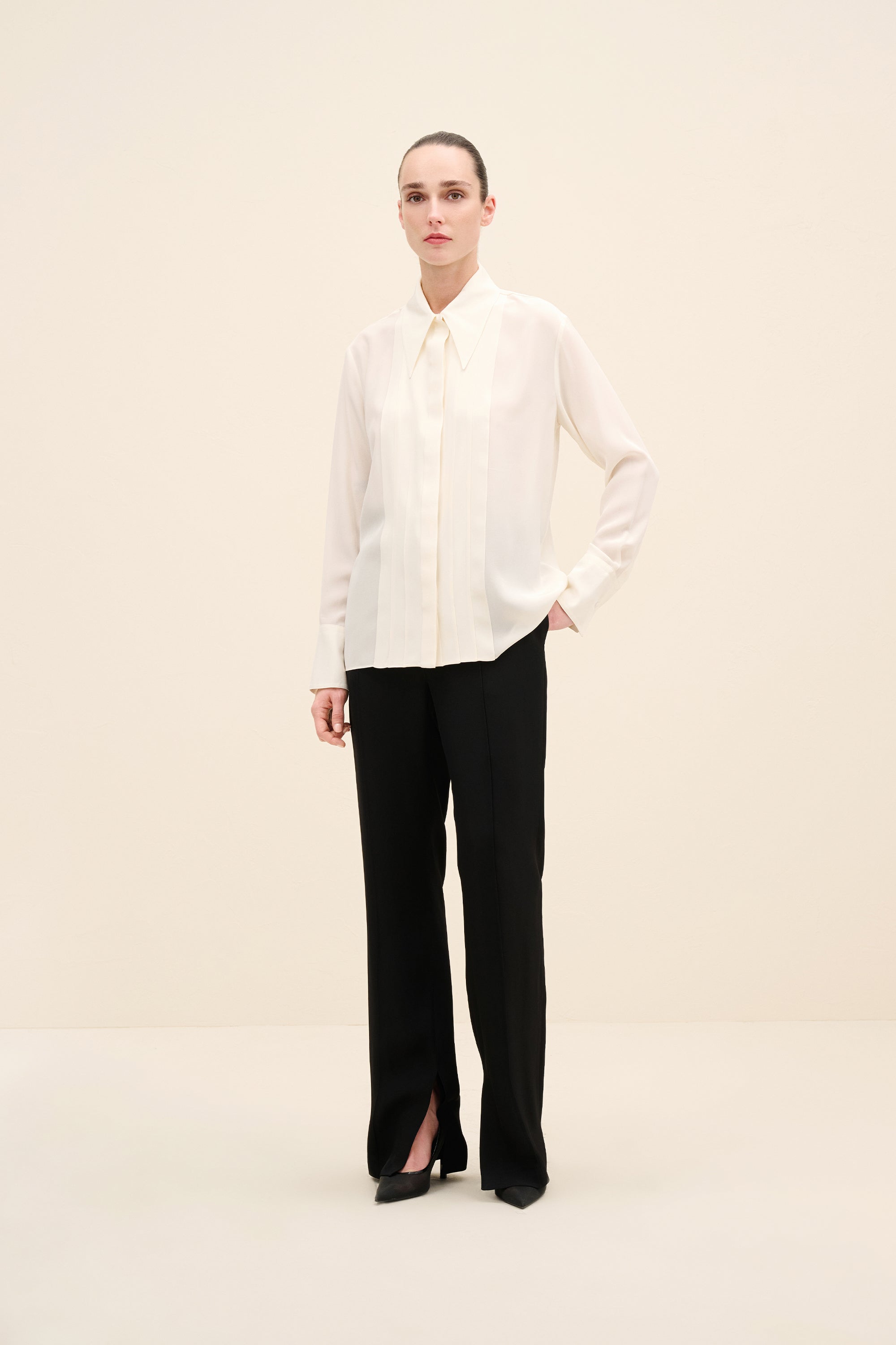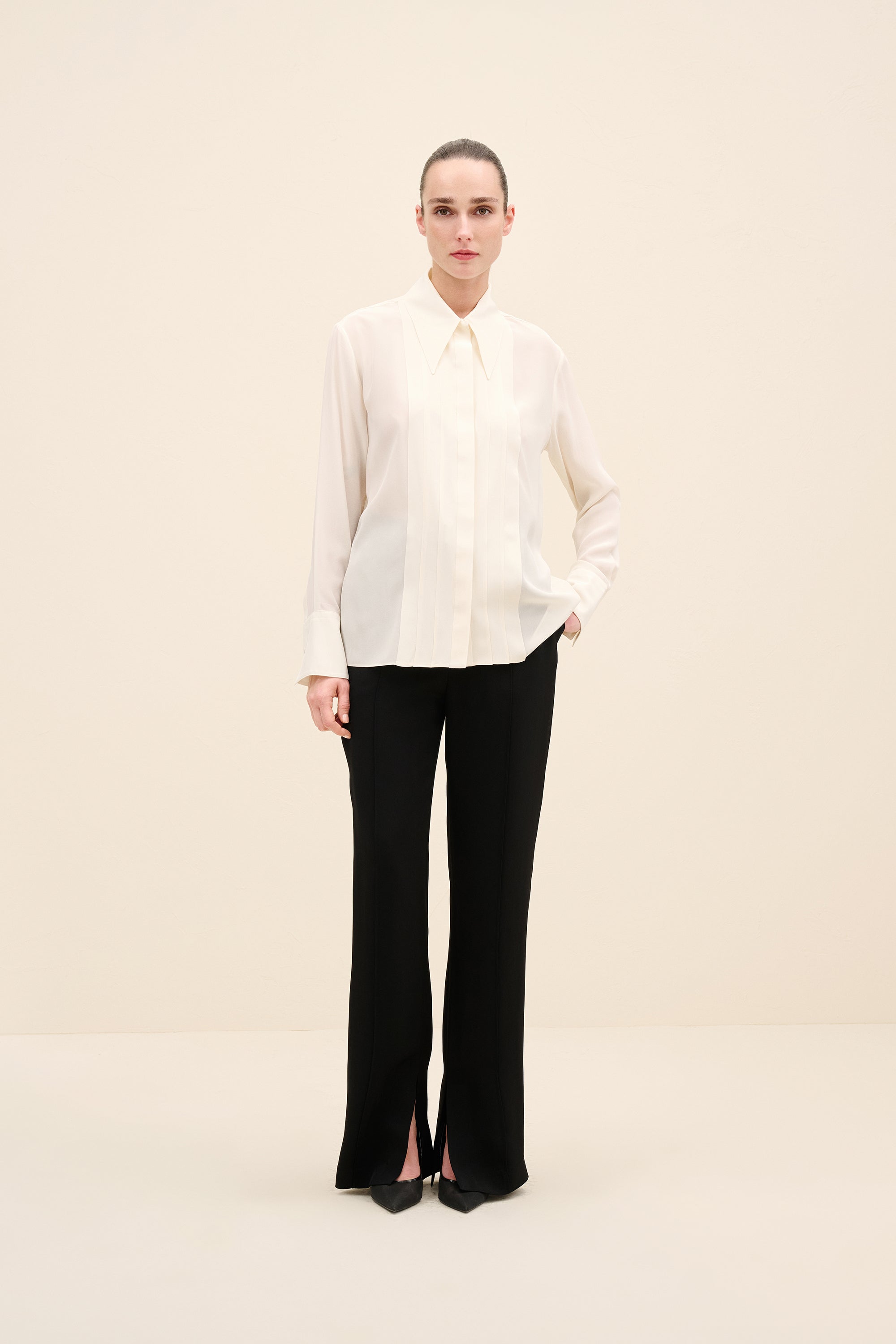 Styling Notes : Wear fully buttoned for a sharp, tailored look, or soften the neckline slightly for evening refinement. Tuck into high-waisted trousers to emphasize the elongated pleat detailing.