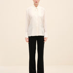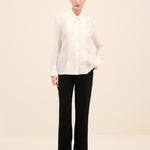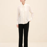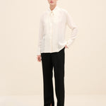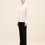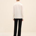 A sharp point collar and concealed placket maintain its tailored clarity, while the relaxed silhouette allows for effortless movement.