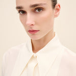 Refined and fluid in equal measure, this shirt is crafted from lightweight silk crepe with a soft, matte finish. The design is defined by elongated vertical pleats that run along the front panel, creating subtle structure and a lengthening effect.
