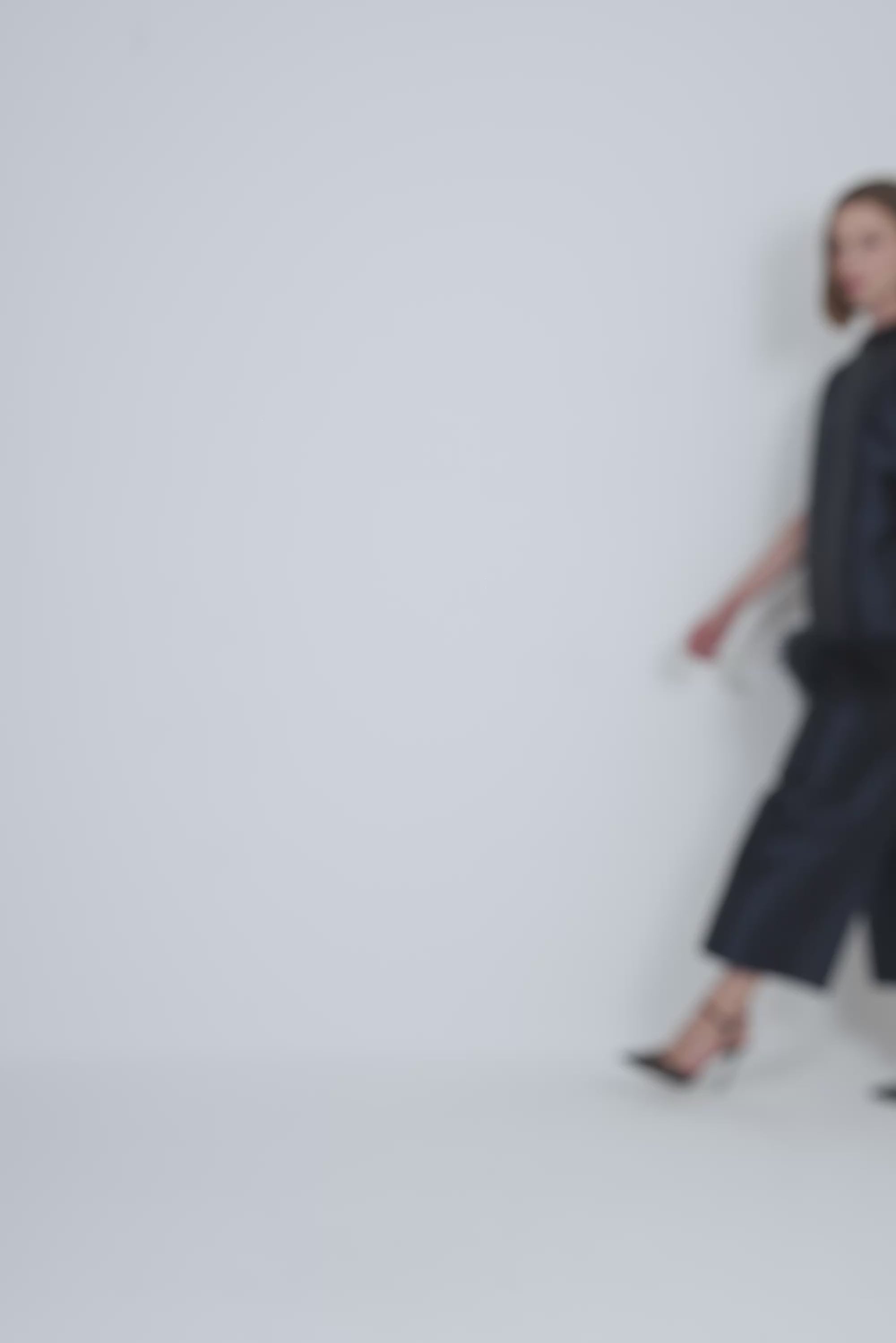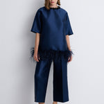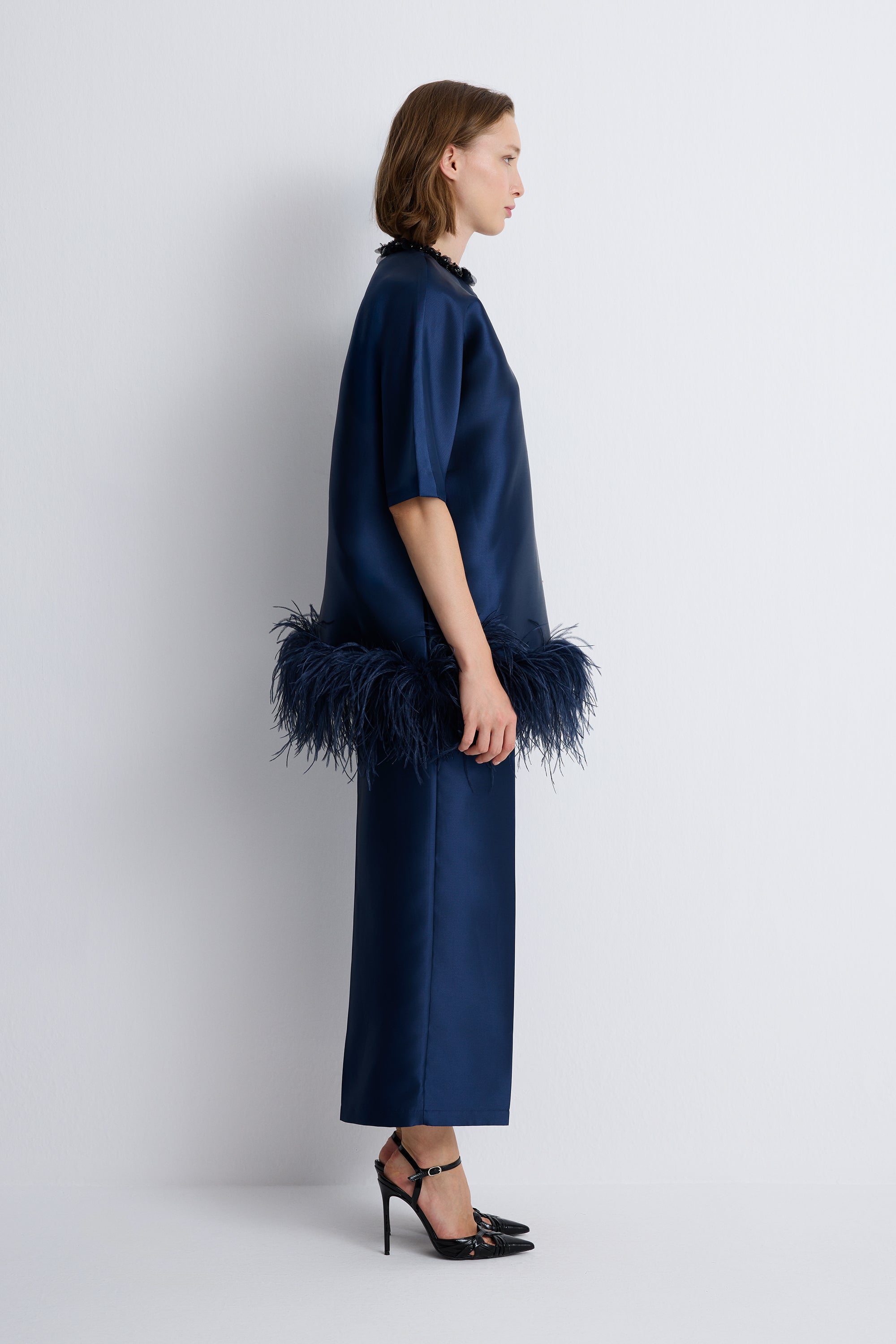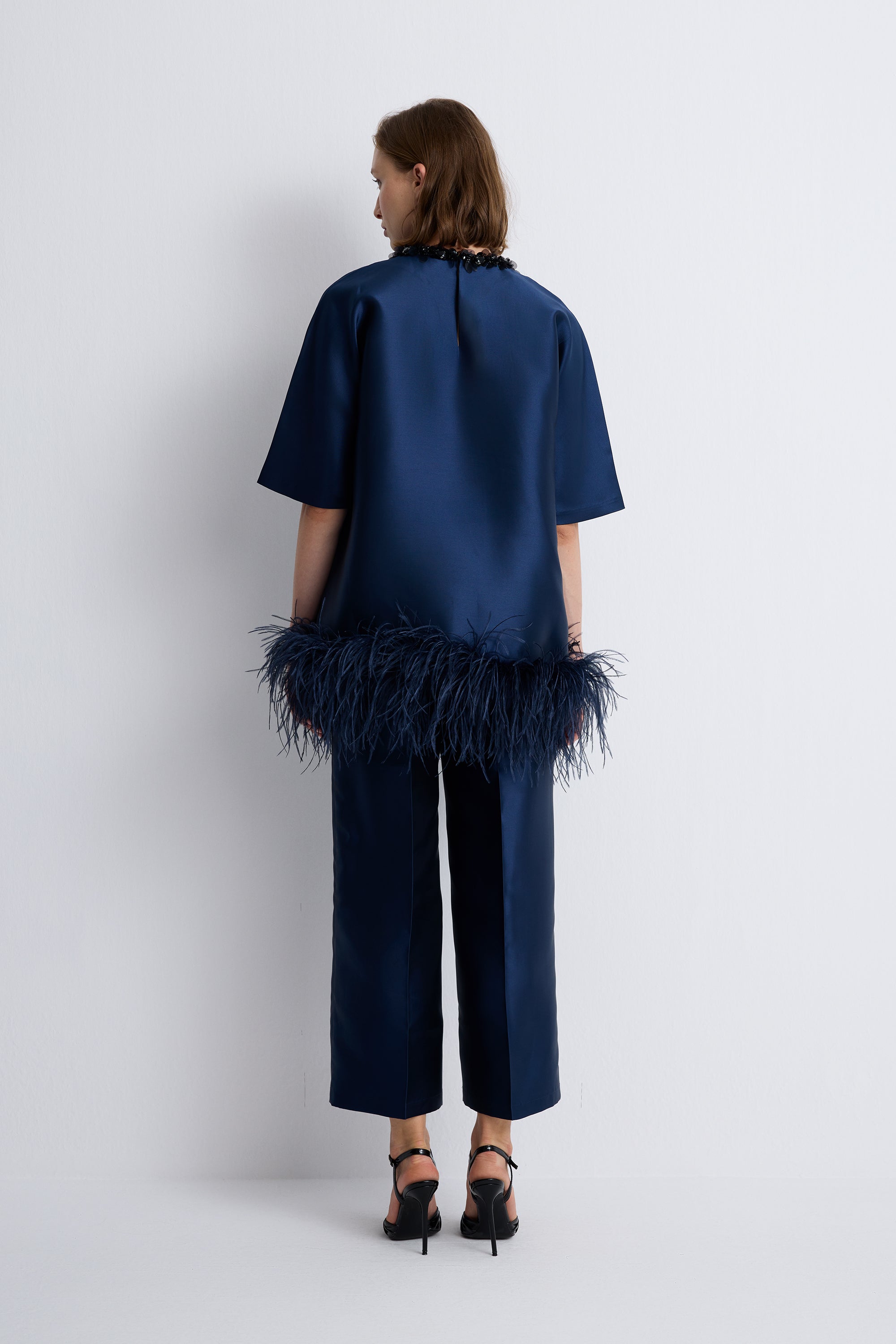A Relaxed-Fit Satin Tunic In Deep Navy With Short Sleeves And A Straight Silhouette. The Neckline Features Hand-Applied Black Bead Embellishments, While The Hemline Is Finished With Luxe Feather Trim For Movement And Drama. An Elevated Statement Piece For Evening Styling.