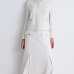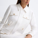 A Refined Cropped Jacket Crafted In Ivory, Embodying Understated Elegance. Detailed With Delicate Gold-Tone Buttons And Subtle Flap Pockets, It Blends Classic Tailoring With Modern Sophistication. Its Clean Silhouette Makes It A Versatile Piece For Both Day And Evening Refinement.