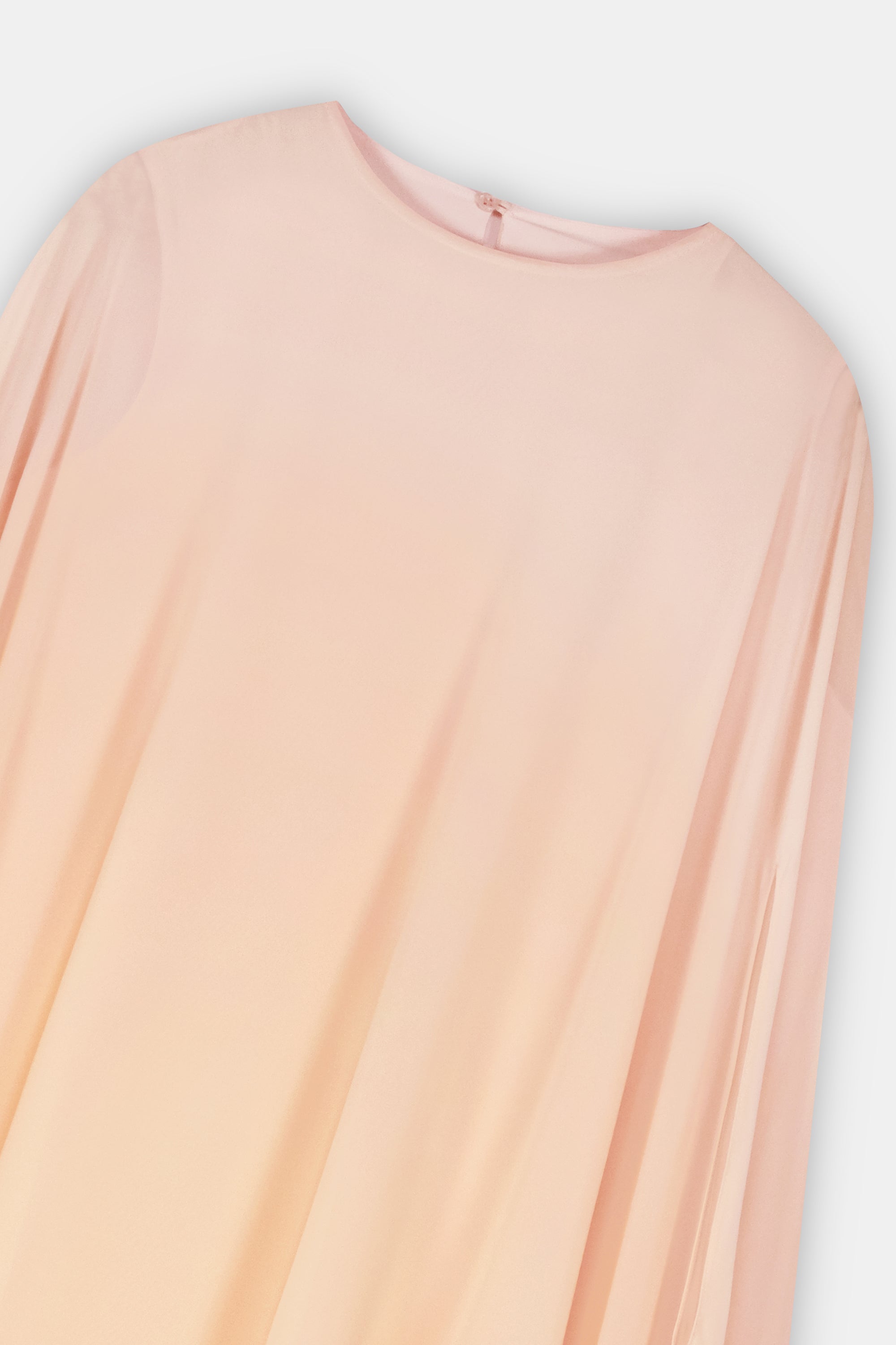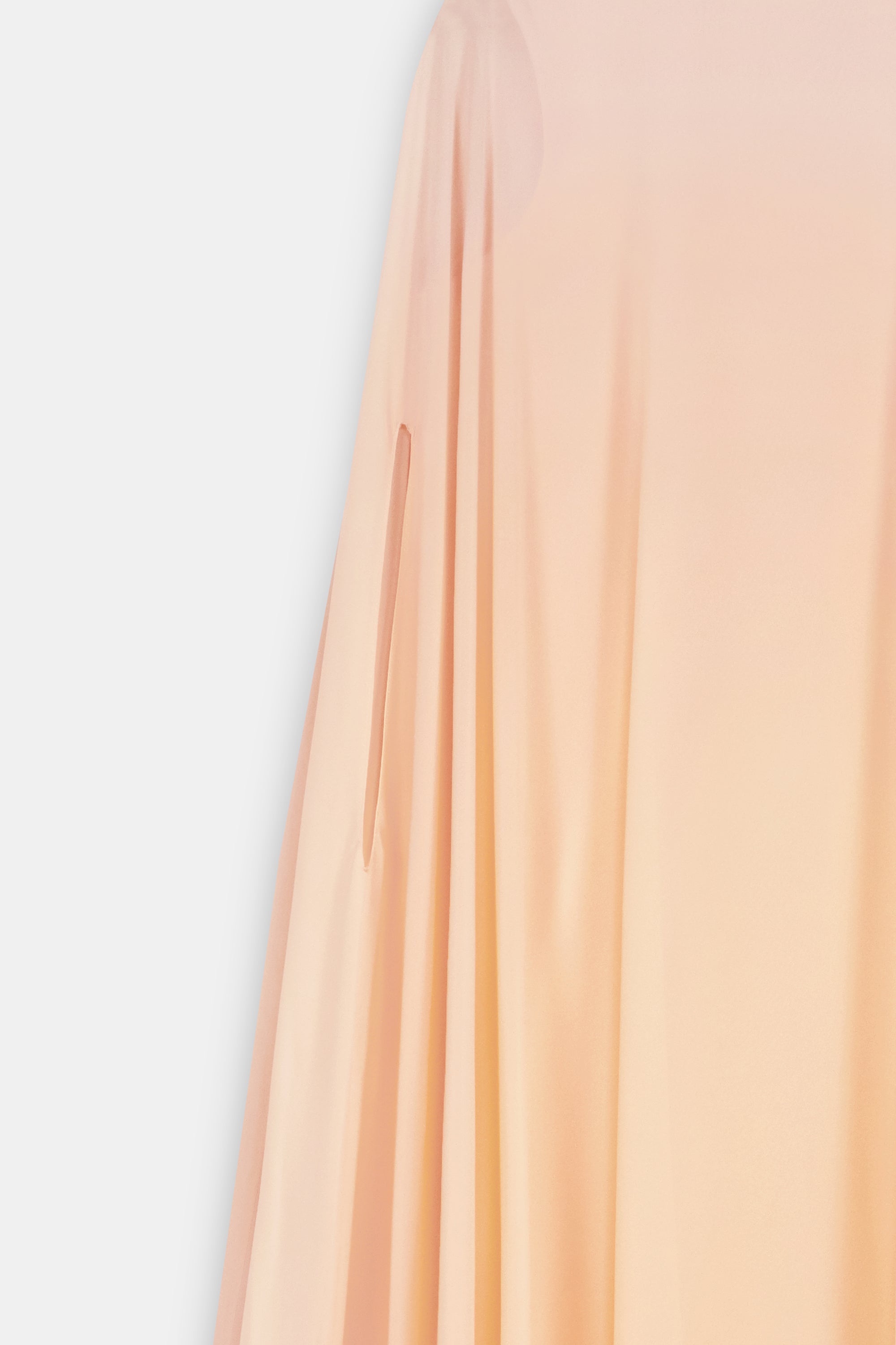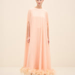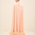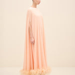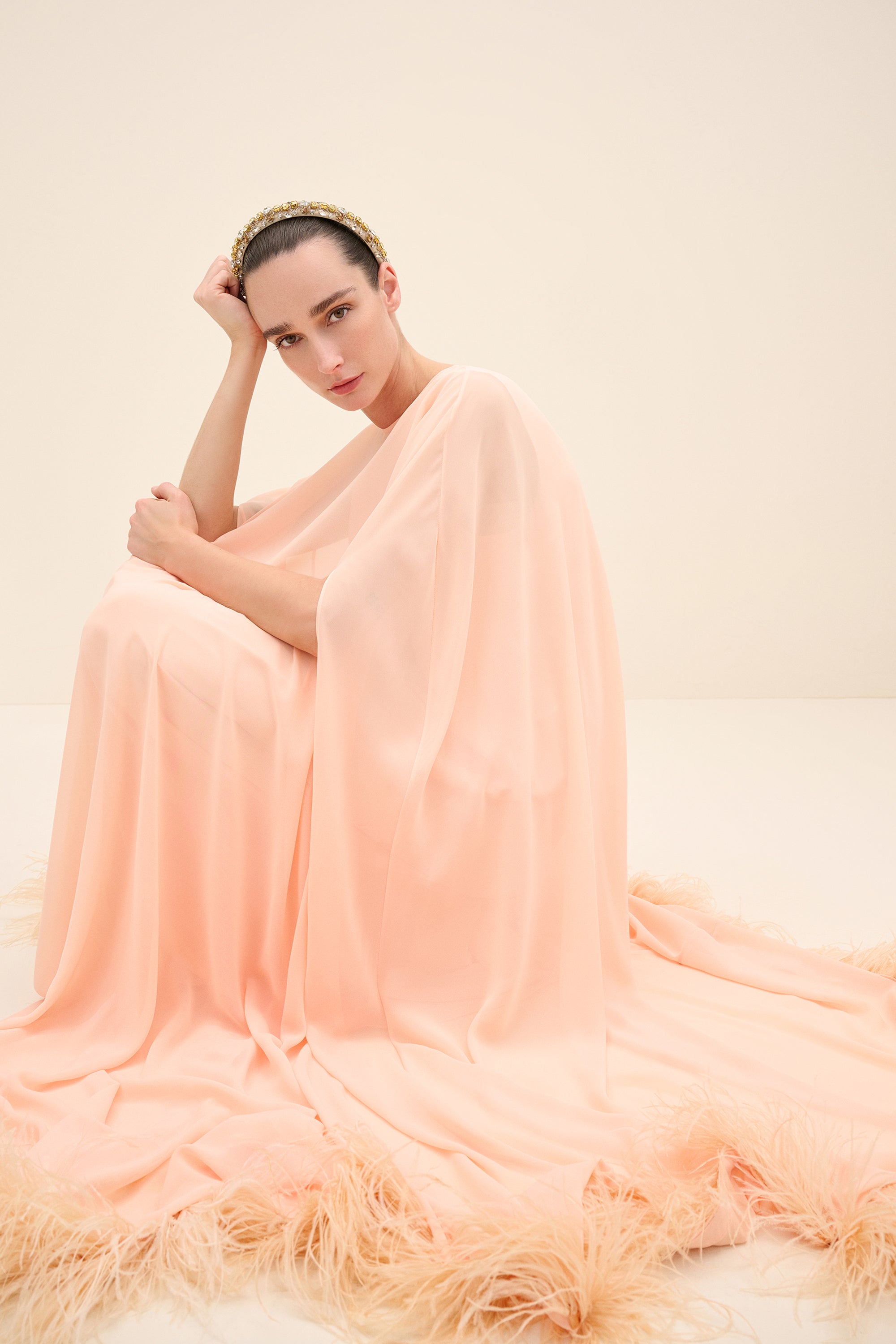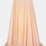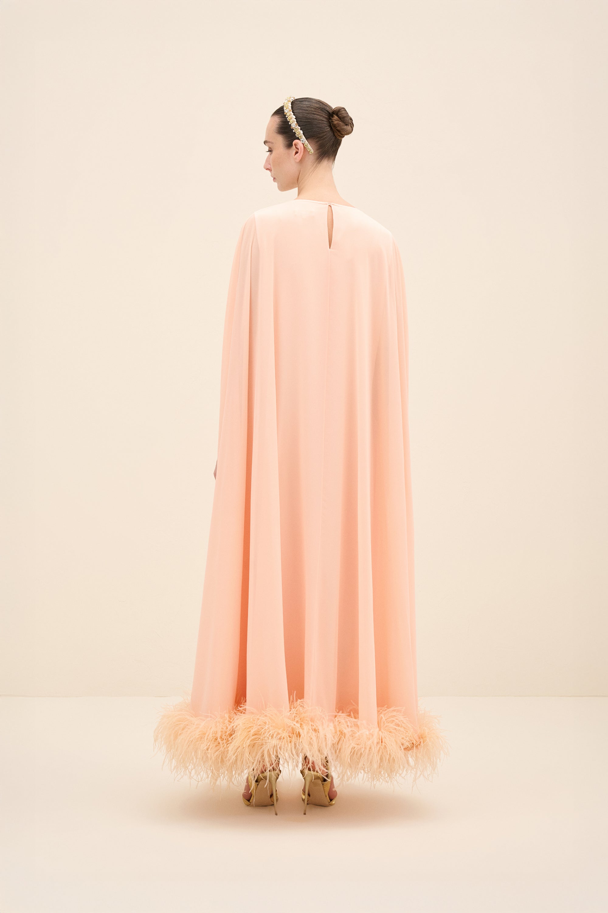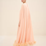 Ethereal And Effortlessly Dramatic, This Blush Maxi Dress Is Designed With A Fluid Cape Silhouette That Skims The Body And Moves Beautifully From Every Angle. Finished With A Soft Feather Trim At The Hem, It Delivers Modern Evening Elegance With A Playful, Couture-Like Touch.