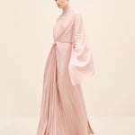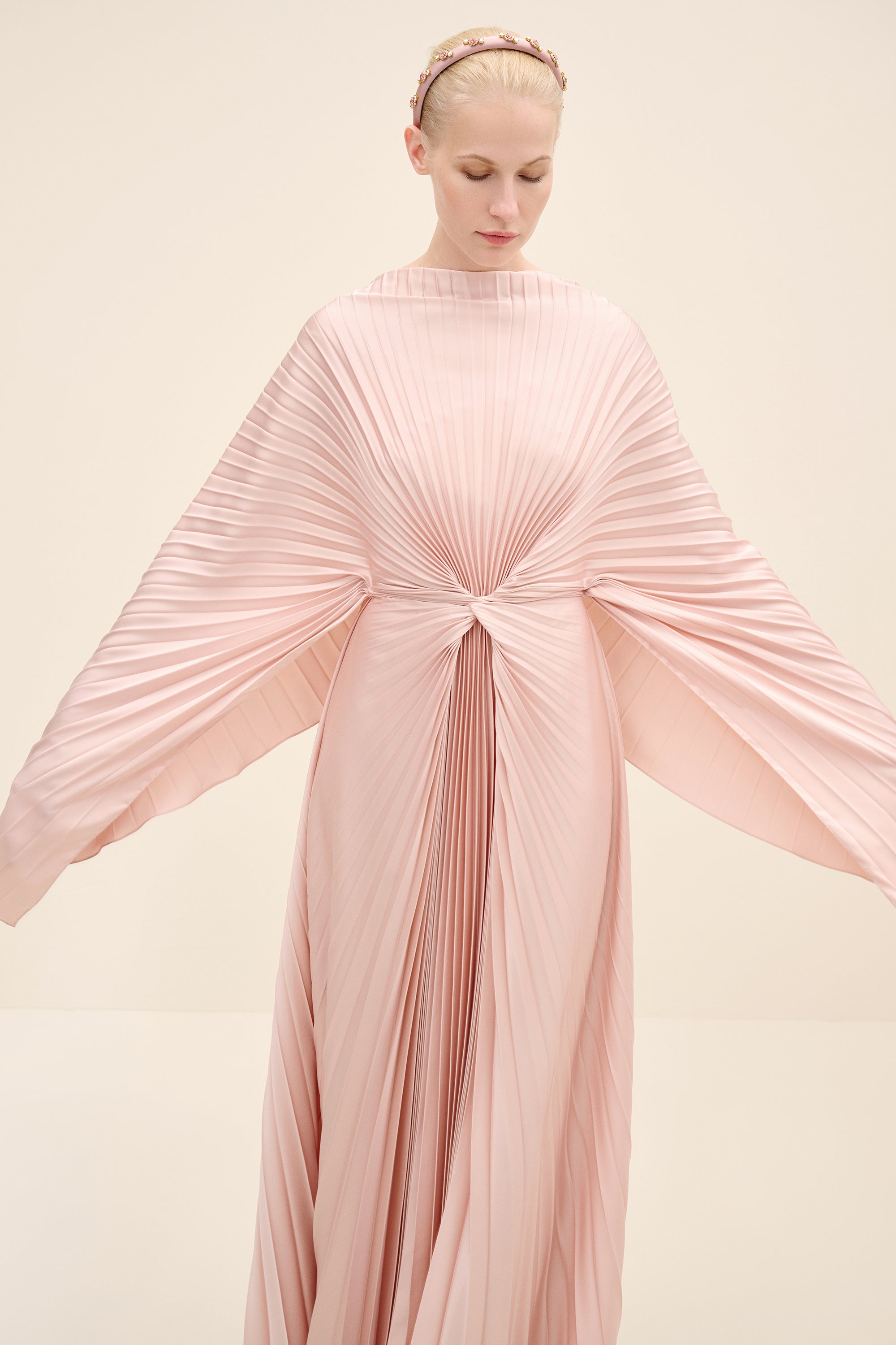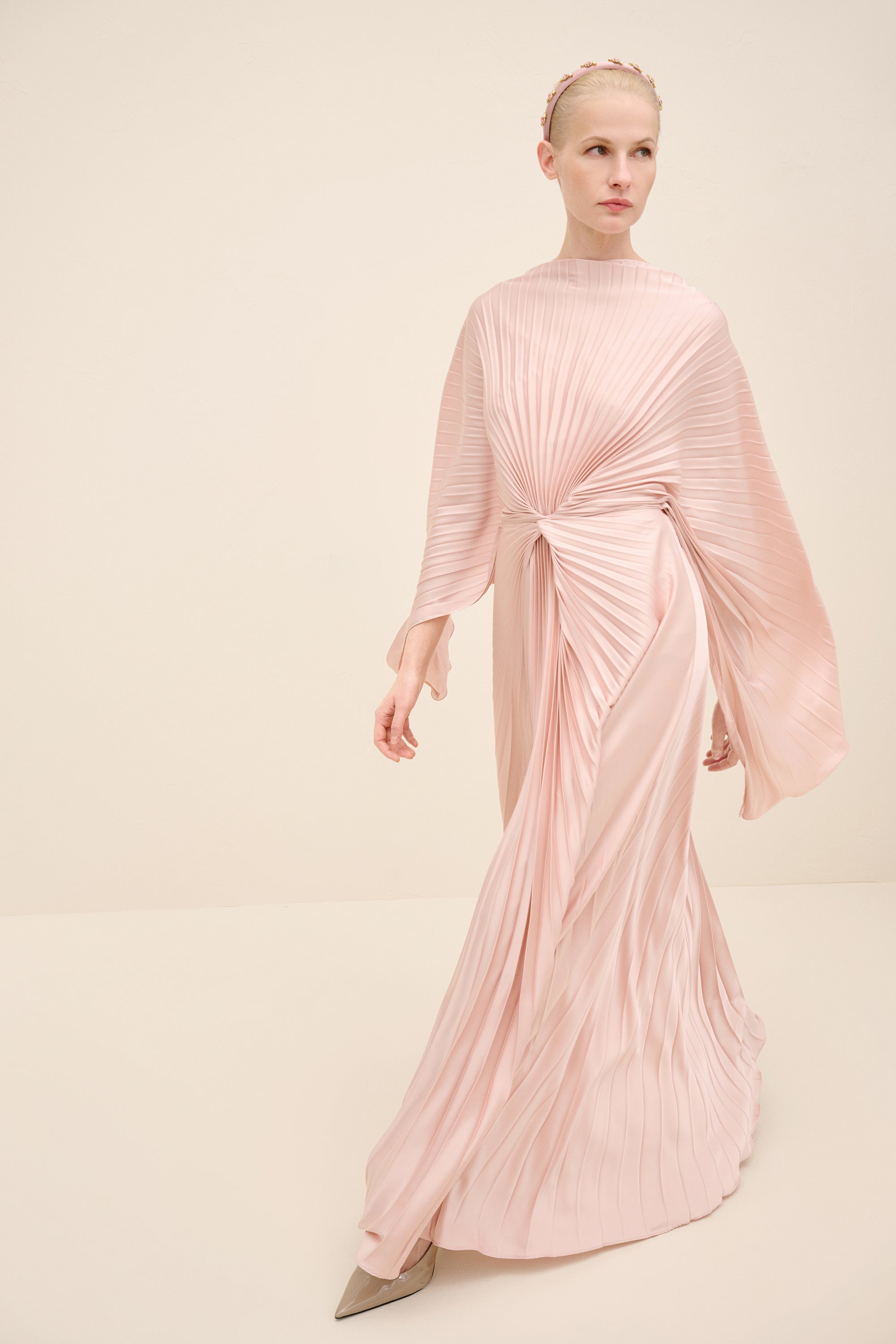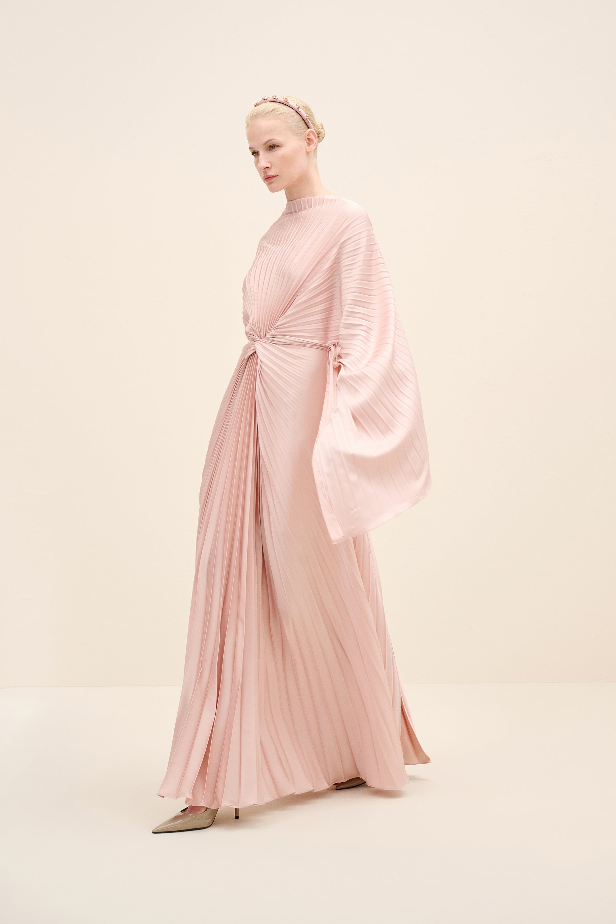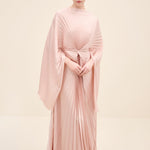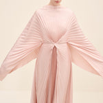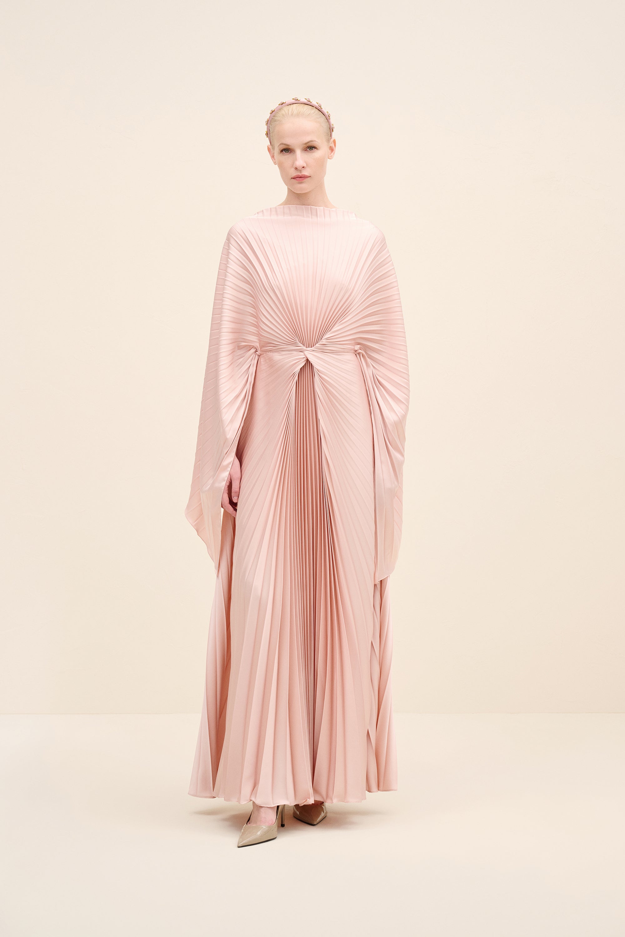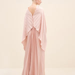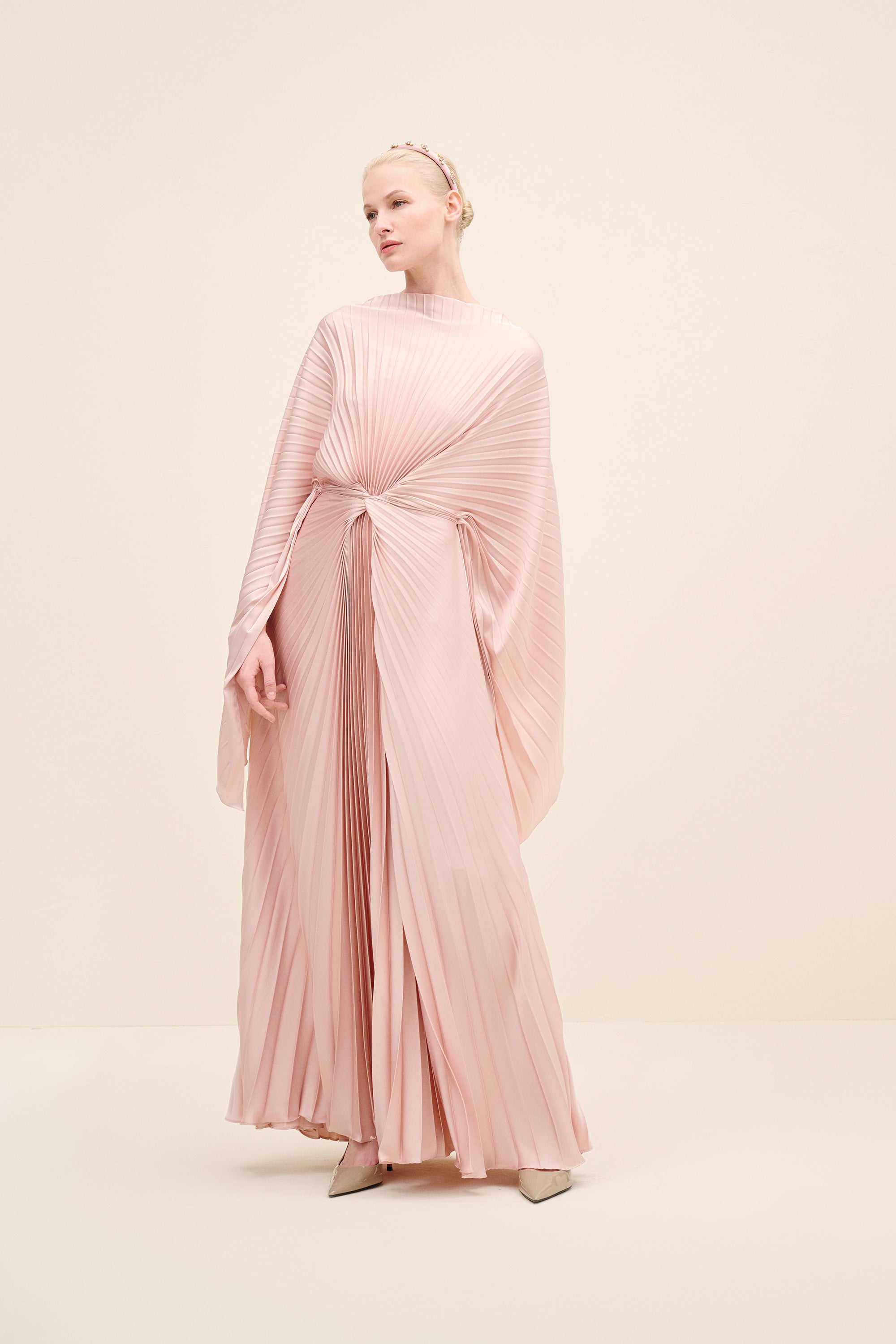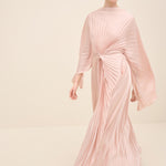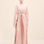 An architectural interpretation of fluid couture, this floor-length dress is crafted from finely pleated lightweight fabric, forming a dramatic radial drape that gathers at the center front. The silhouette features a cape-like upper layer that cascades seamlessly over the shoulders, blending into a fluid pleated skirt. the sculpted knot detail at the waist creates dimensional movement while elongating the figure.