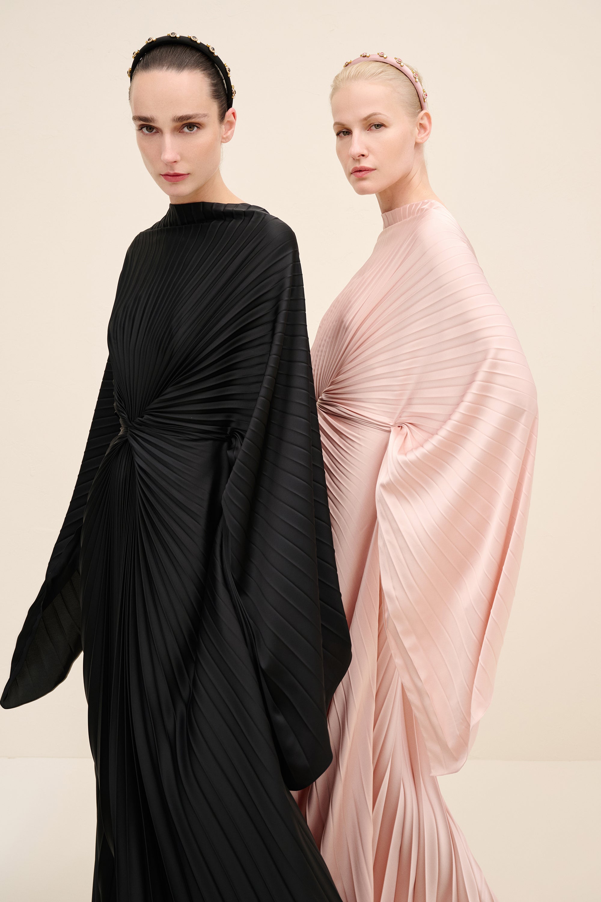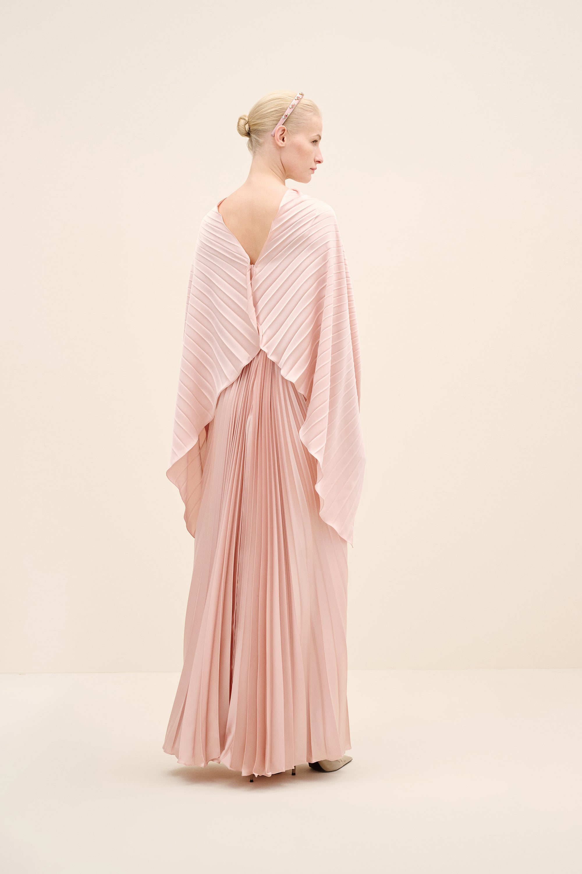 Styling Notes : Keep accessories minimal to allow the pleating to command attention. pair with sleek pointed heels or metallic accents for evening presence. hair styled clean and pulled back enhances the architectural lines of the neckline.