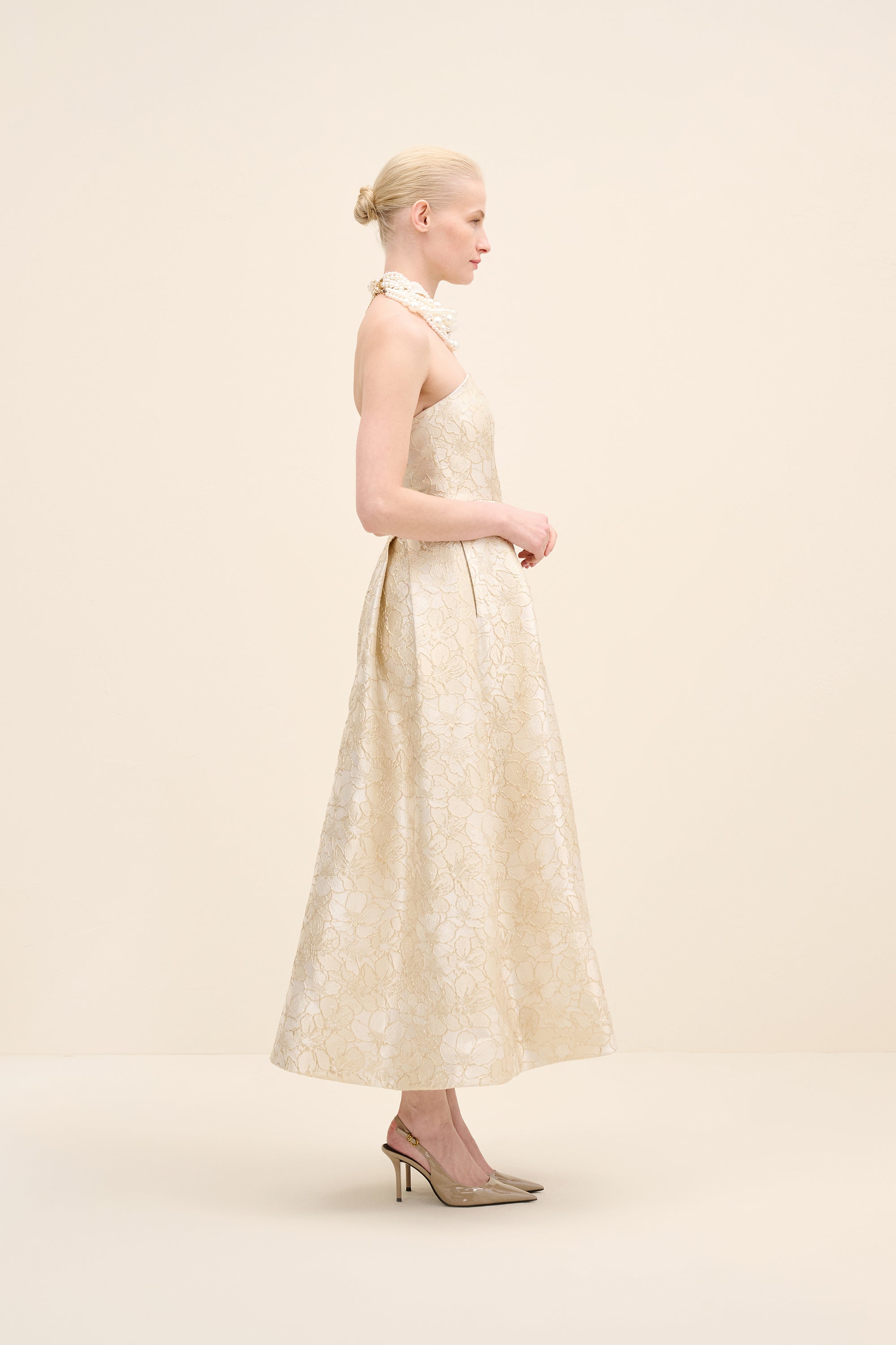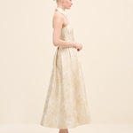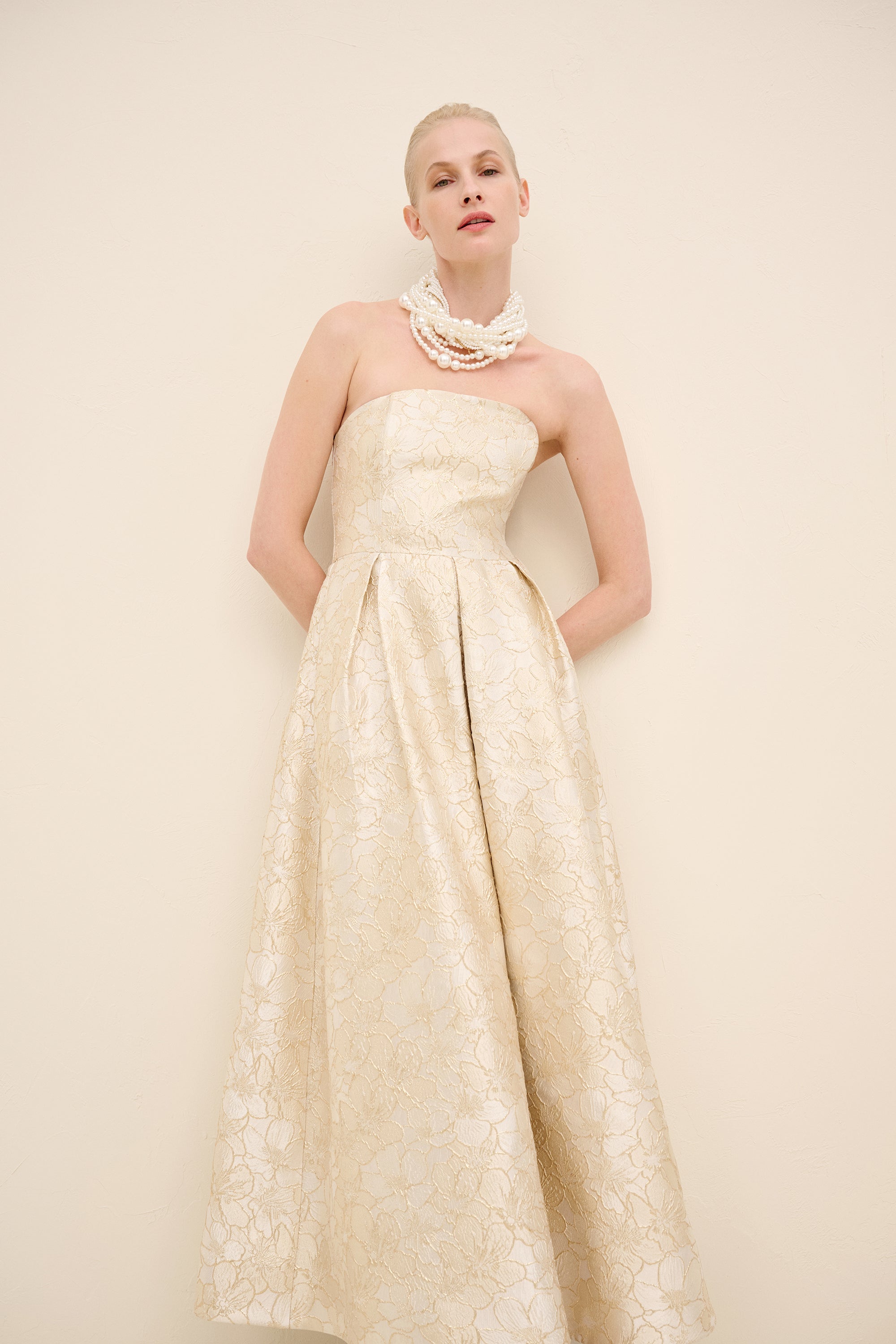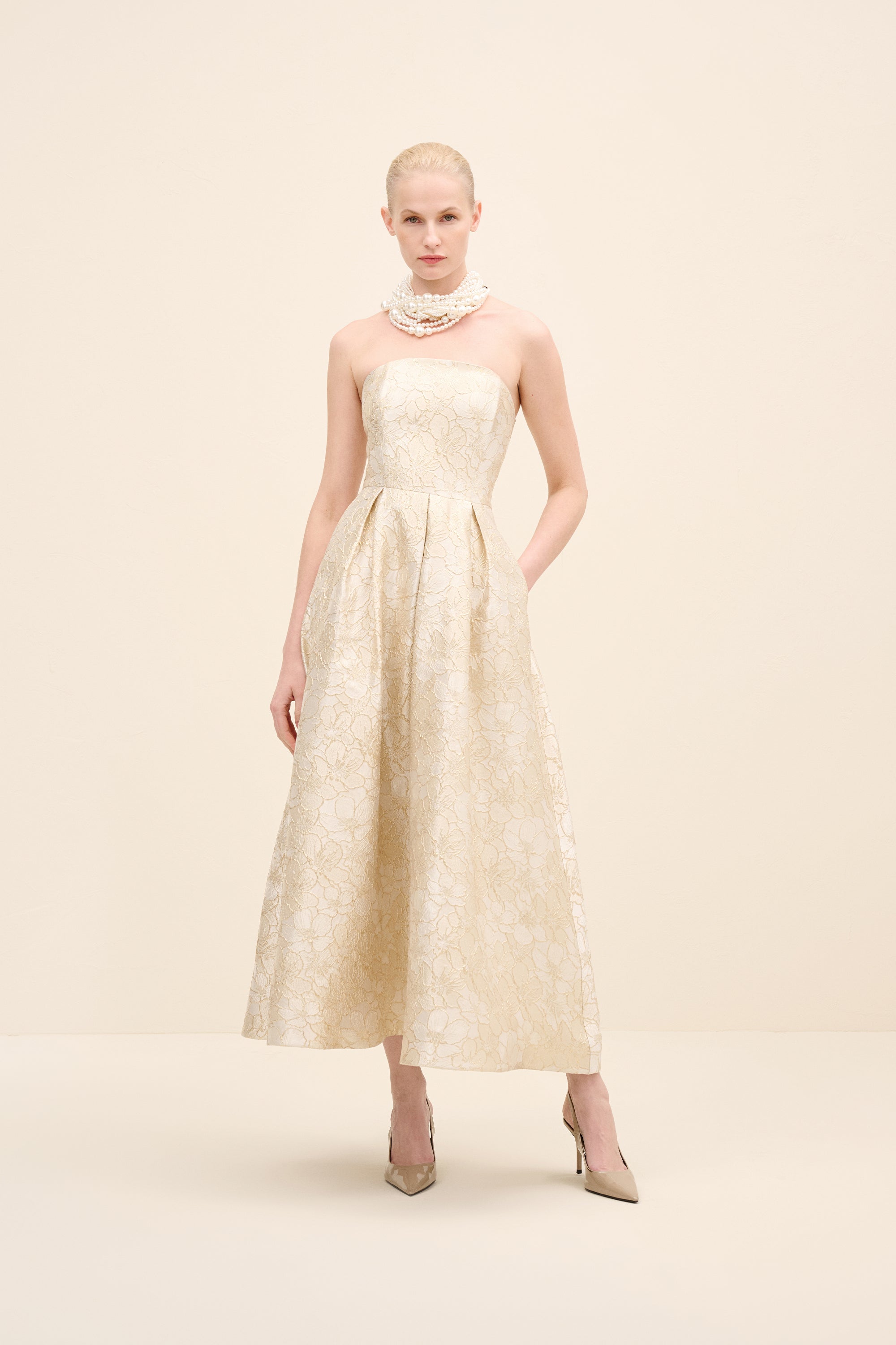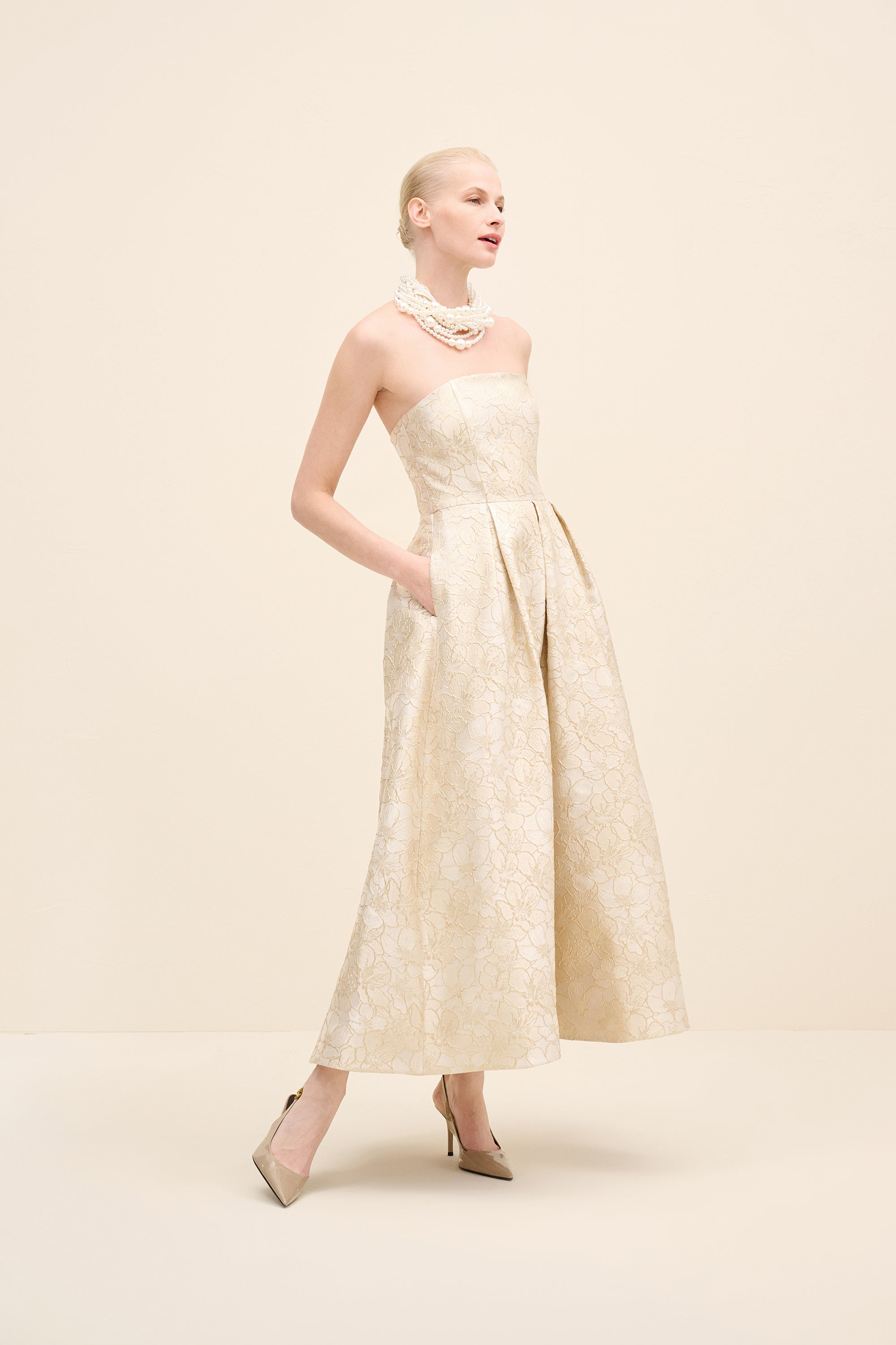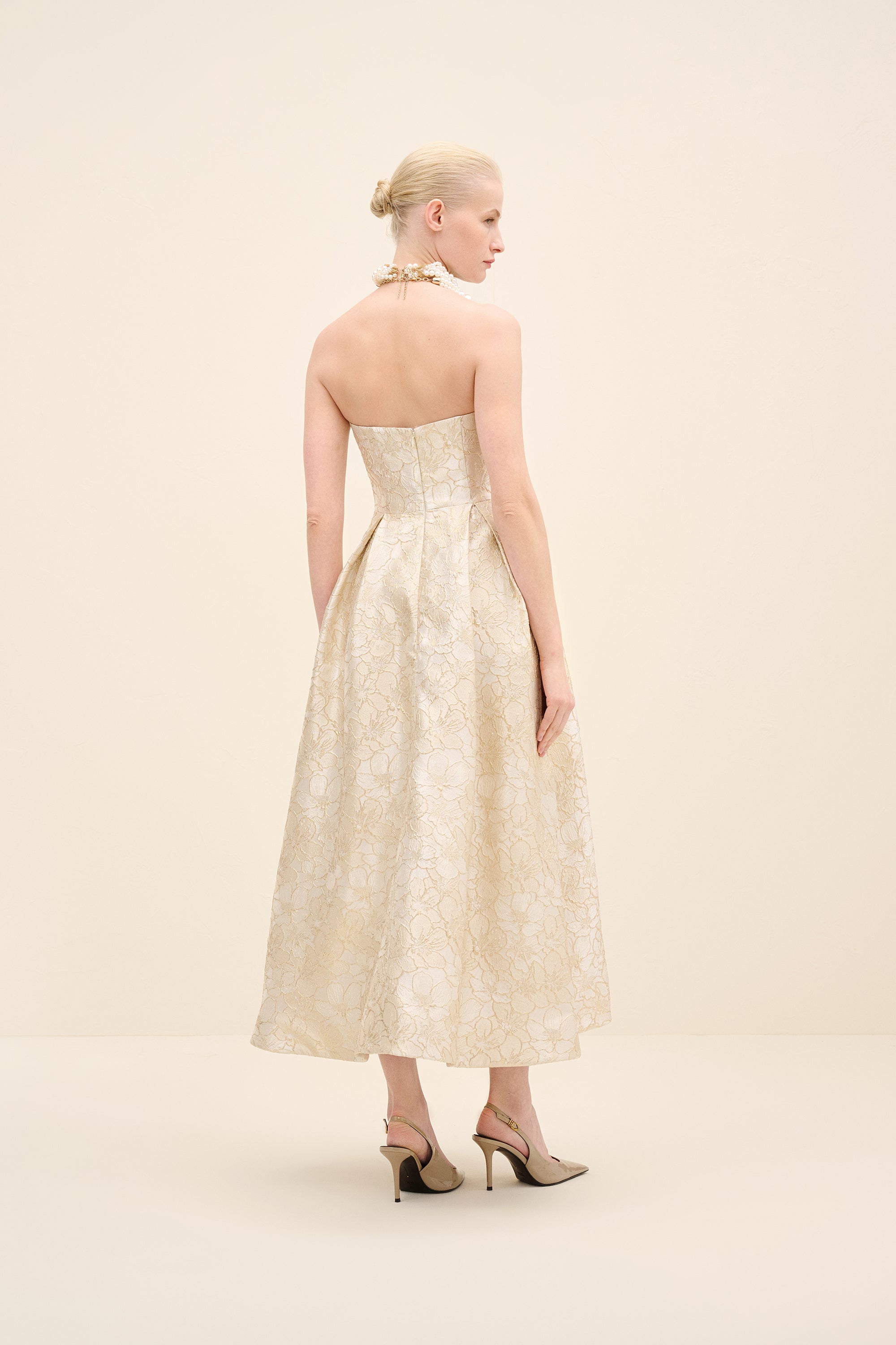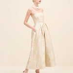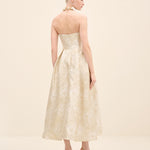 This strapless midi dress is tailored from luminous floral jacquard, sculpting the bodice before falling into a softly structured a-line skirt. The clean neckline highlights the shoulders, while precise pleating at the waist enhances volume and movement. romantic yet architectural, it embodies modern occasion dressing with couture sensibility.