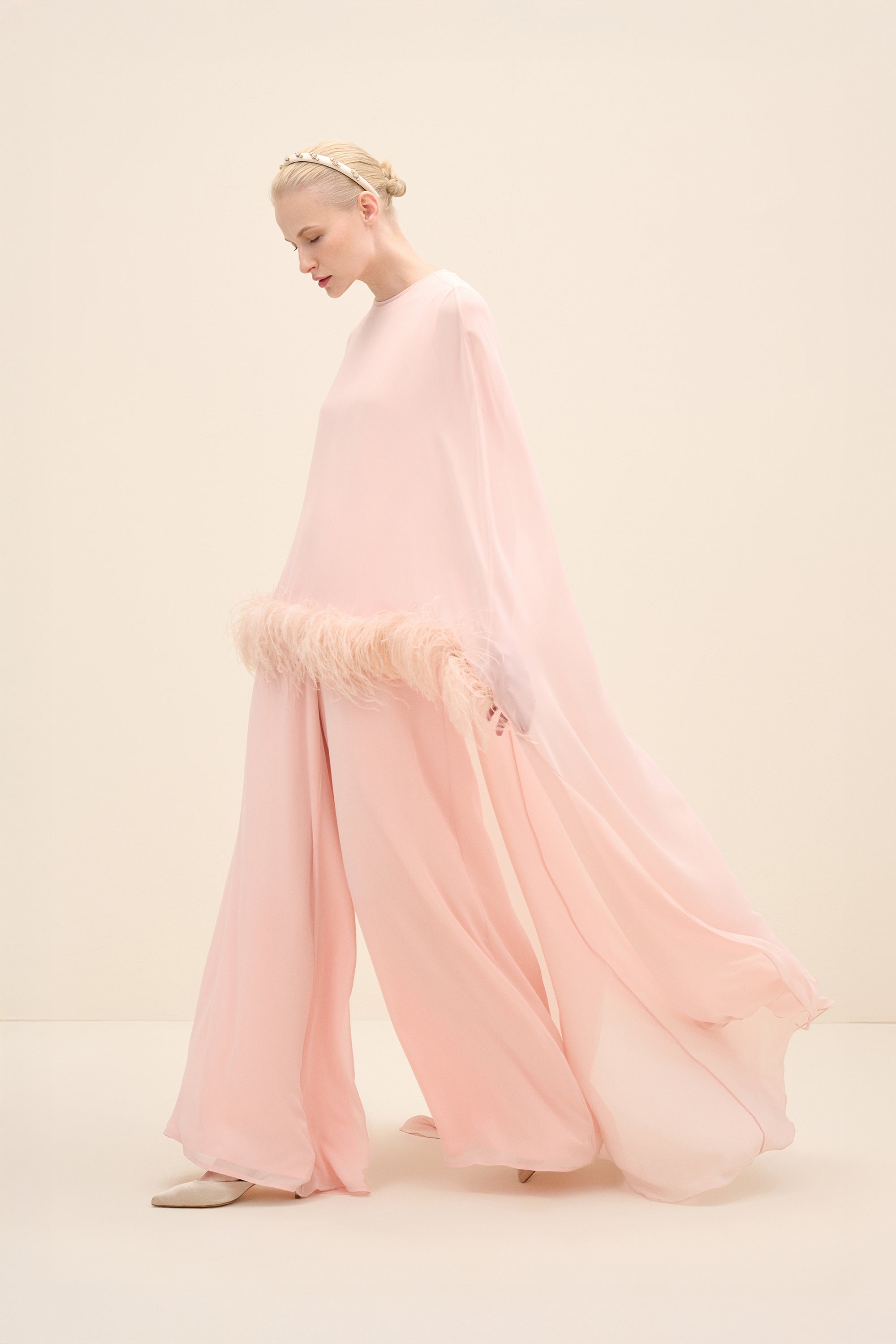 These Trousers Are Cut High On The Waist And Fall Into A Long, Wide Leg For A Clean, Elongating Effect. The Fluid Drape Pairs Perfectly With The Feather-Trim Cape Top, Creating A Polished Set That Moves Beautifully.