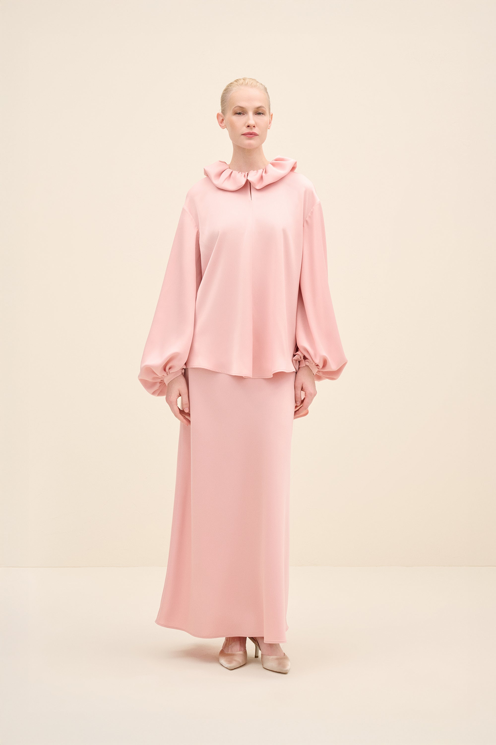 Cut To Skim The Figure, This Blush Maxi Skirt Falls In A Clean, Fluid Line With A Subtle Flare At The Hem. The High-Rise Waist Creates An Elongating Silhouette, Making It An Easy Match For Voluminous Tops And Sharp, Minimal Blouses Alike.