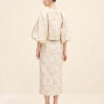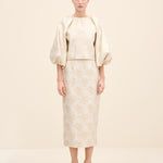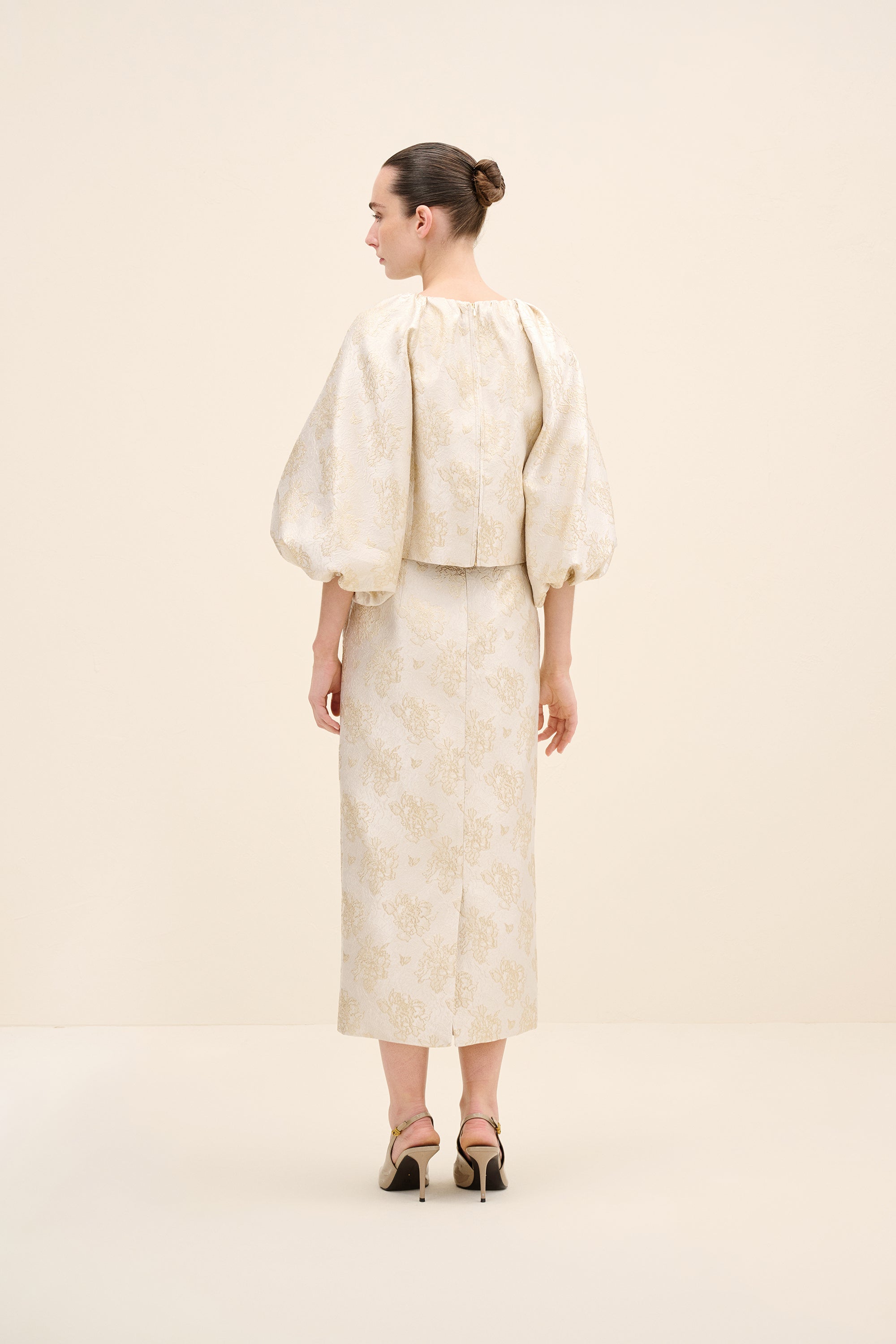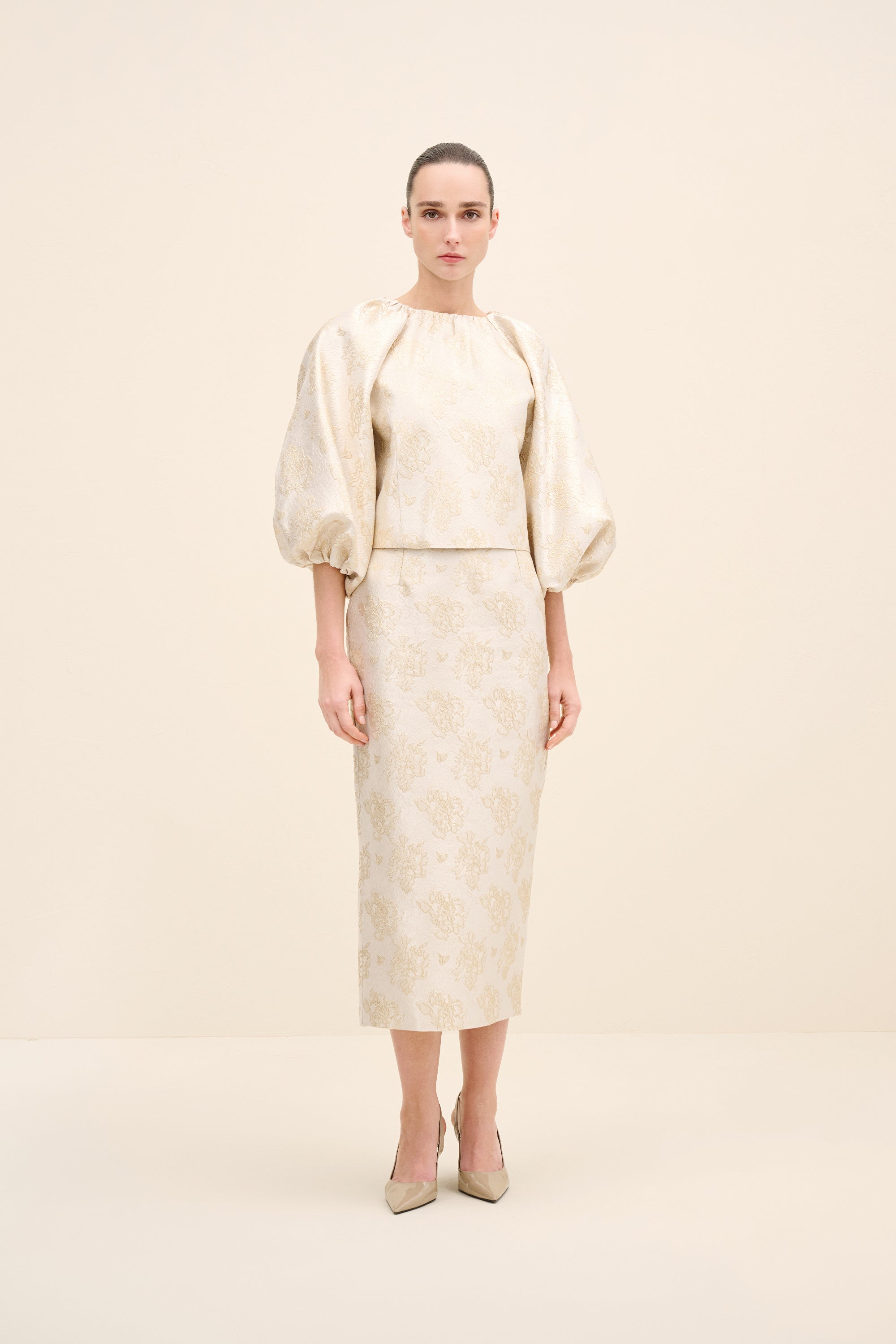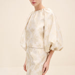 Crafted from luminous champagne jacquard woven with a delicate floral motif, this blouse balances structure and softness. the gently cropped silhouette sits precisely at the waist, while voluminous balloon sleeves create architectural contrast. the clean round neckline enhances its refined simplicity, allowing the rich texture of the fabric to take center stage. Feminine yet sculptural, it is designed for elevated occasion dressing.