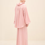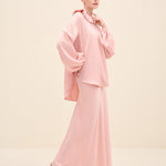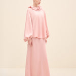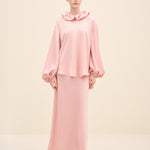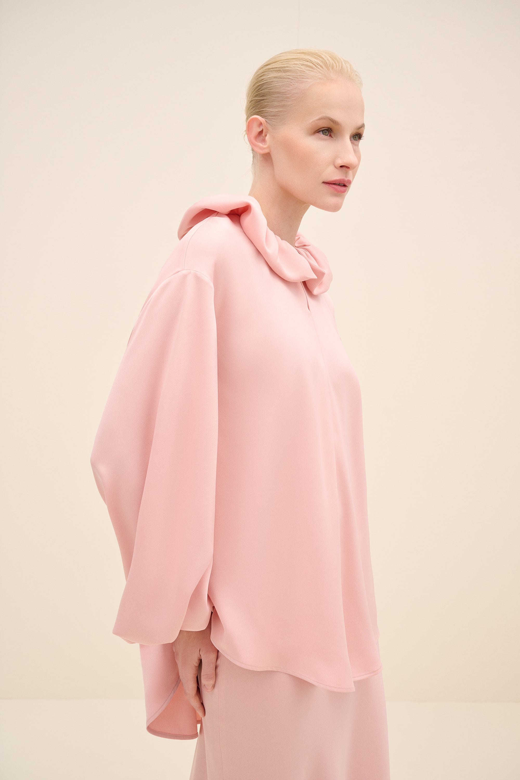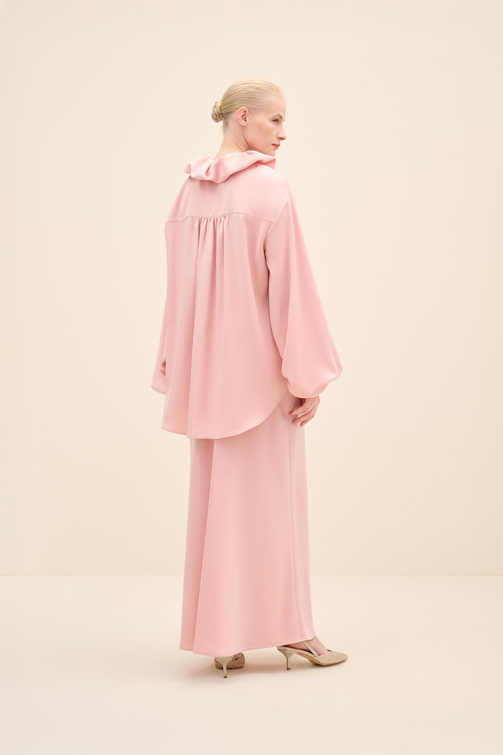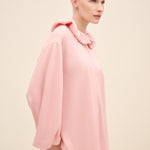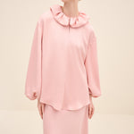 A Modern Romantic Blouse In A Soft Blush Tone, Designed With An Oversized Ruffled Collar And Generous Volume Through The Sleeves. The Relaxed Silhouette Drapes Effortlessly, While Gathered Cuffs Add Shape And Polish—Perfect For Styling With The Matching Skirt