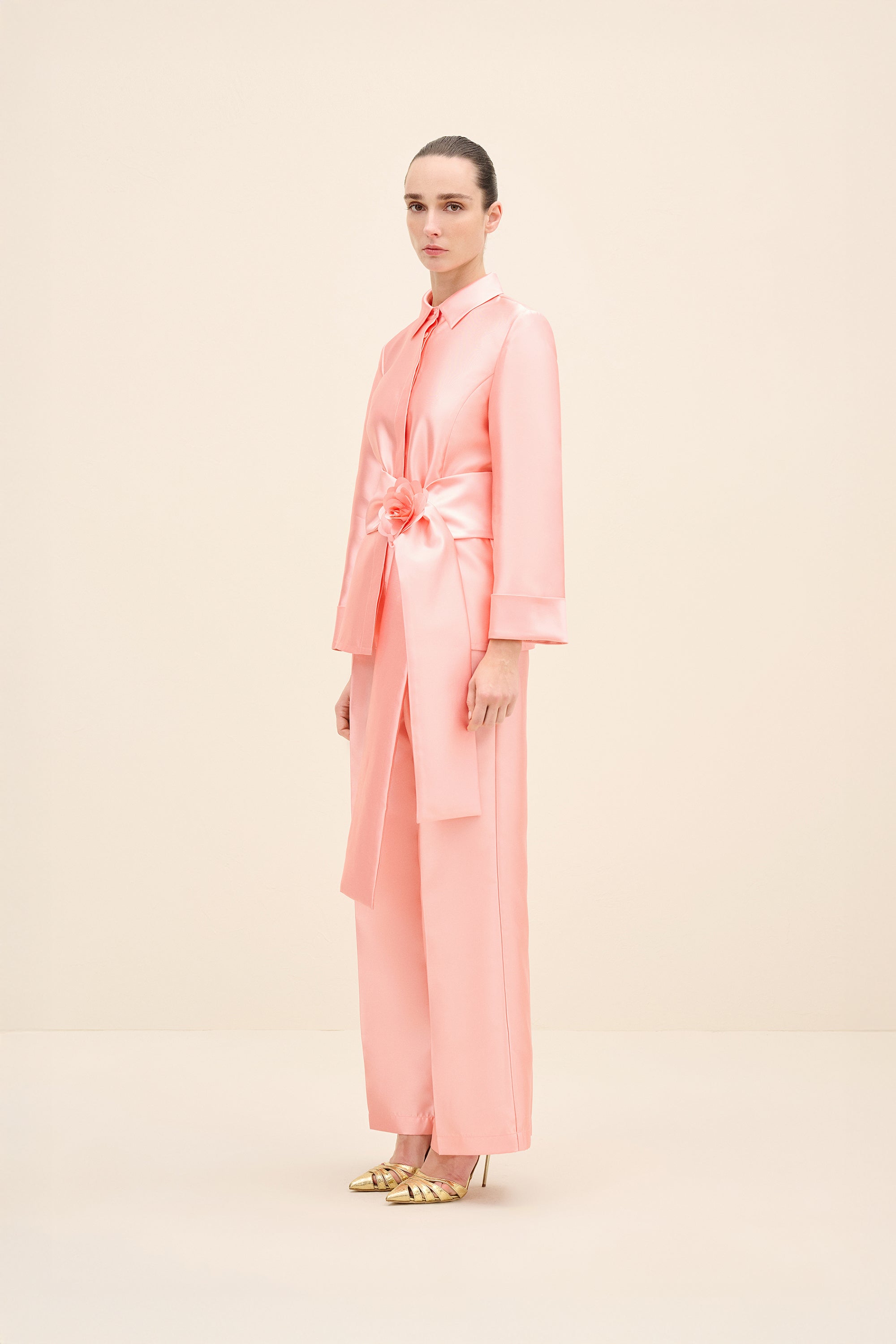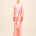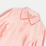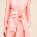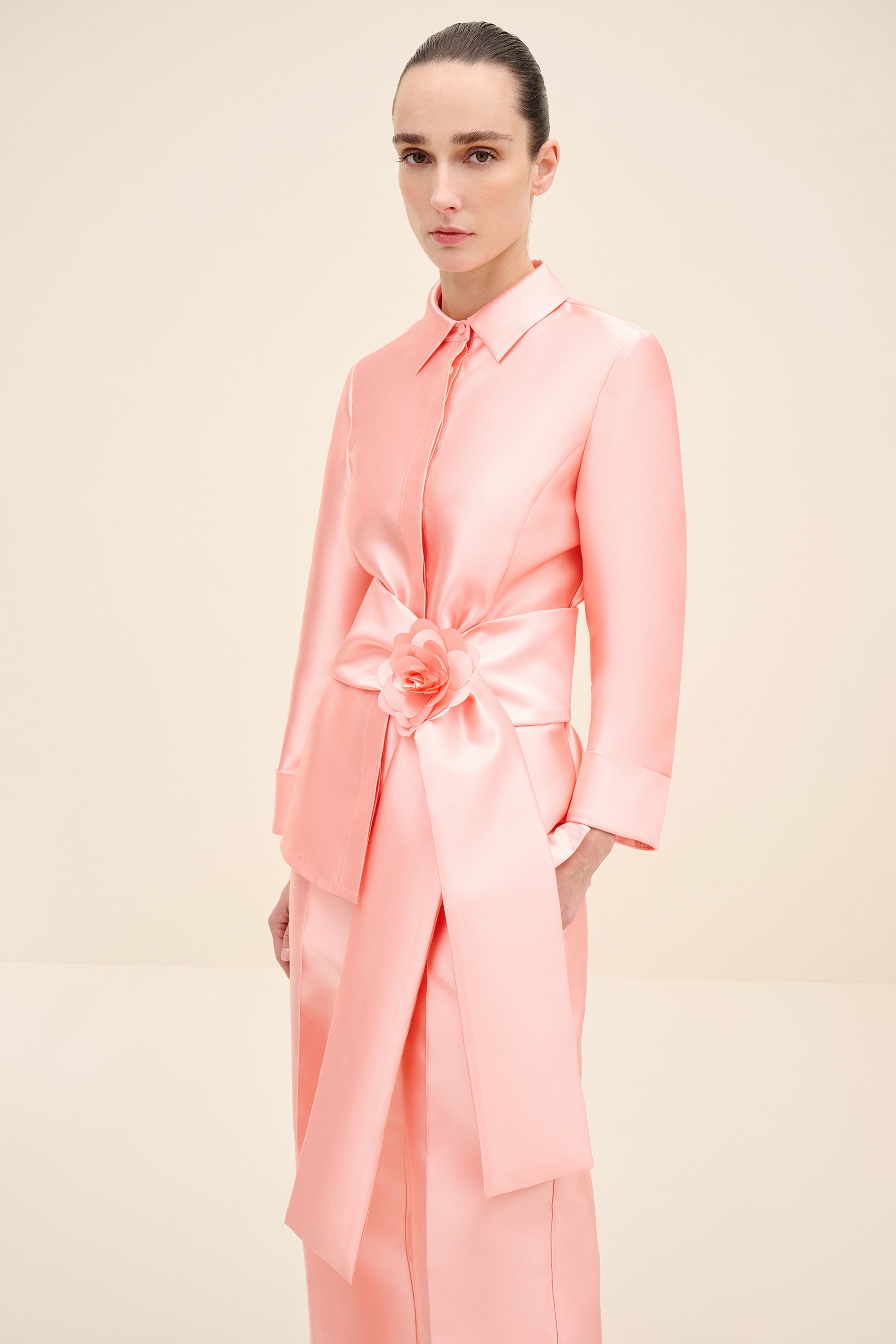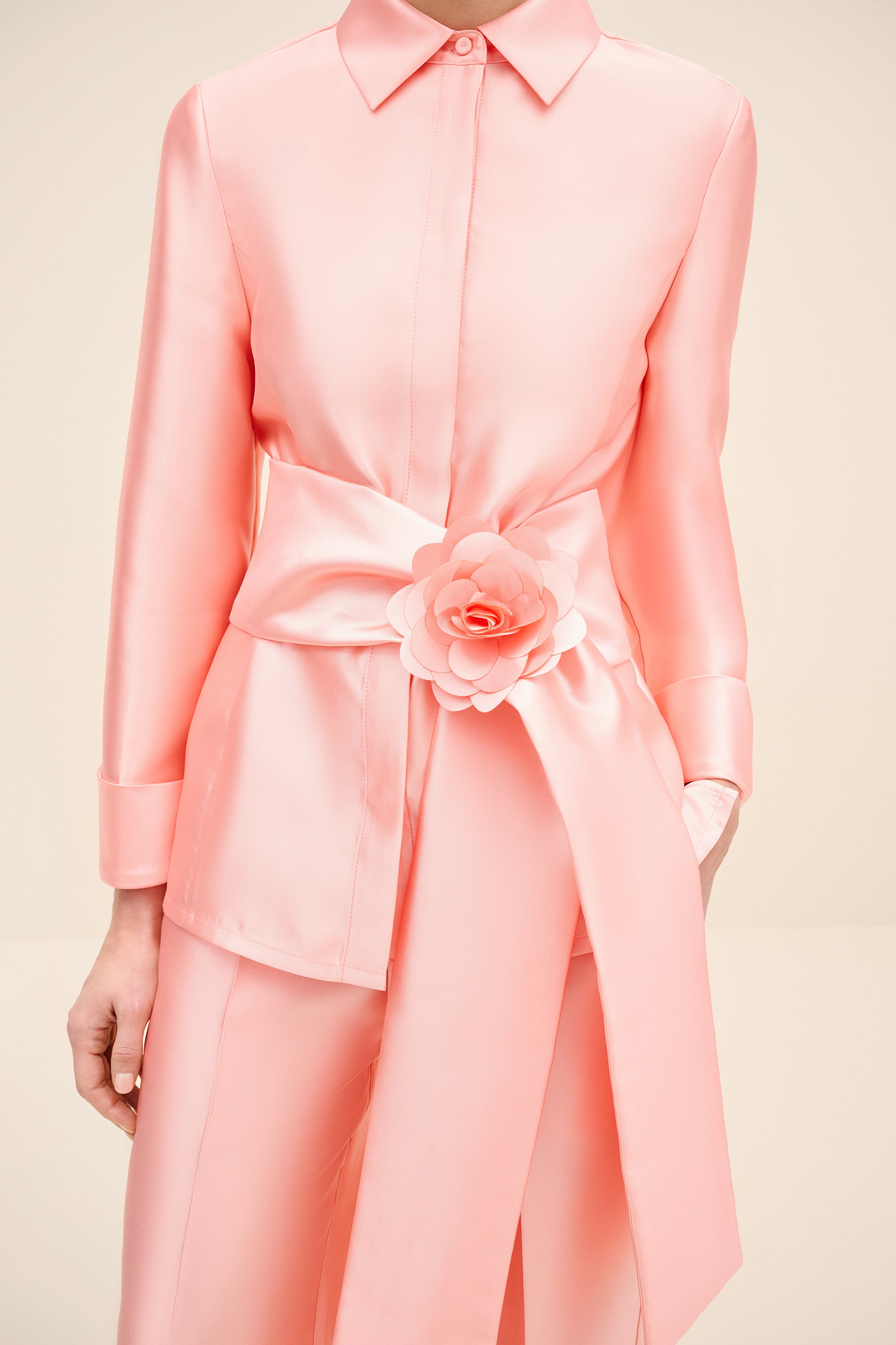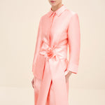 A clean, collared shirt in a pink tone. It features concealed front fastenings and a wrap waist tie, finished with a statement rosette for a polished, refined look.Styling Note: Wear it as a full look with tonal heels and minimal jewellery to let the rosette take focus. For day, switch to sleek flats and a low bun; for evening, add a metallic clutch and a bold lip.