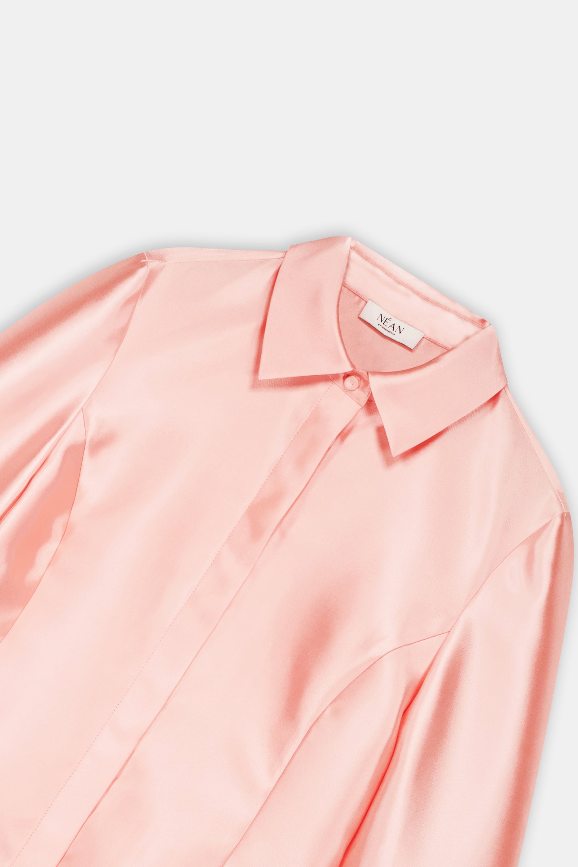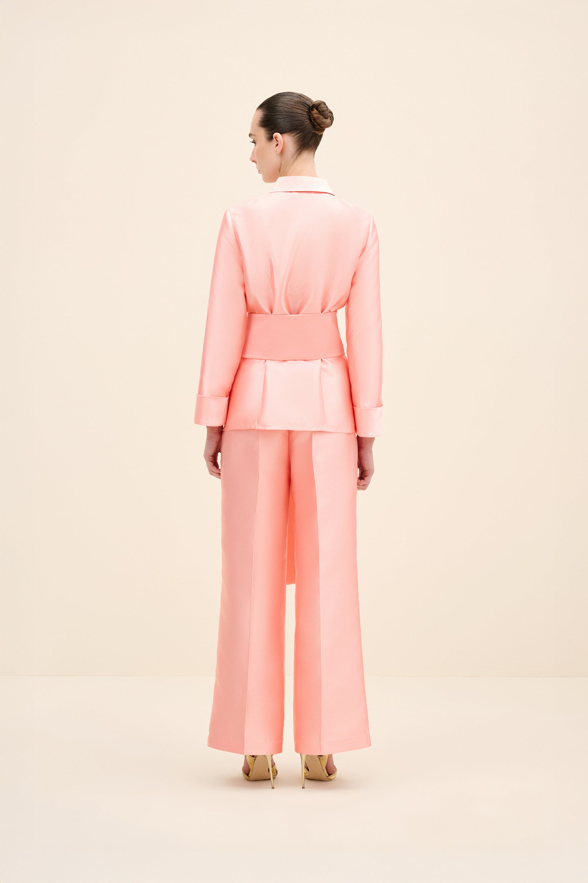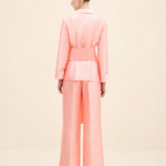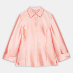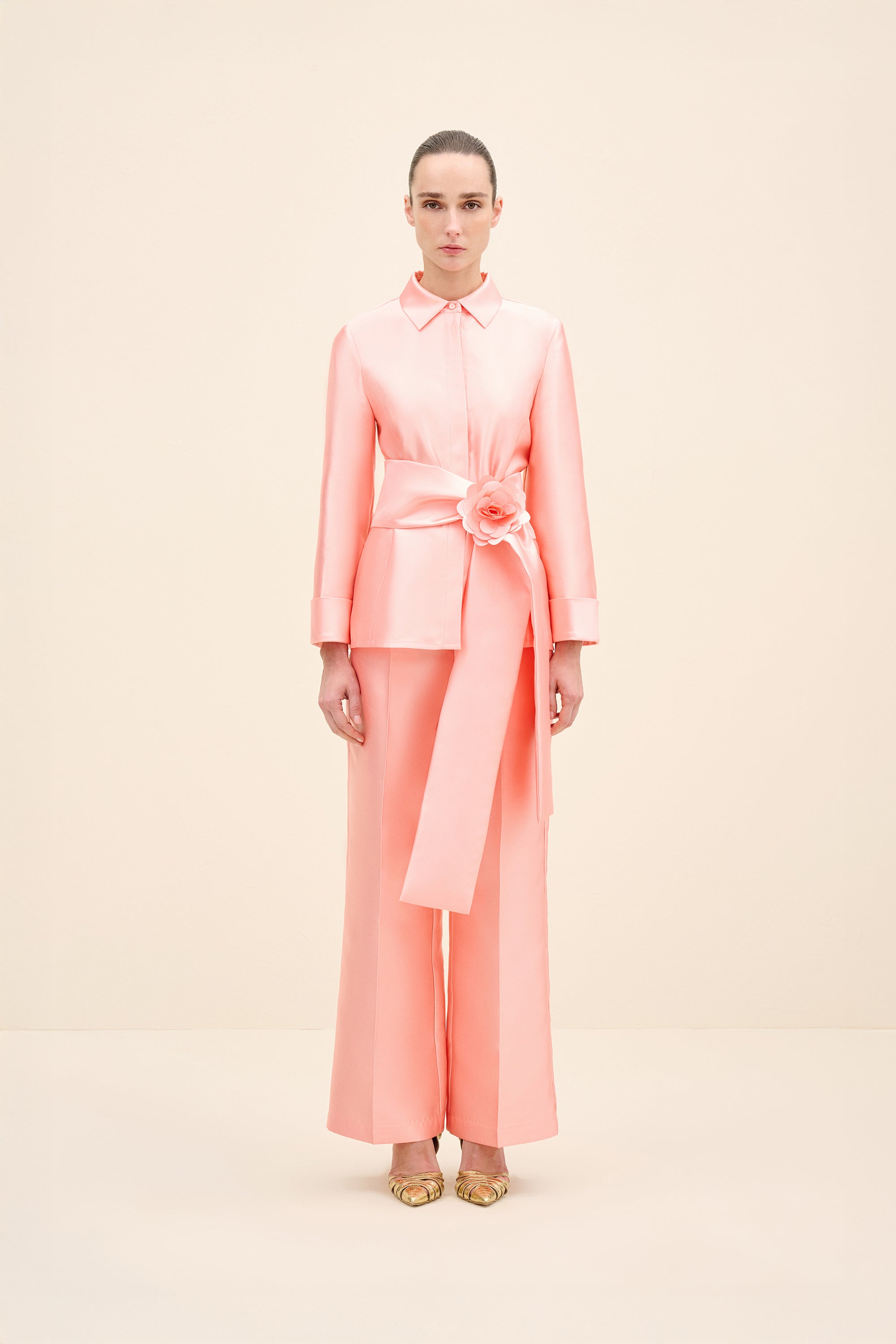 A clean, collared shirt in a pink tone. It features concealed front fastenings and a wrap waist tie, finished with a statement rosette for a polished, refined look.Styling Note: Wear it as a full look with tonal heels and minimal jewellery to let the rosette take focus. For day, switch to sleek flats and a low bun; for evening, add a metallic clutch and a bold lip.