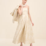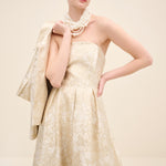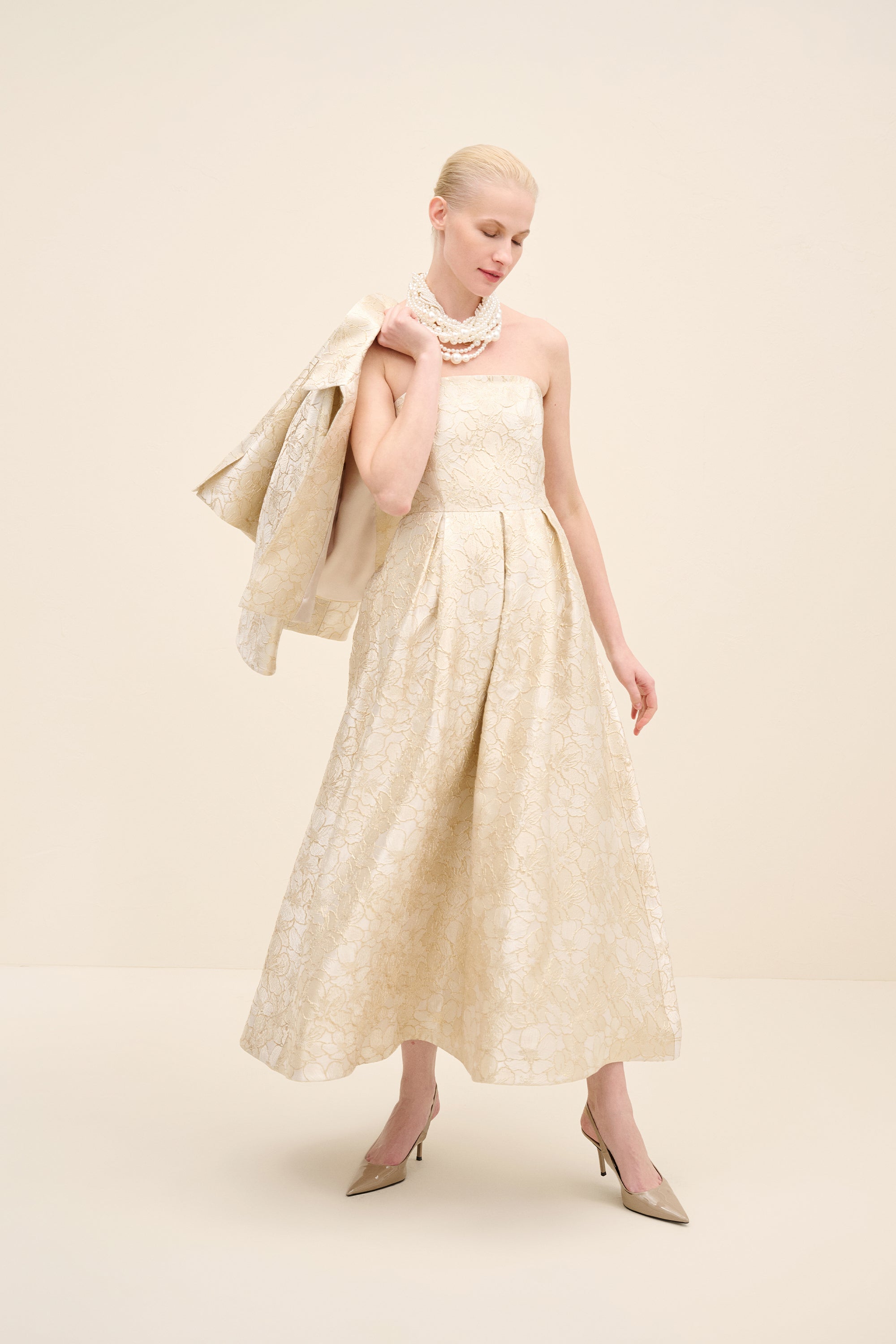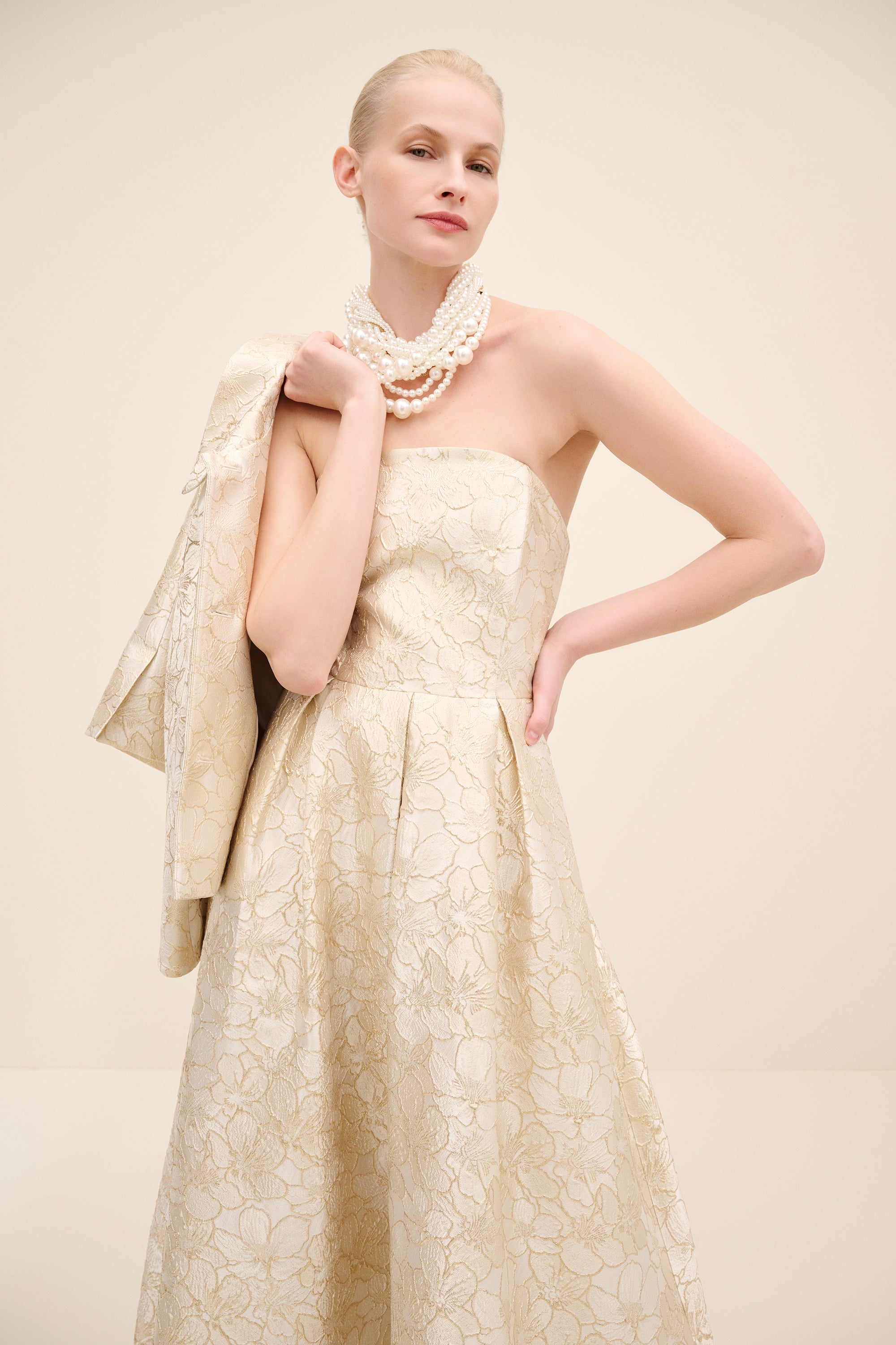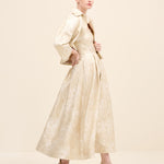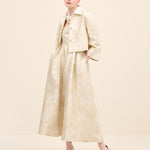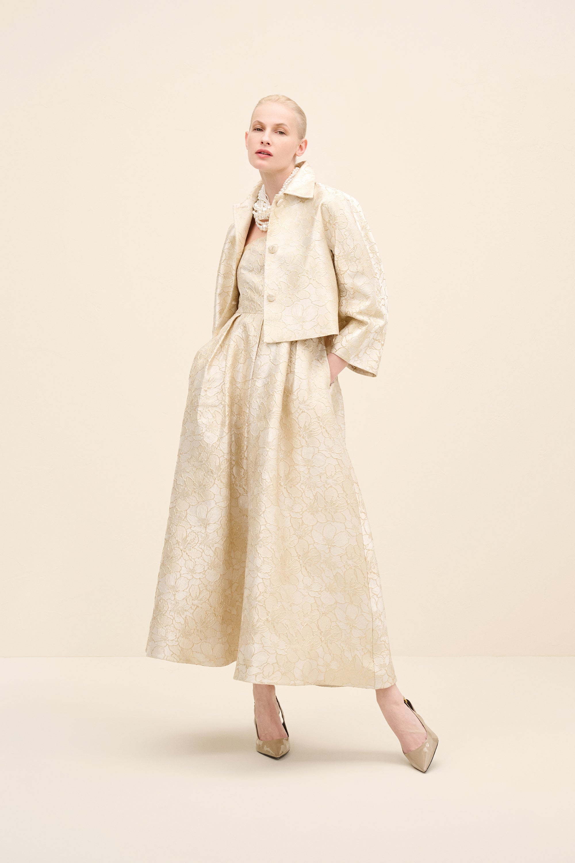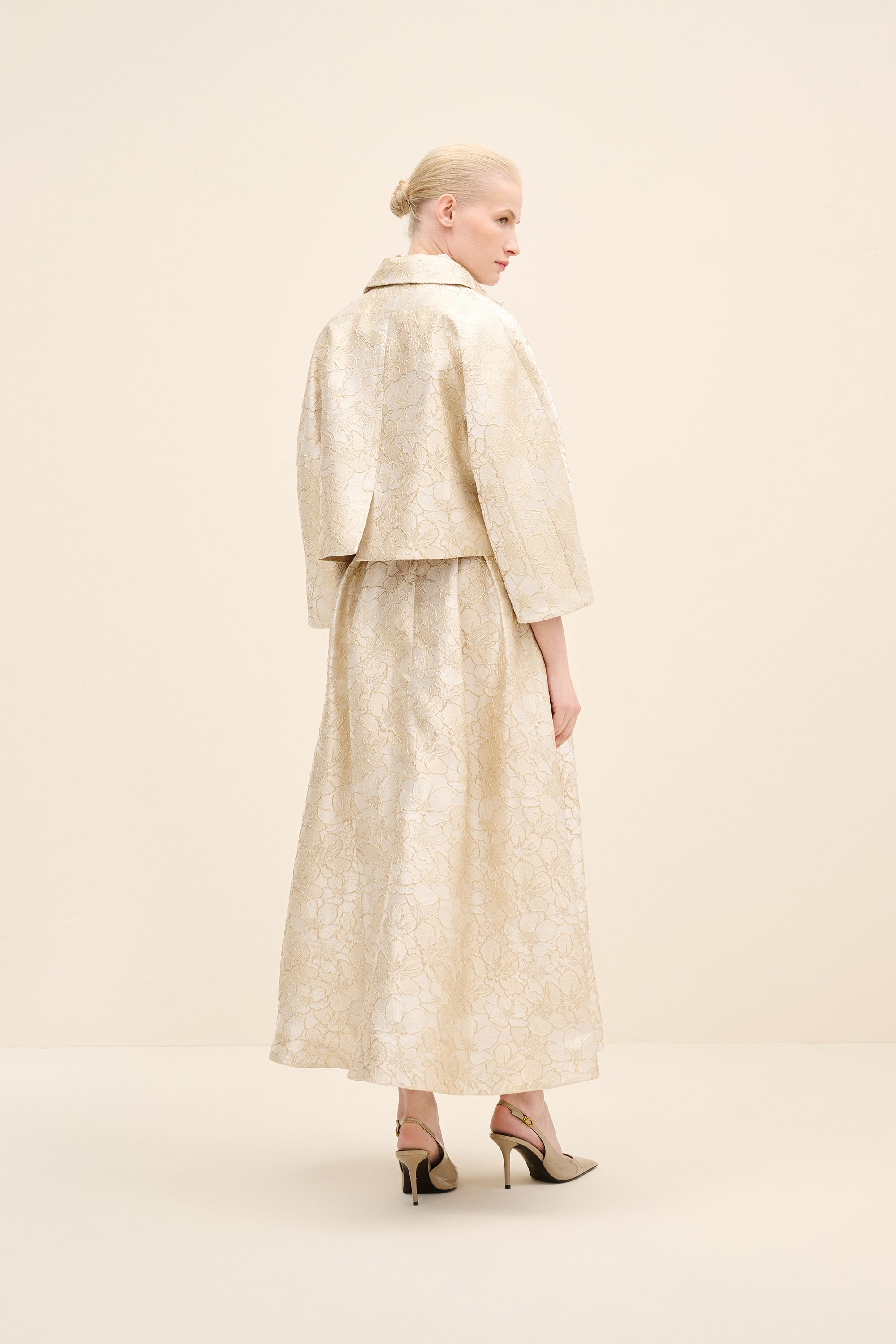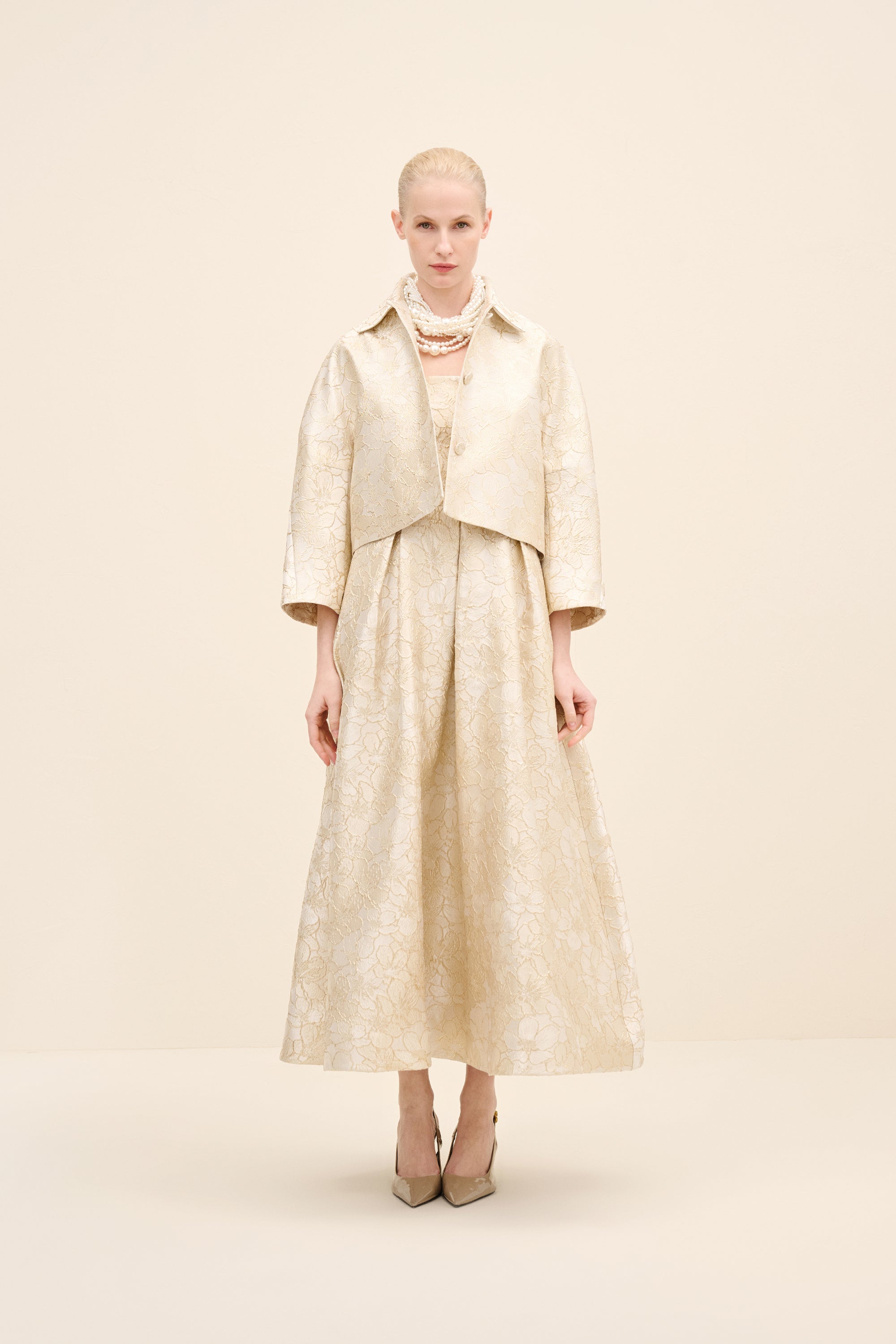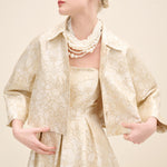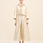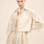 Tailored in coordinating champagne jacquard, this cropped jacket redefines classic tailoring with modern proportion. the clean collar and wide sleeves create a sculptural silhouette, while covered buttons maintain refined continuity.
