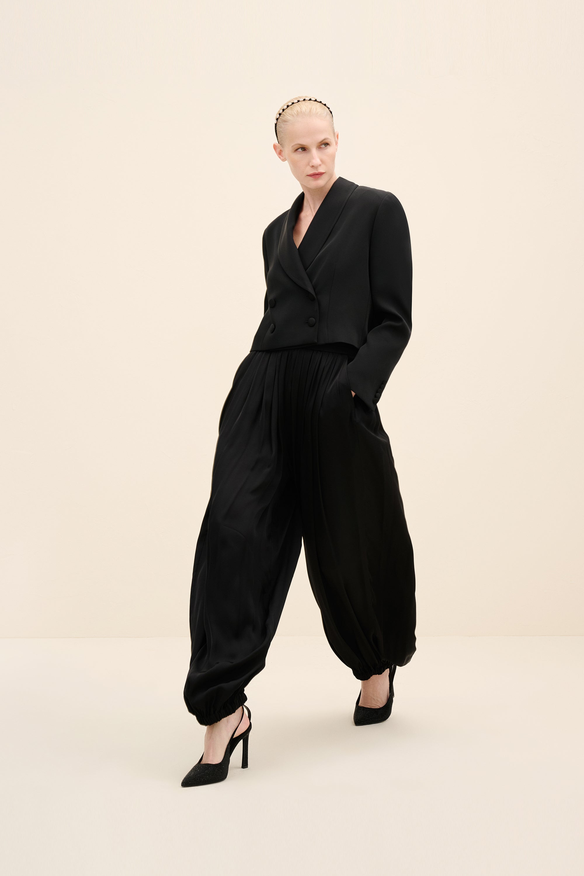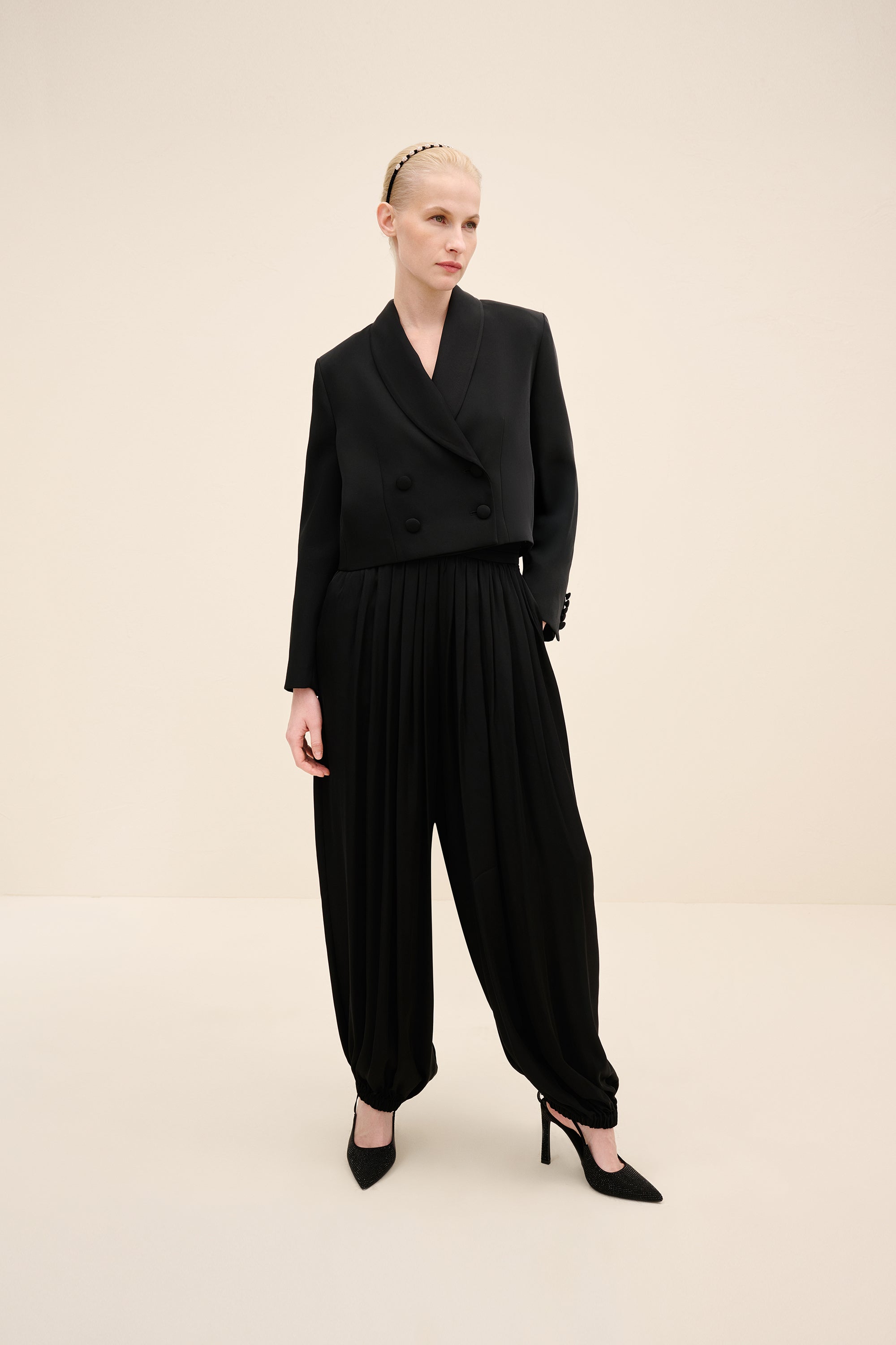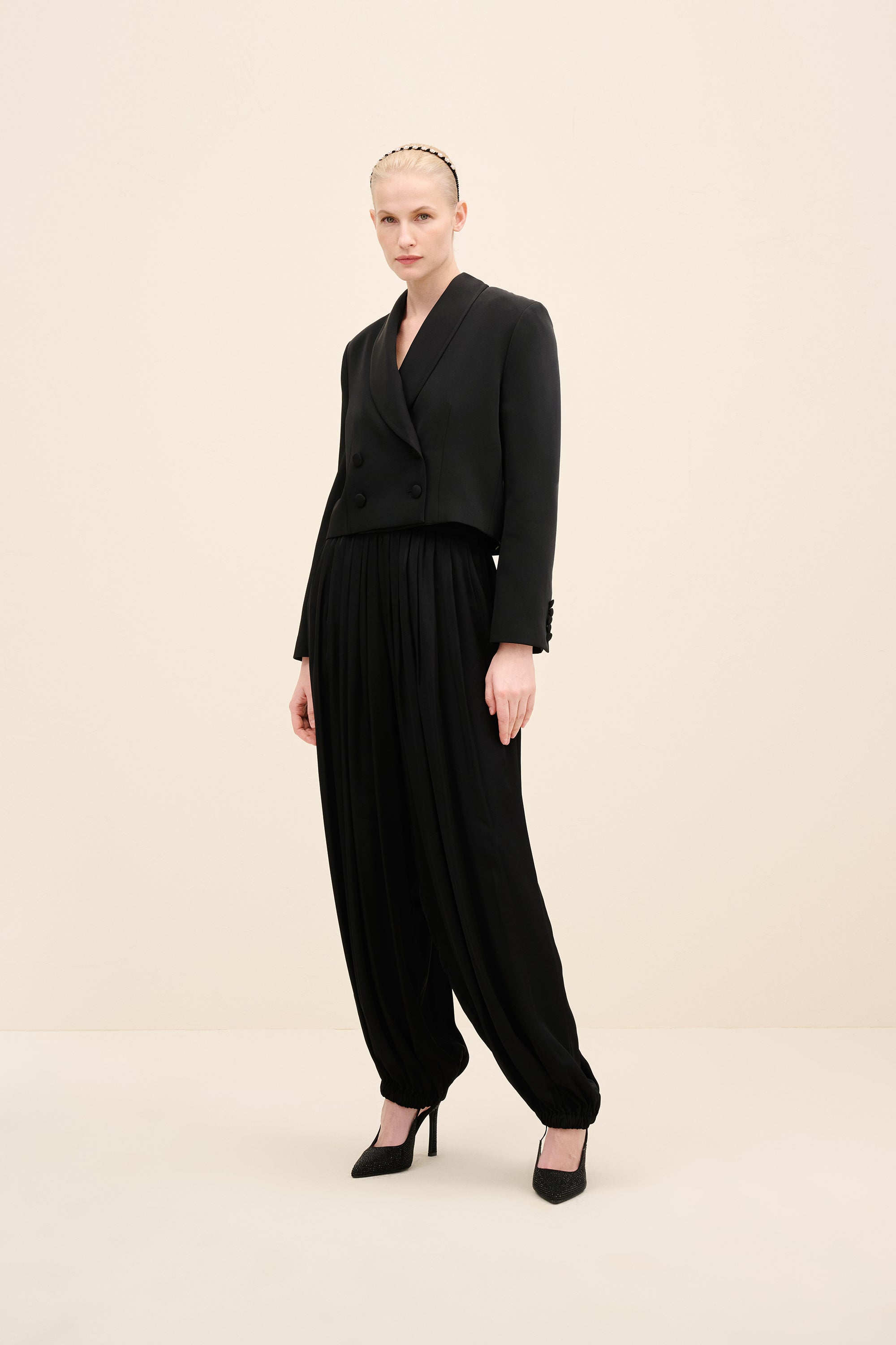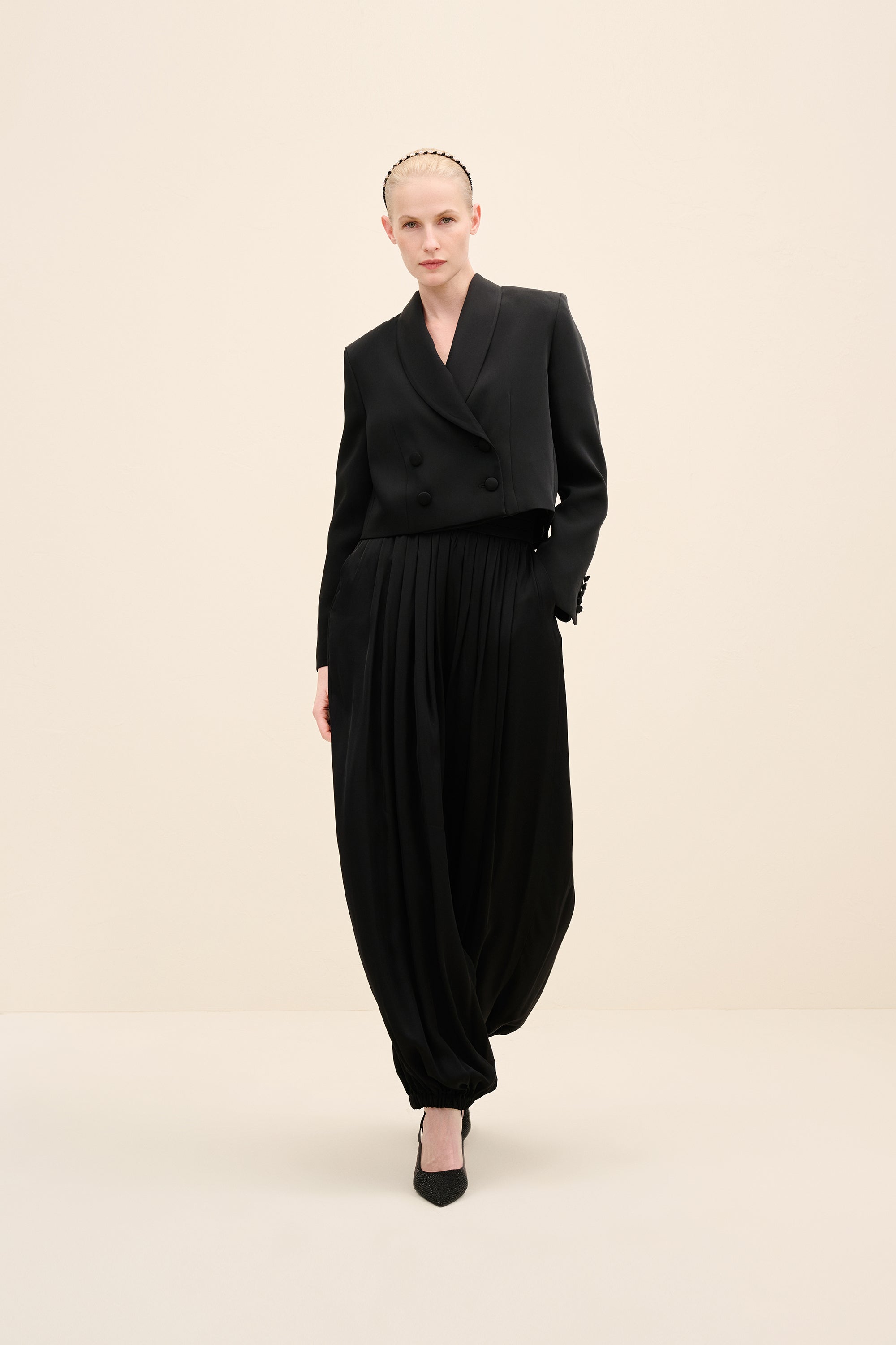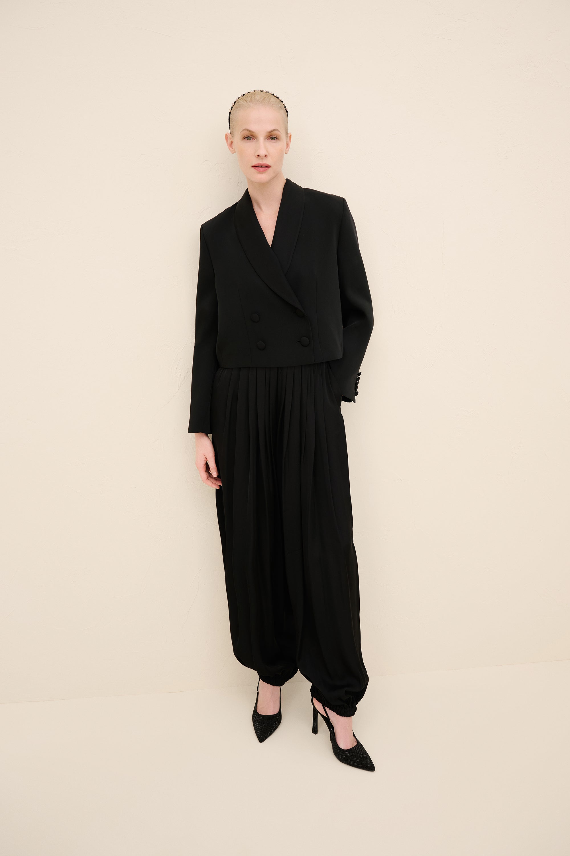 Styling Notes : Style with the coordinating harem trousers for a directional monochrome look. for evening, layer over a silk camisole and add pointed pumps to elongate the silhouette. by day, temper the tailoring with flat leather loafers and minimal gold jewelry for understated polish.