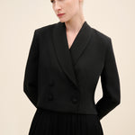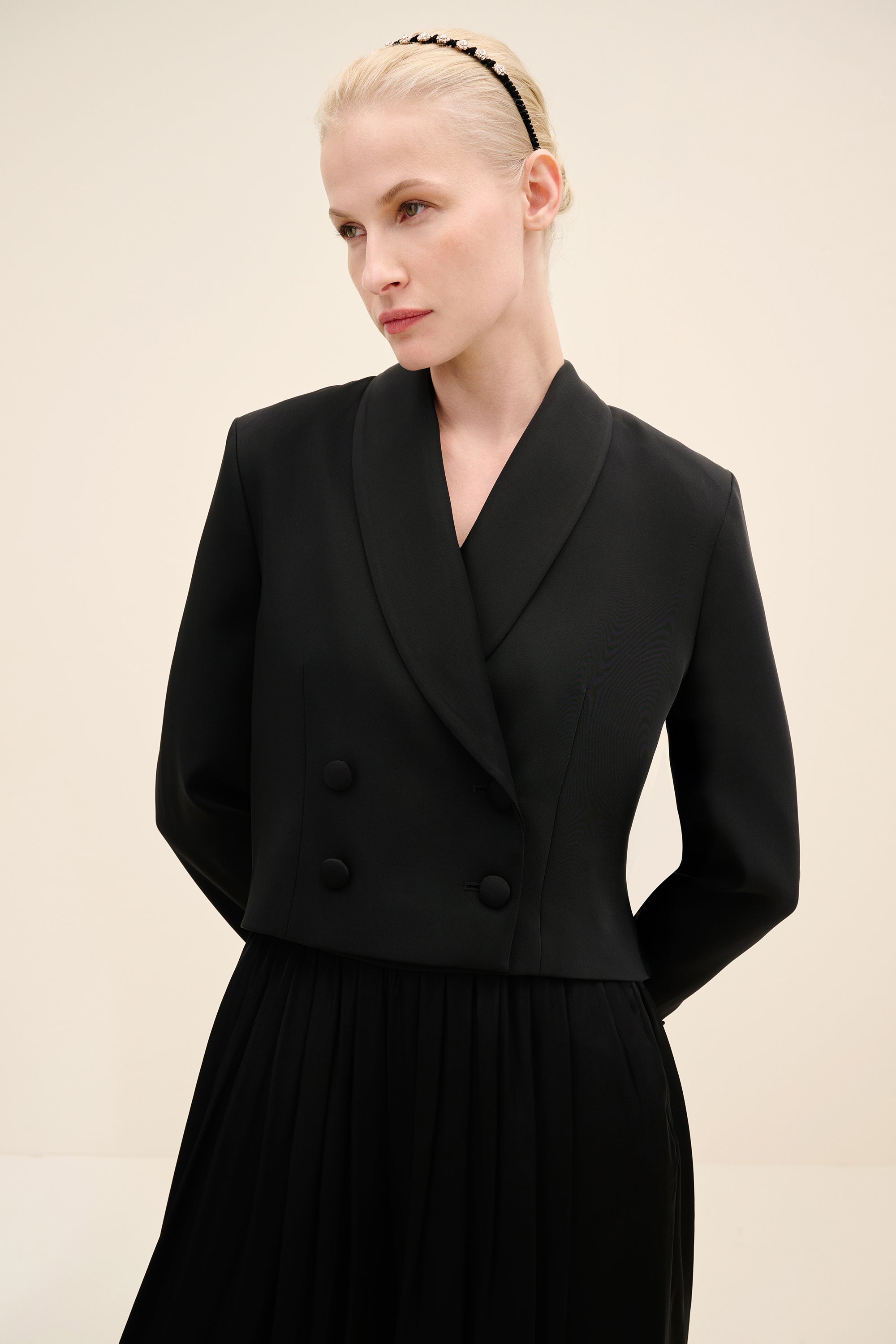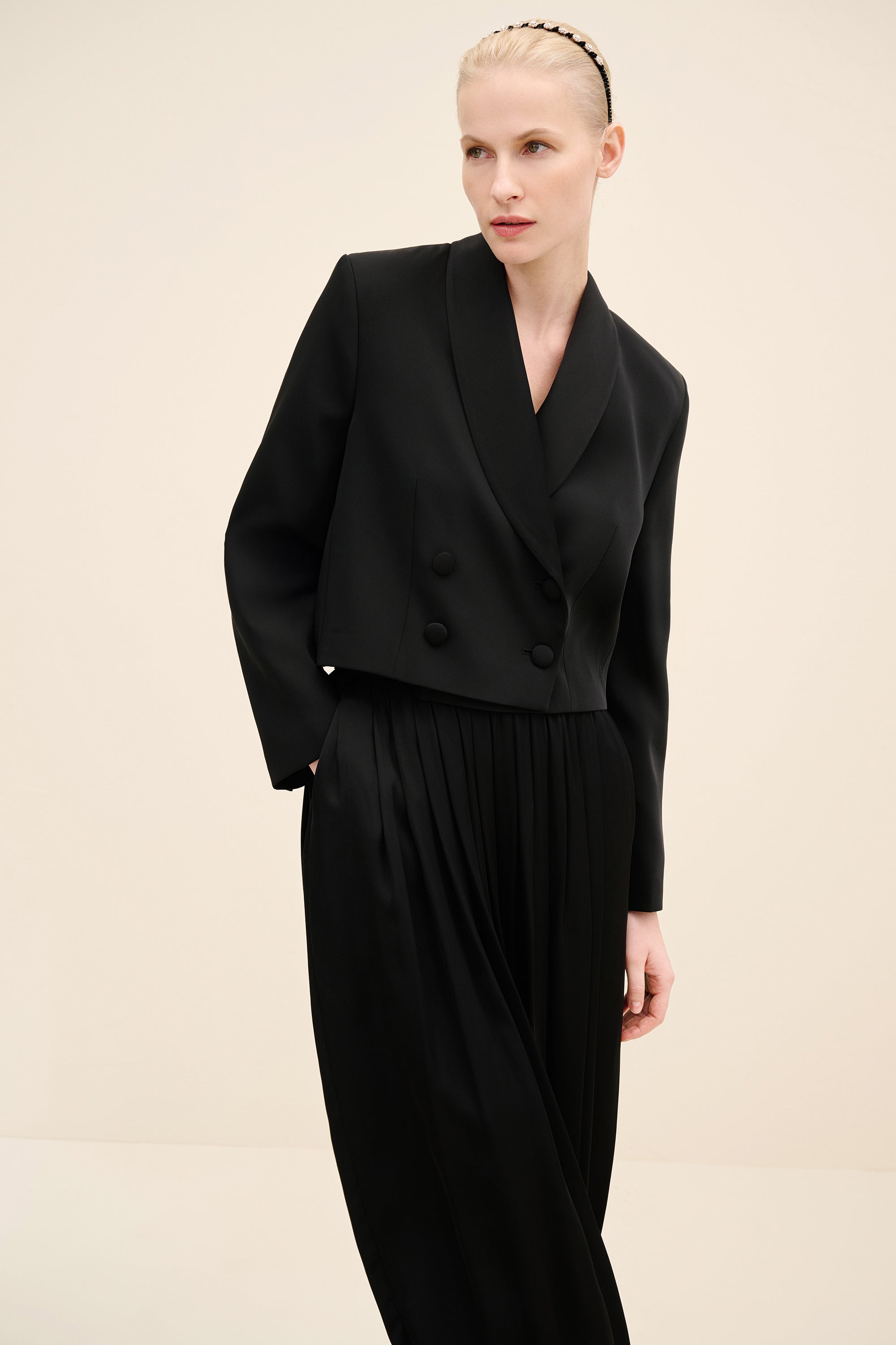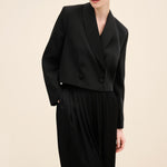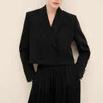 Tailored with a modern, sculptural sensibility, this cropped jacket is cut from a smooth wool-blend with a softly structured finish. designed in a double-breasted silhouette, it features wide shawl lapels and tonal covered buttons for a refined, uninterrupted look. the cropped length balances sharp tailoring with contemporary proportions, making it the perfect partner to high-waisted trousers. fully lined for a seamless fit, it transitions effortlessly from day to evening styling.