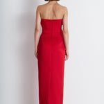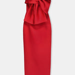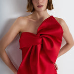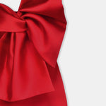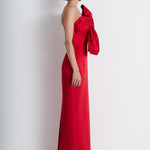Striking red maxi dress defined by its sculptural oversized bow detail at the bodice. Sleek and feminine, this bold design is made for evening galas and glamorous events.