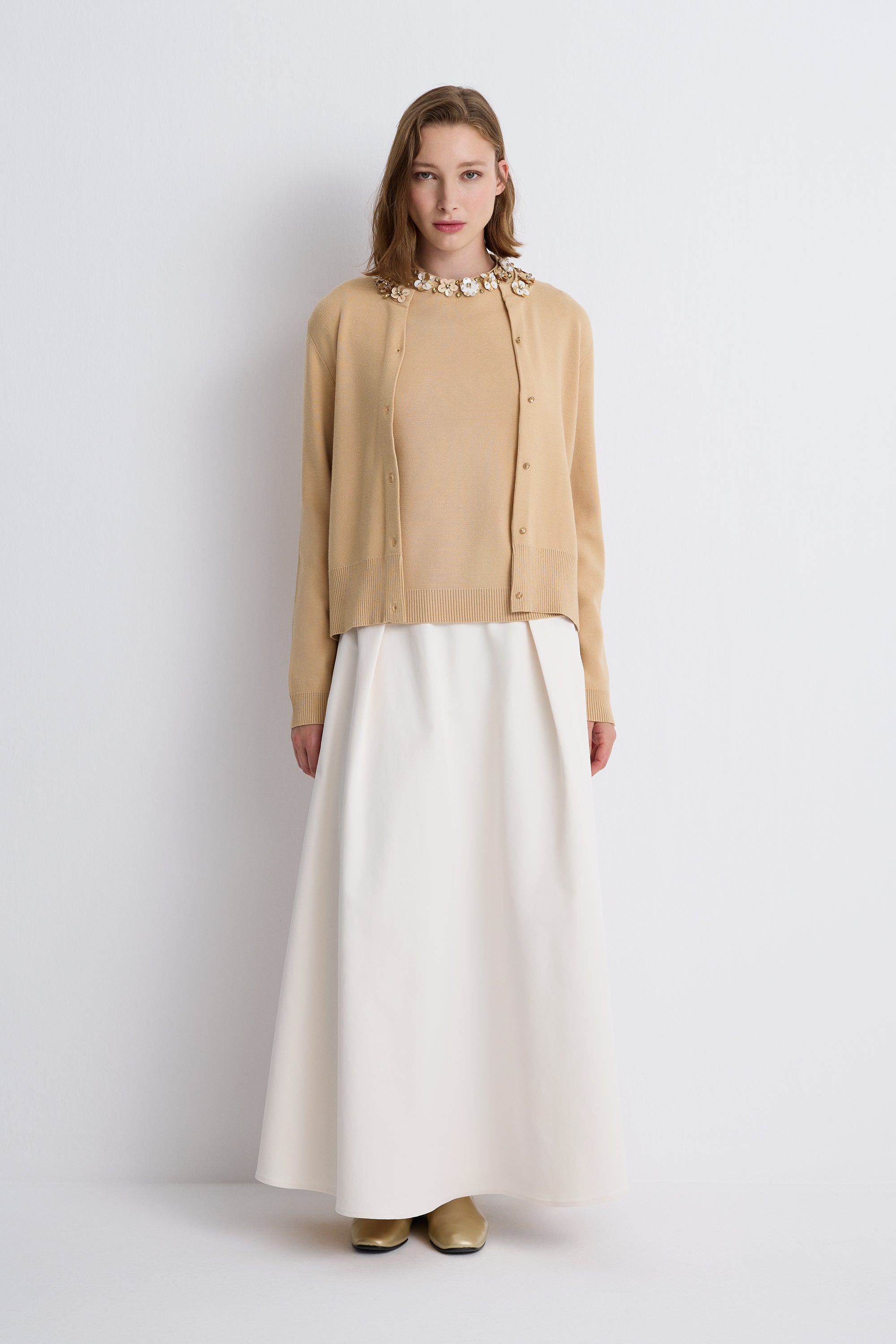 Nean Embellished Neckline Tricot Cardigan Beige