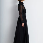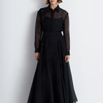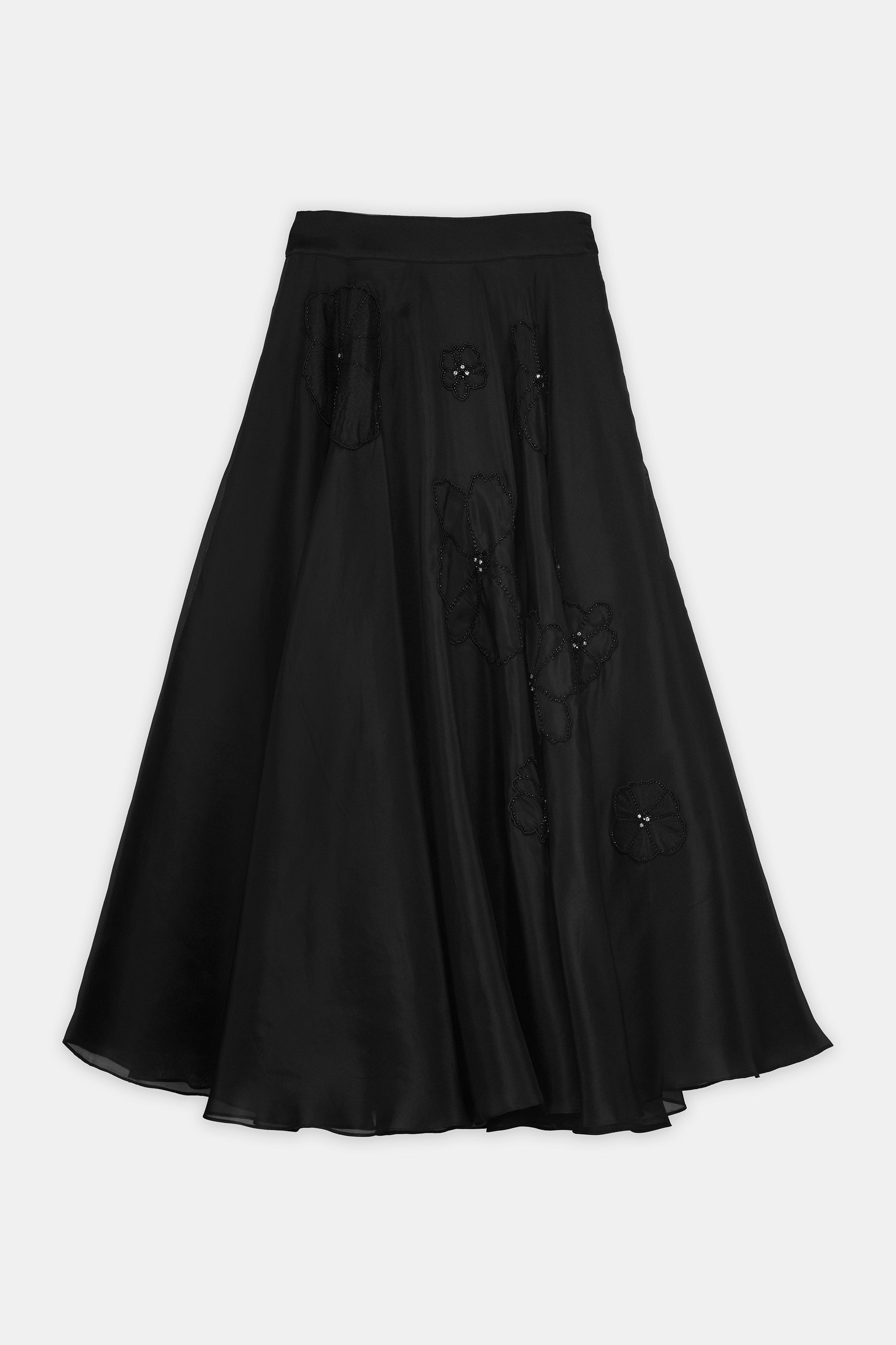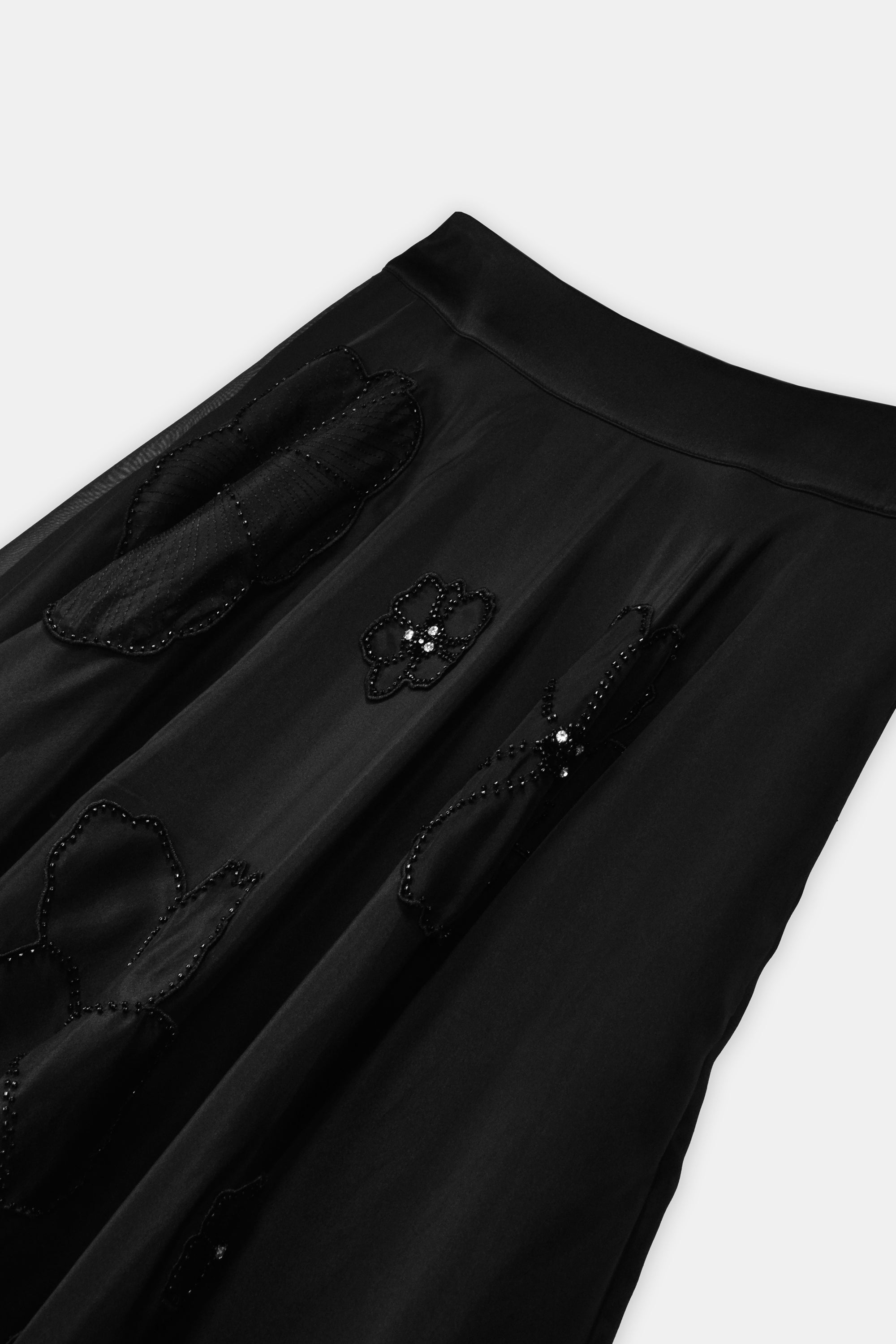 An Elegant Black Maxi Skirt Crafted From Chiffon And Adorned With Delicate Bead And Sequin Floral Embellishments. With Its Flowing Silhouette And Graceful Drape, This Skirt Is A Standout Piece For Evening Occasions And Formal Styling.