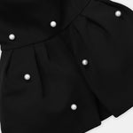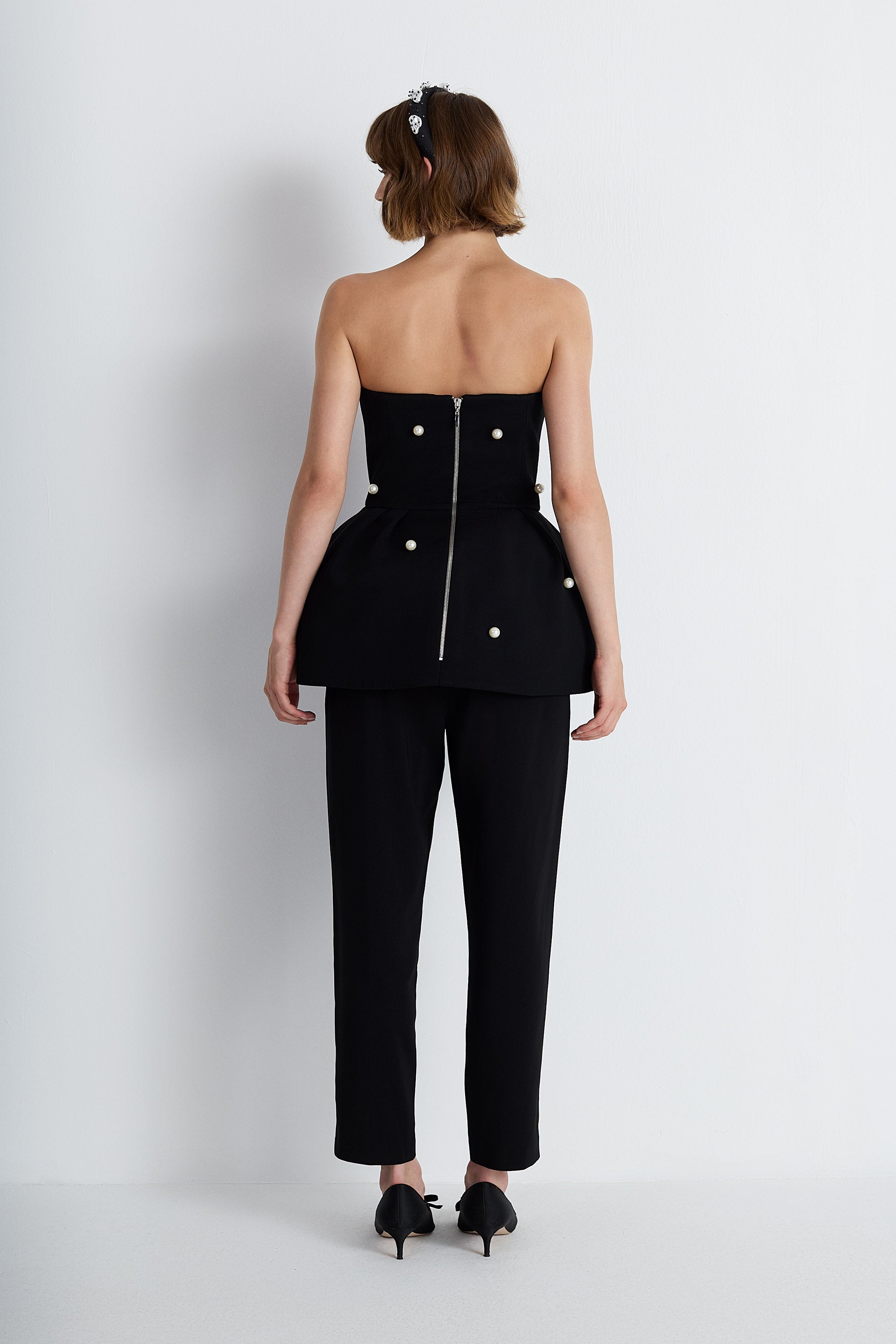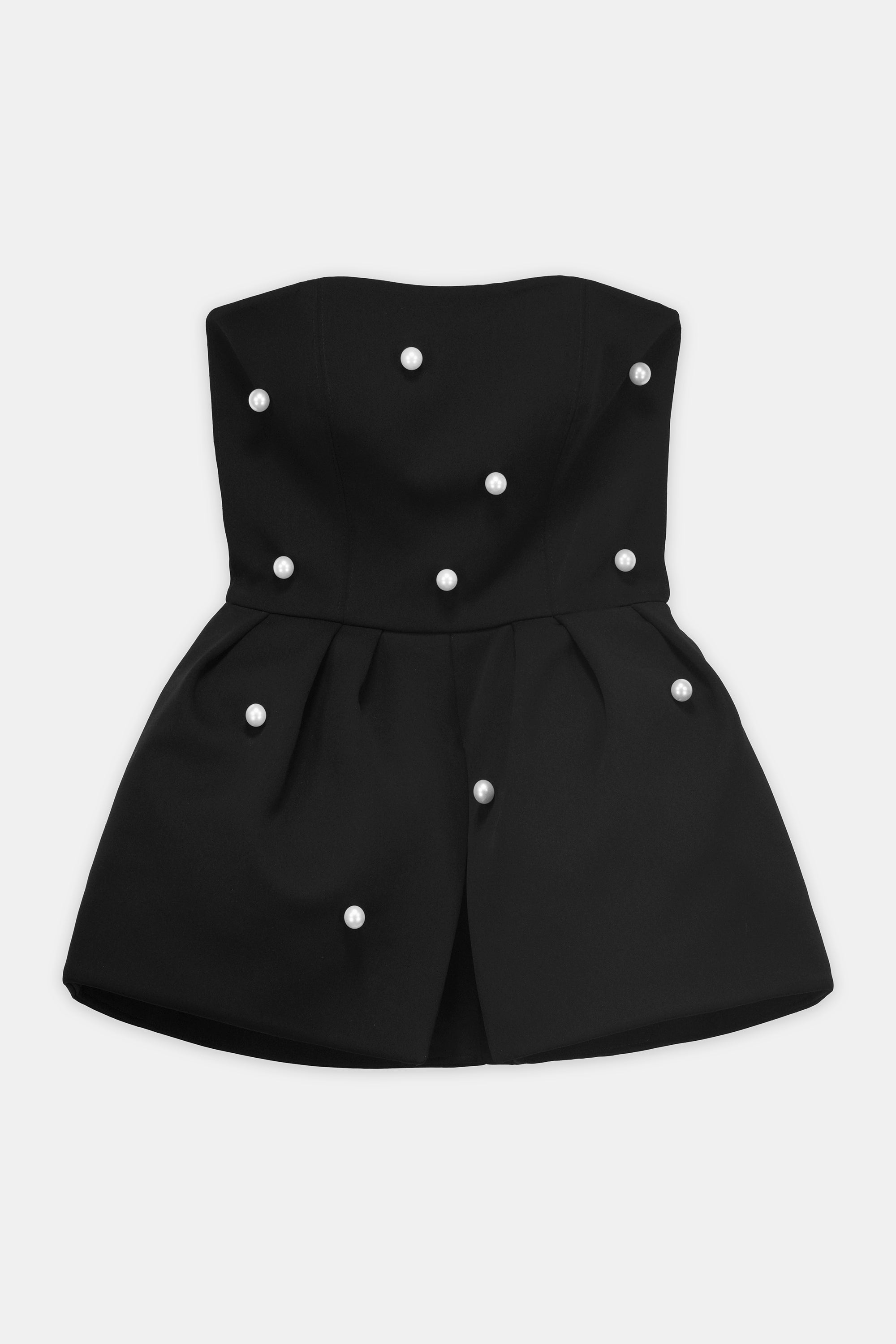An Elegant Strapless Black Top Adorned With Scattered Pearl Embellishments, Blending Timeless Femininity With Modern Sophistication.