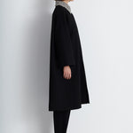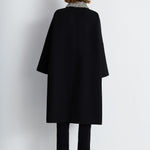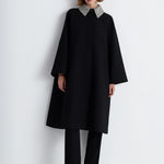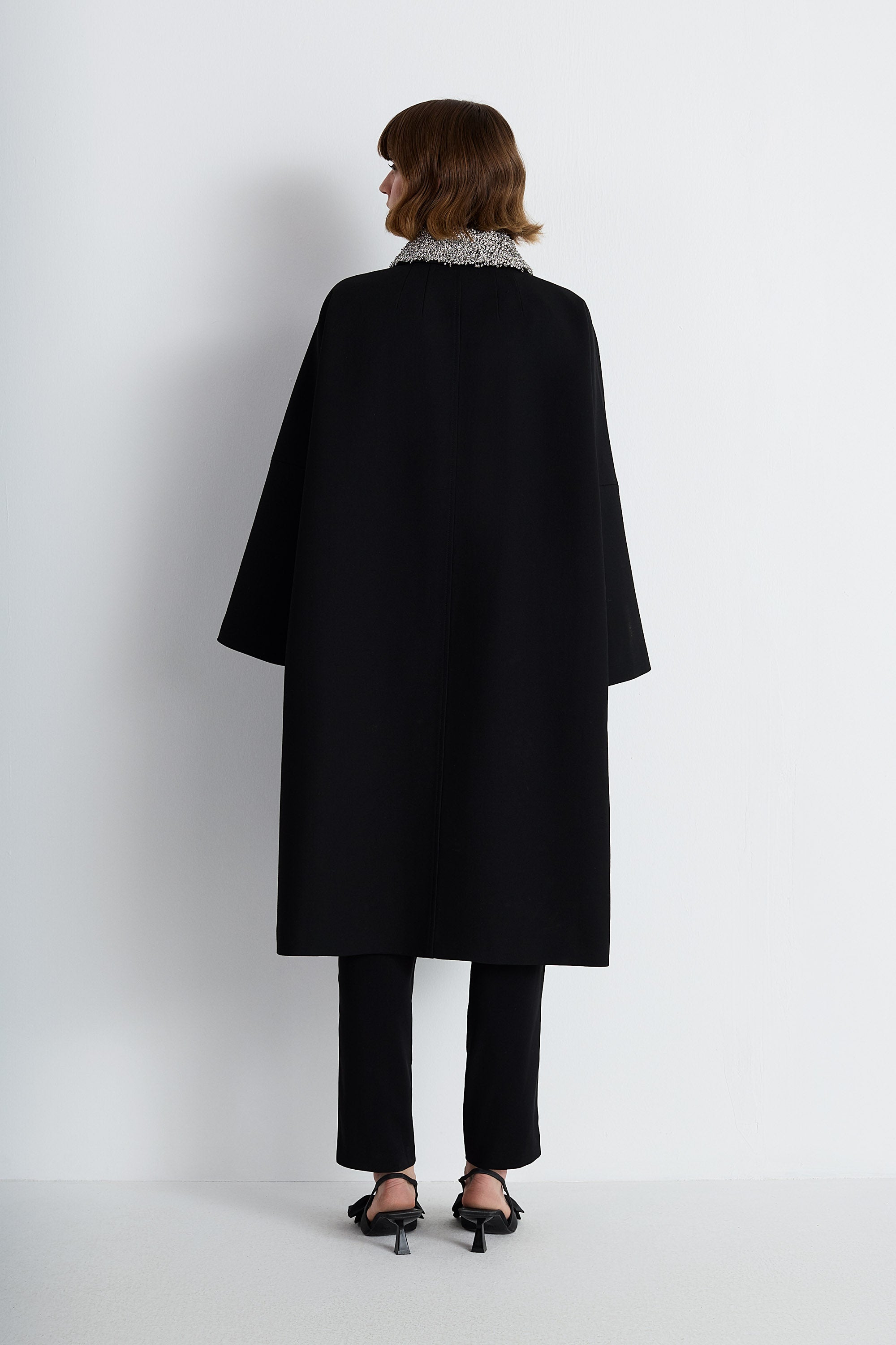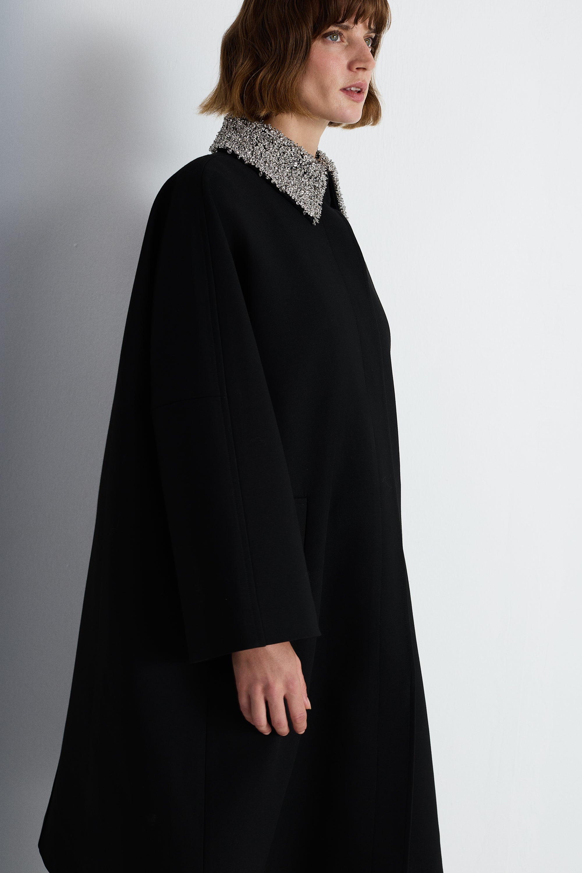 A Refined Black Coat Designed With A Voluminous A-Line Silhouette And Statement Crystal-Embellished Collar. Featuring Wide Sleeves And A Concealed Front Closure, This Piece Combines Understated Elegance With Striking Detail. Perfect For Evening Occasions Or Elevating Everyday Outerwear With A Touch Of Glamour.