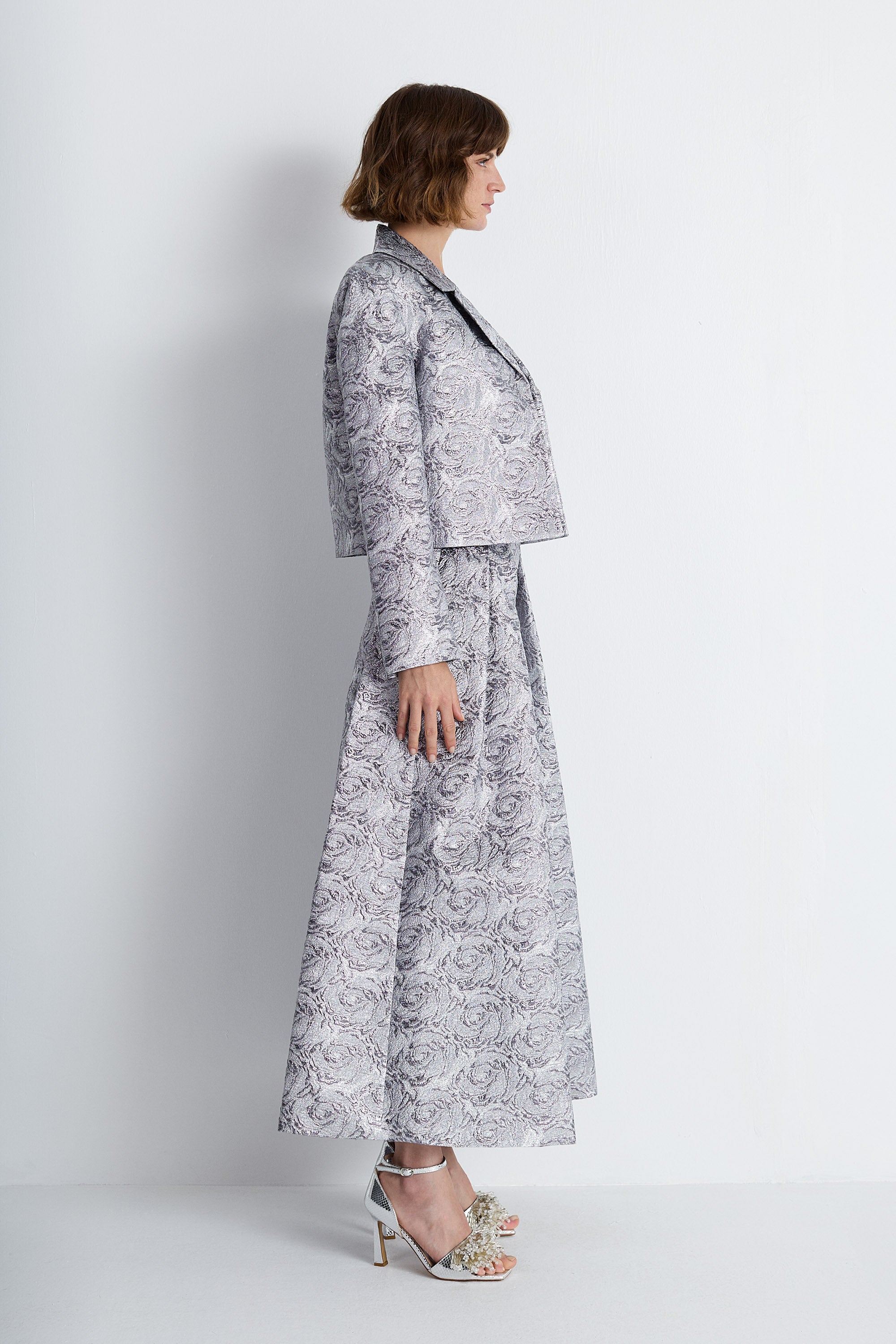 This Cropped Tailored Jacket In Silver Brocade Brings An Air Of Timeless Sophistication With A Modern Twist. The Structured Silhouette And Metallic Floral Texture Add Elegance, Making It Perfect As A Set With The Matching Brocade Skirt And Top, Or Styled Separately With Solid Hues. A Versatile Piece Designed To Elevate Evening Looks And Formalwear.