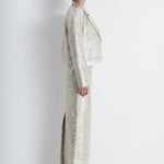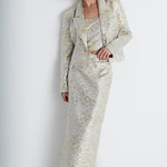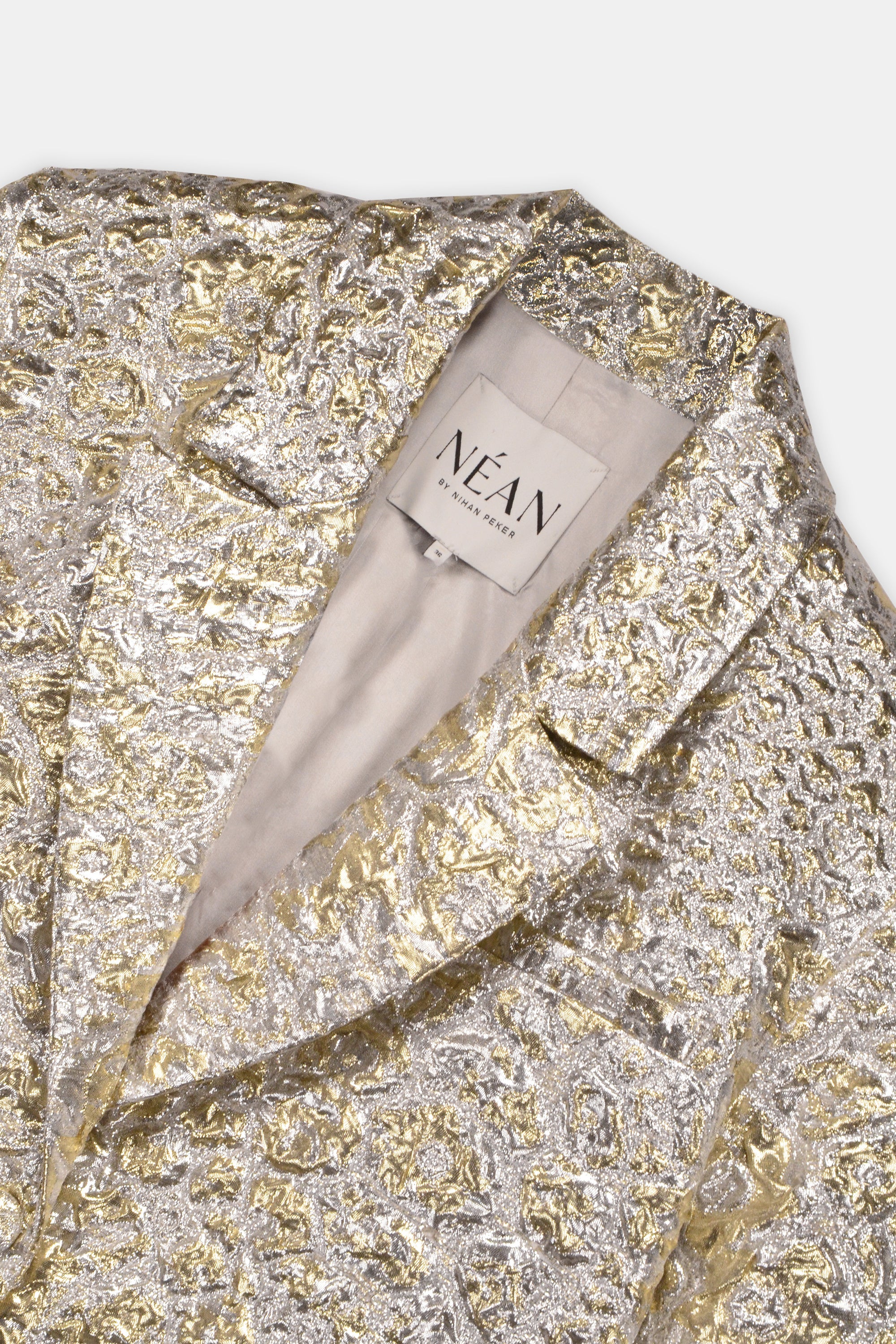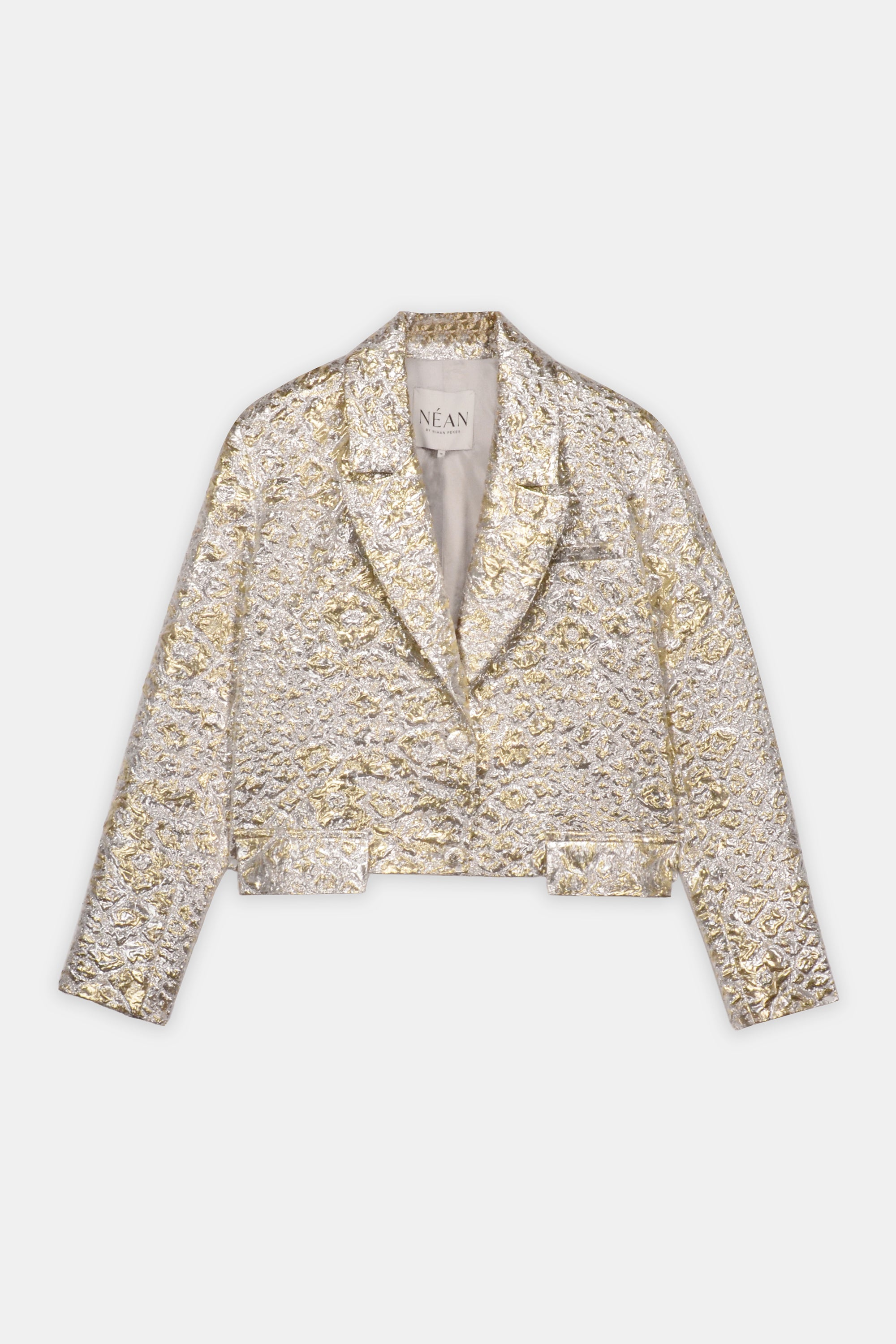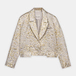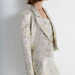 A Sophisticated Cropped Blazer Crafted From Shimmering Metallic Jacquard. The Tailored Fit And Sharp Lapels Add Modern Elegance, Making It The Perfect Layering Piece Over The Matching Jacquard Set Or Styled With Sleek Trousers For Evening Sophistication