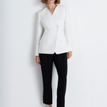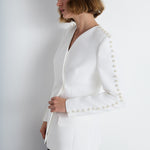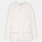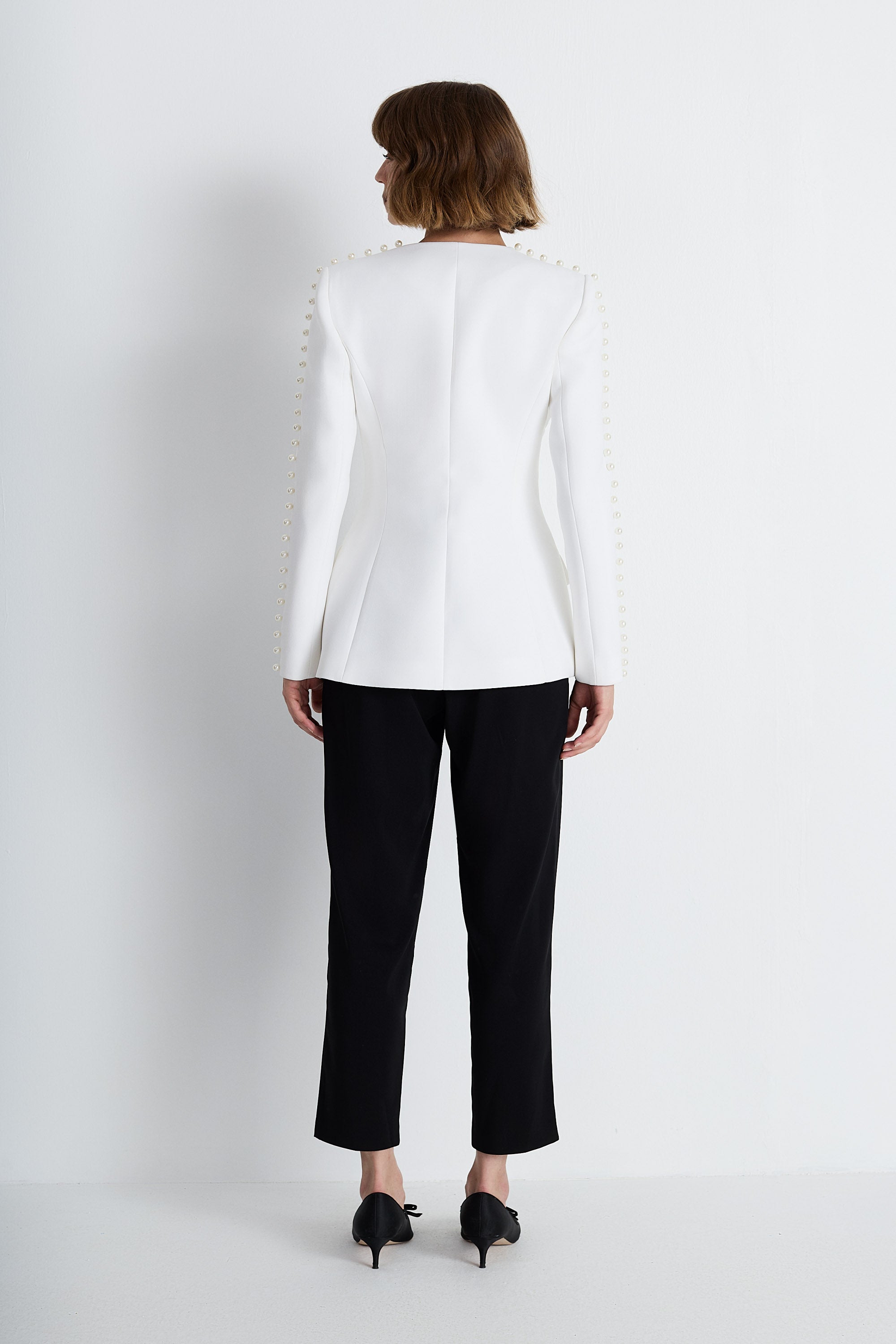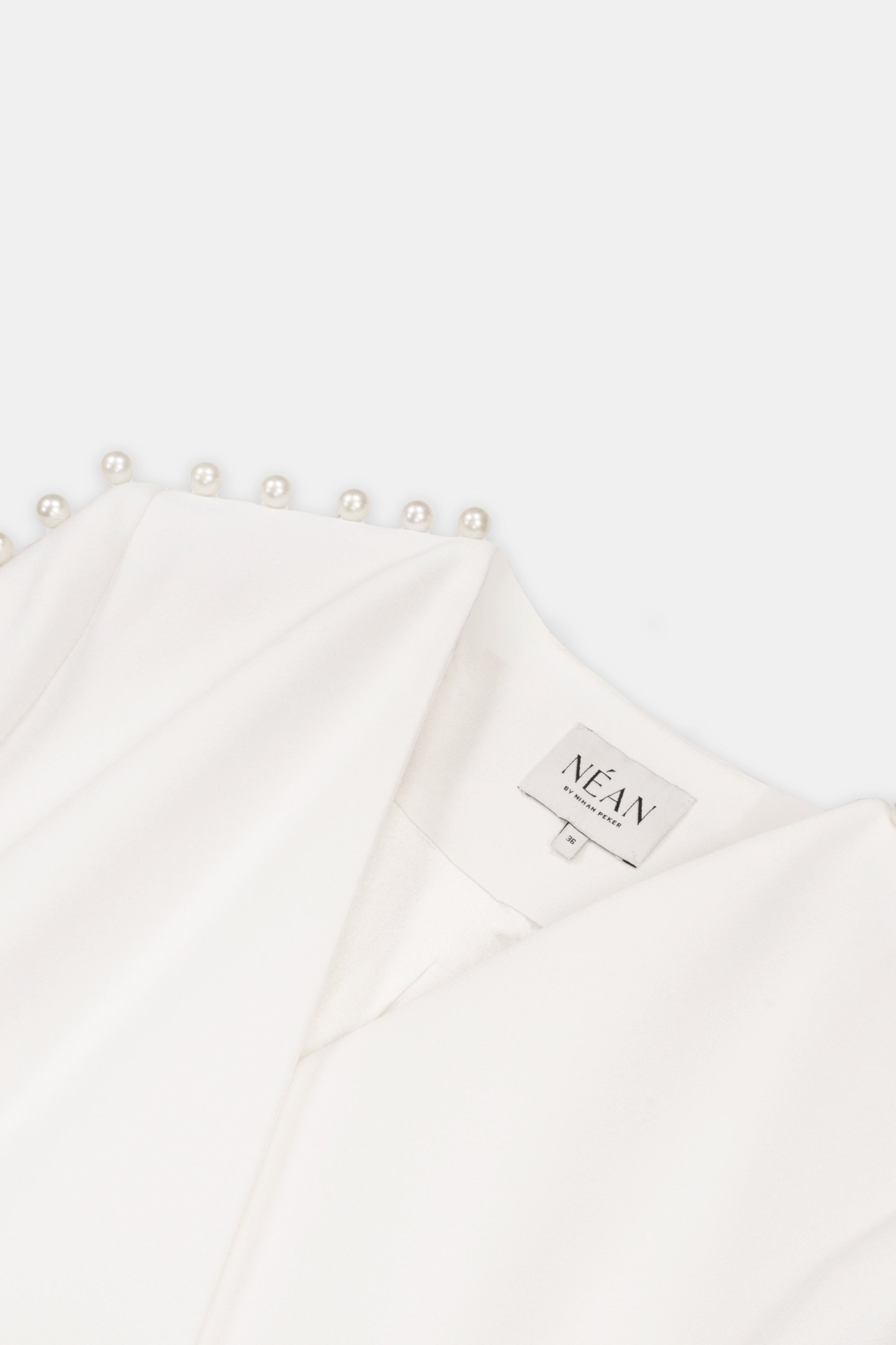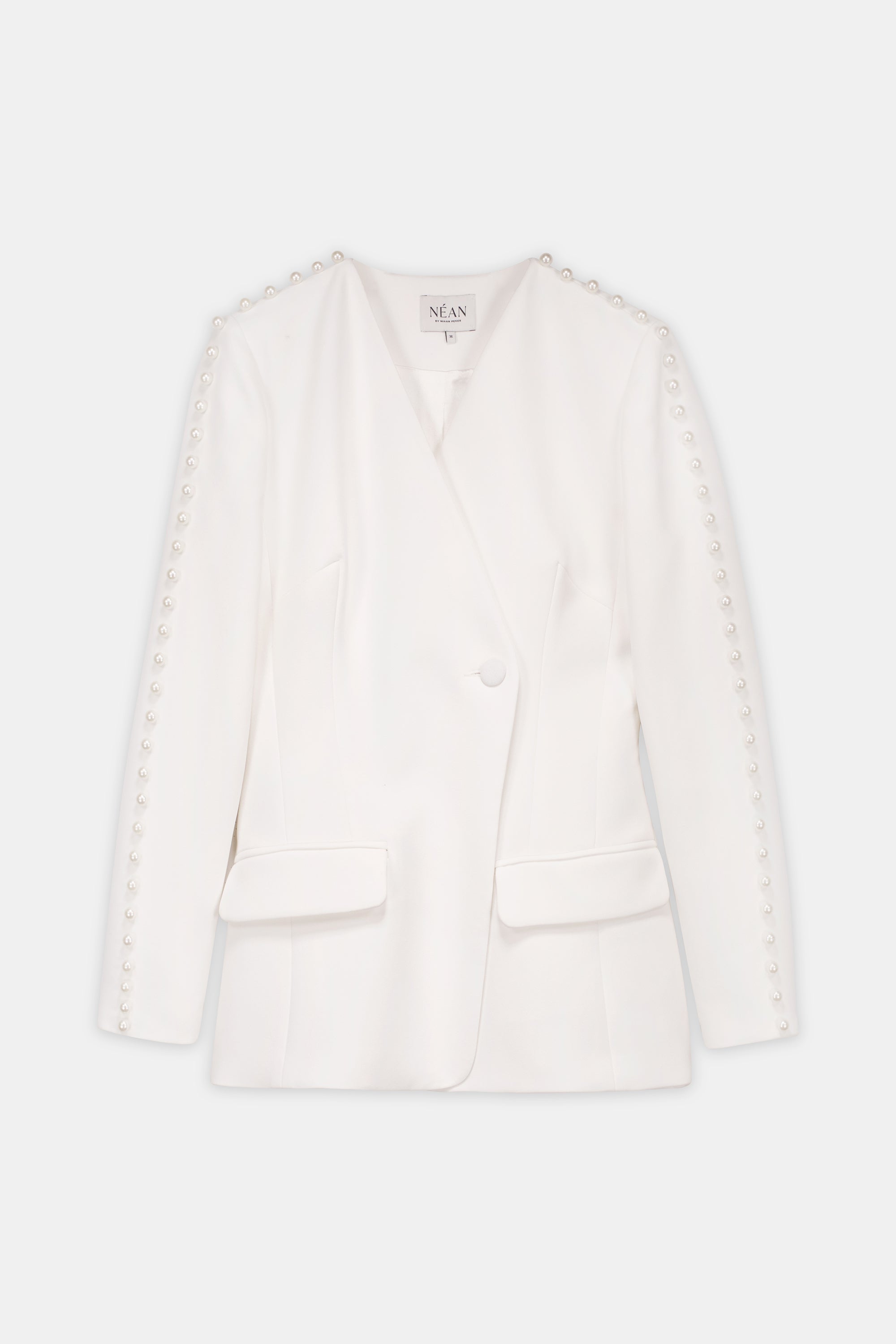 Elevate Your Wardrobe With This Statement White Blazer Featuring An Elegant Asymmetric Neckline And A Single-Button Closure. Designed With Sharp Tailoring And Flap Pockets, It Offers A Modern Yet Timeless Silhouette. The Standout Detail Lies In The Delicate Pearl Trim Running Along The Shoulders And Sleeves, Adding A Sophisticated Touch Of Femininity. Perfect For Evening Occasions, Formal Events, Or Effortlessly Chic Daywear, This Blazer Combines Classic Tailoring With Contemporary Elegance.