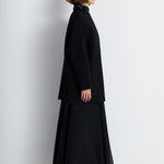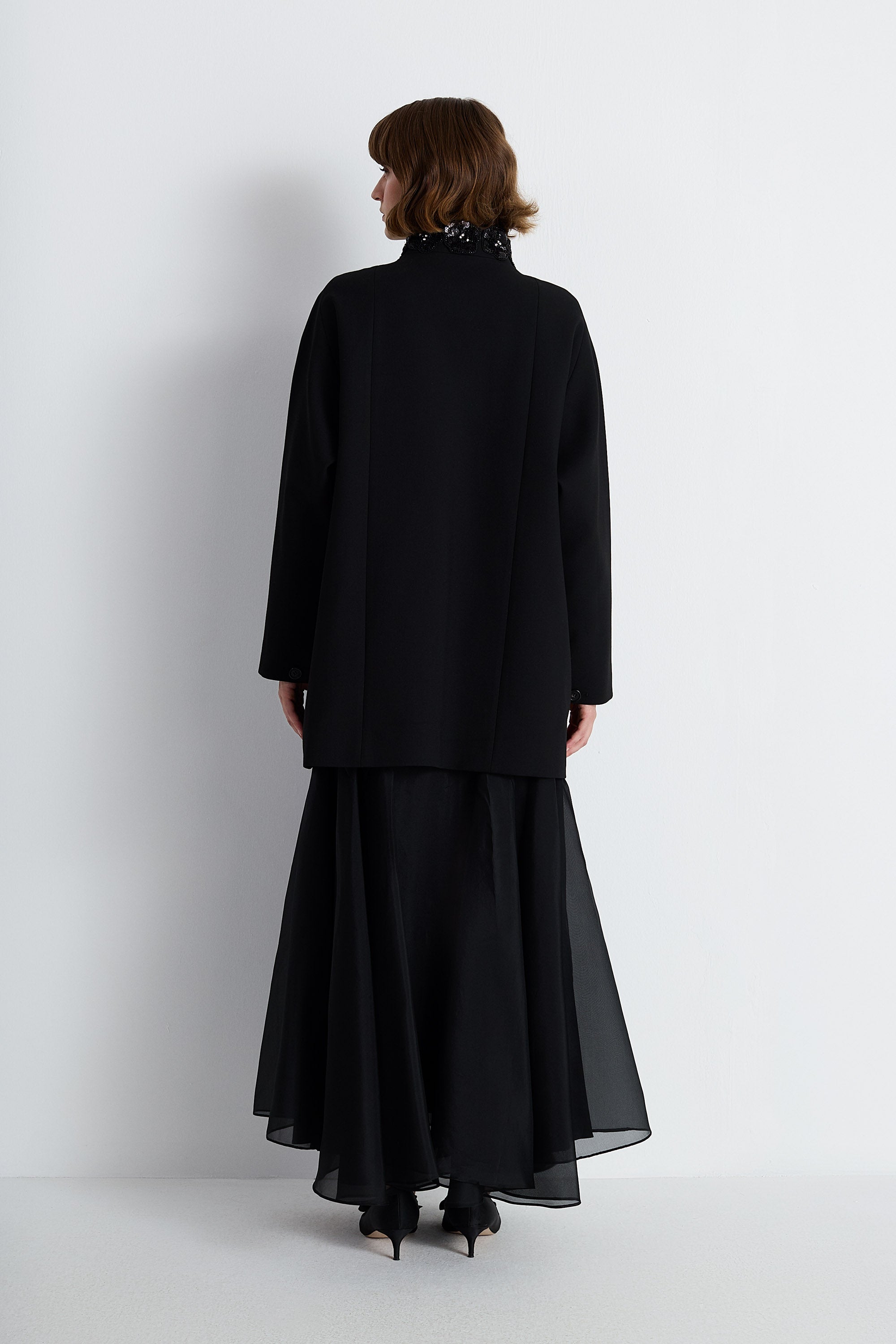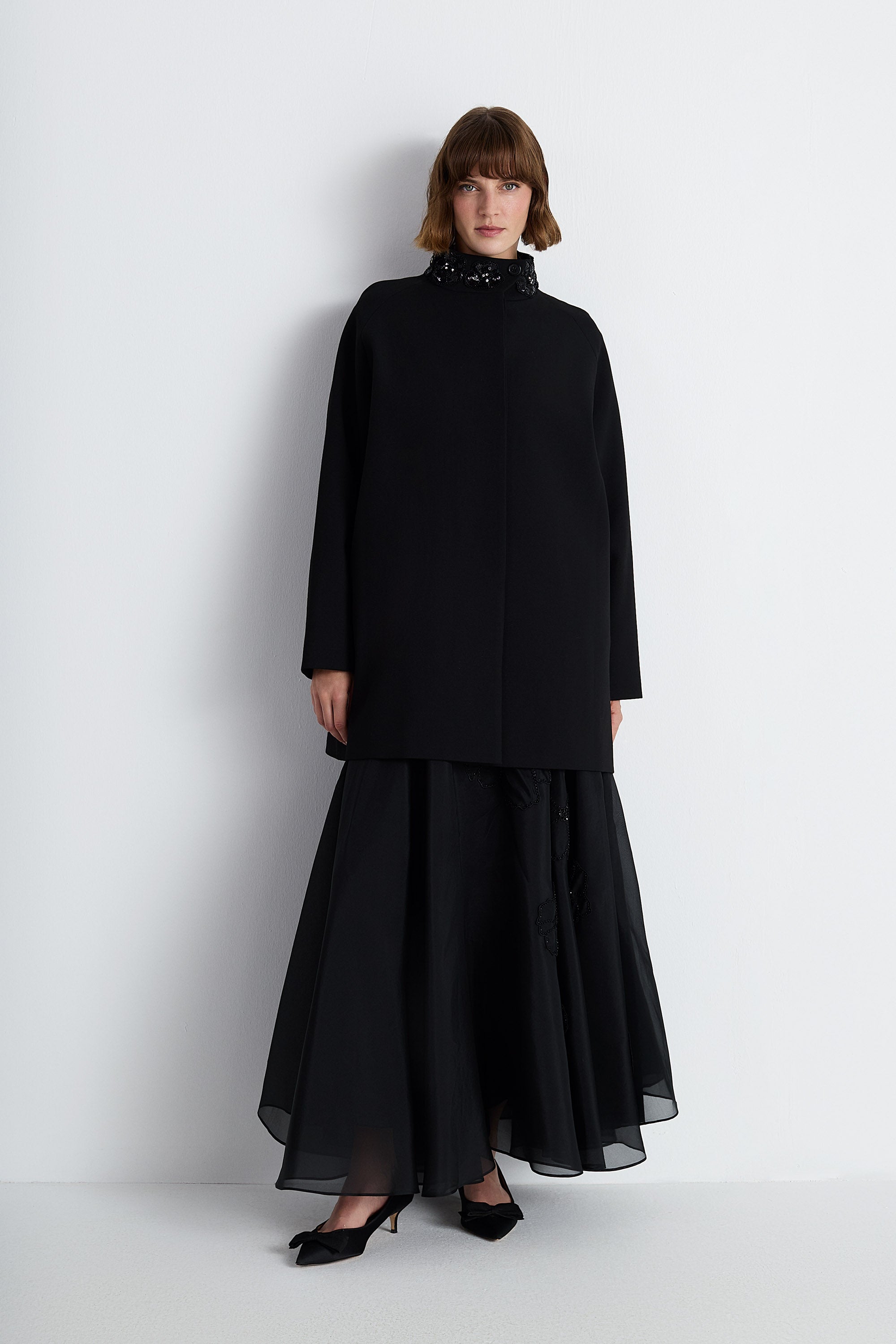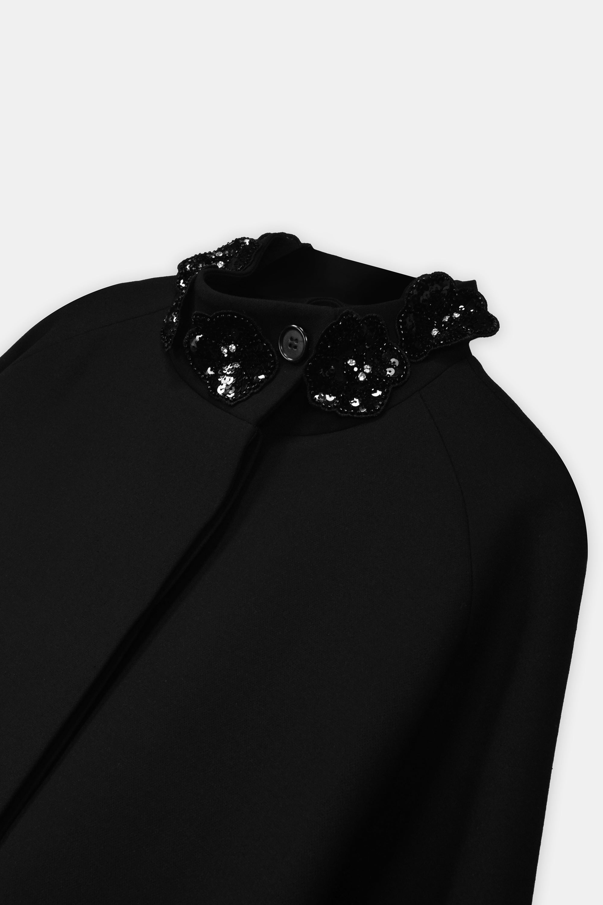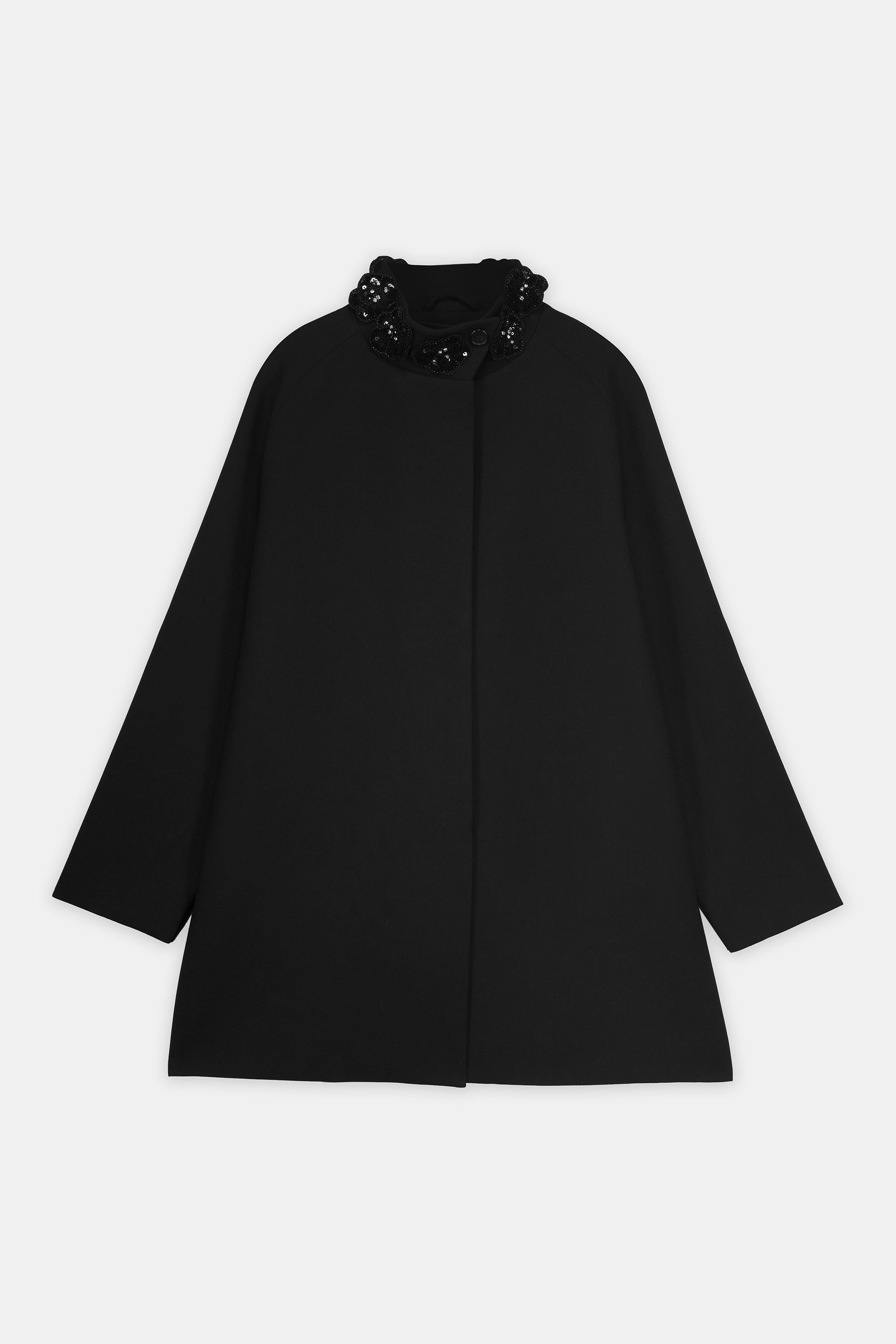 A Chic Short Coat In Black, Defined By Its Bead And Sequin-Embellished High Collar. With Its Clean A-Line Cut And Concealed Closure, This Coat Offers A Sophisticated Balance Of Elegance And Everyday Wearability. Ideal For Both Formal Styling And Refined Day Looks.